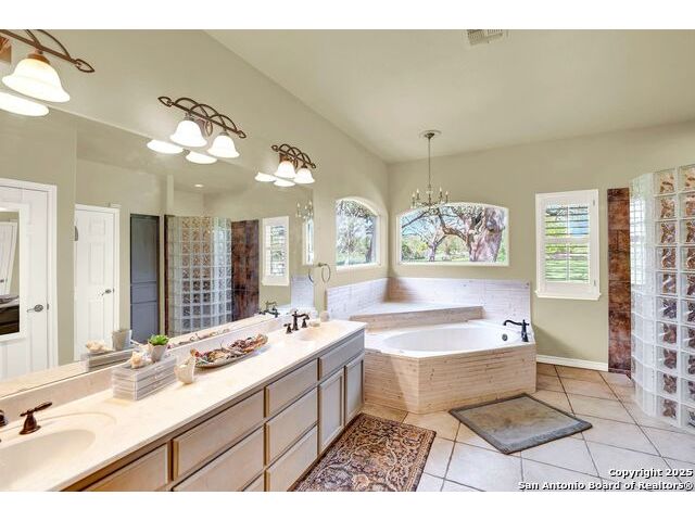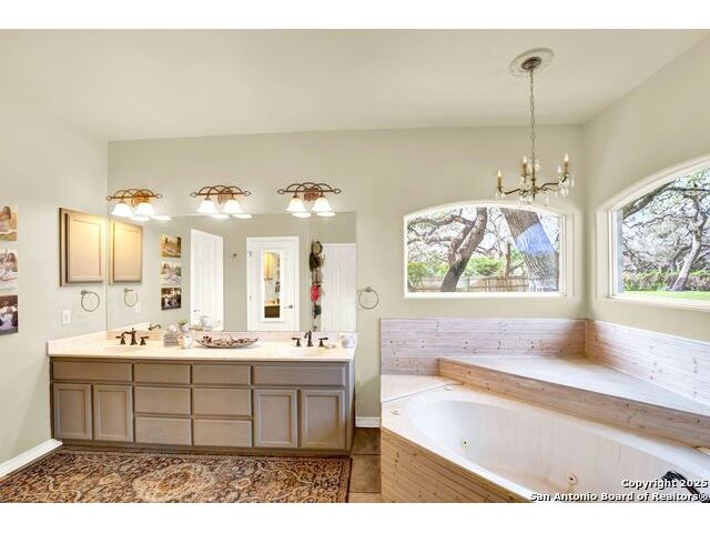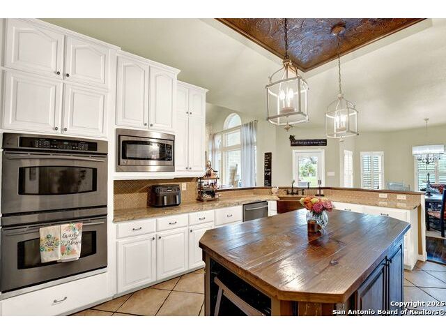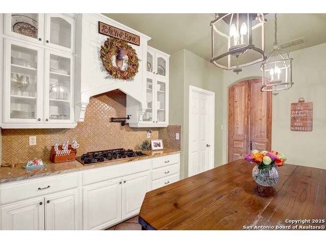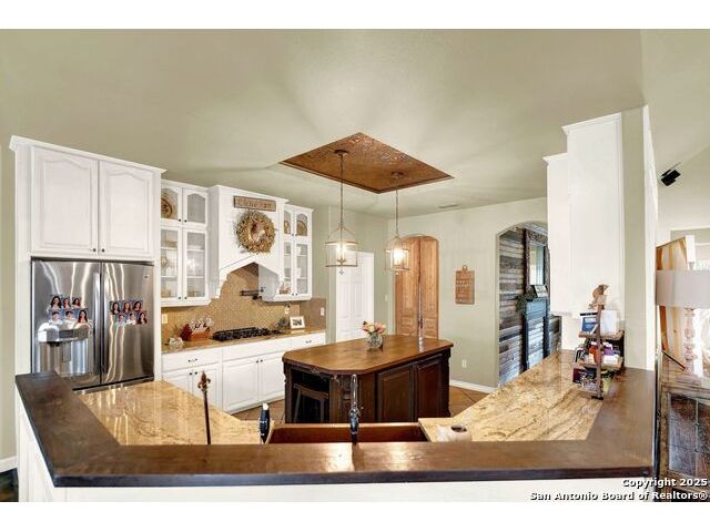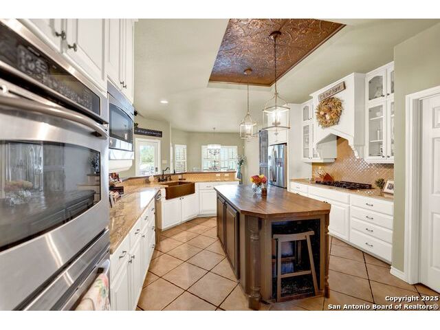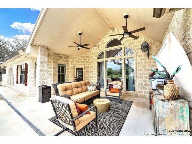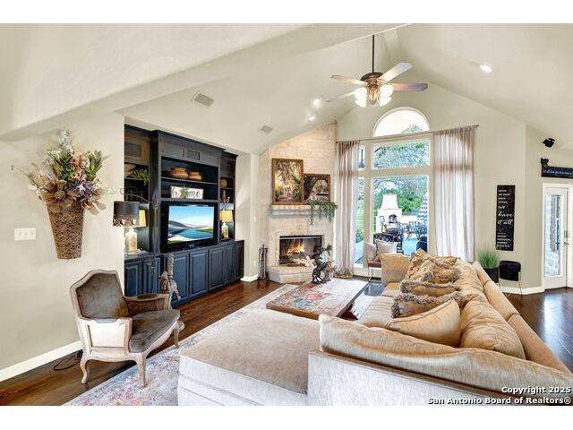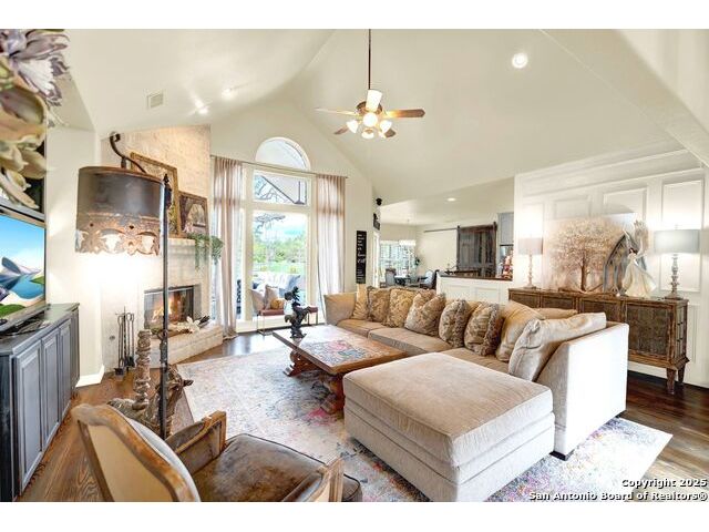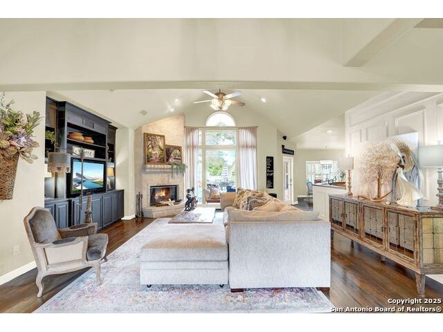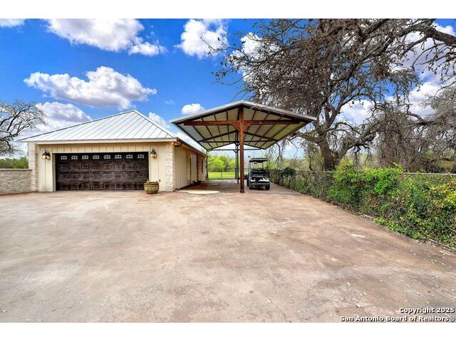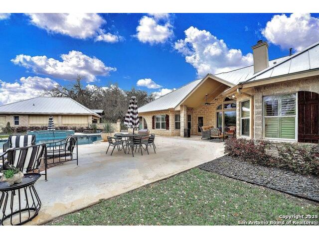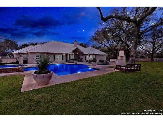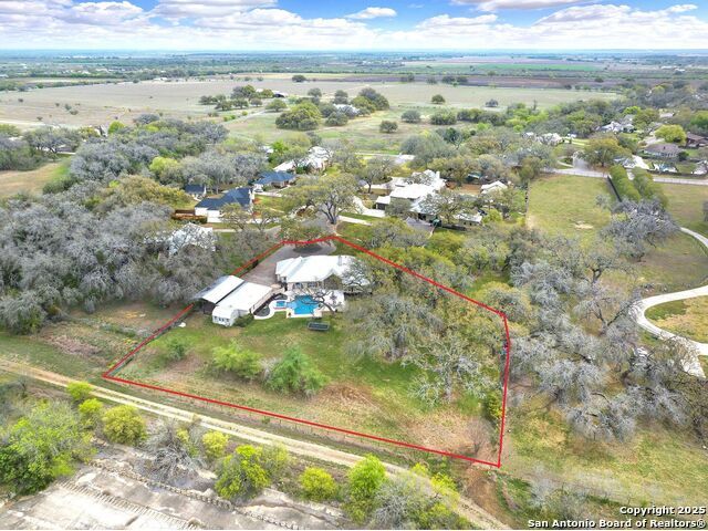 Hill country style beauty just north of downtown Hondo, TX on an exclusive cul-de-sac! Nestled in the gorgeous Kollman Oaks neighborhood, this one-story estate is situated on a 1.3-acre oversized lot with backyard country views. The state-of-the-art backyard is a dream with majestic oaks, a huge custom swimming pool and oversized attached spa, tanning deck, newly poured concrete patio space, a stucco gas outdoor fireplace and so much more! Enjoy a "pool room" which opens to the pool area and has an outdoor bathroom and approximately 300 sq ft of space! Where rustic meets elegance, inside this 3800+ sq ft residence you will find an open concept with two eating spaces, an office open to the living room and a second living space off of the main space! With antique hardwood floors, high ceilings, floor to ceiling rock fireplace and plantation shutters, the style of the home is timeless. With two owner's suites and two additional bedrooms with a jack and jill bathroom, this 4 bedroom, 3.5 bath floor plan is extremely functional. The laundry room is massive and can double as a craft room or butler's kitchen and leads out to the mud room which boasts a gorgeous brick floor. Some extras include a water softener, in wall vacuum system, a gated driveway, new metal roof, new landscaping, carport for boat/RV, stained driveway and a detached two car garage. Enjoy small acreage living just minutes from all of the conveniences of town!