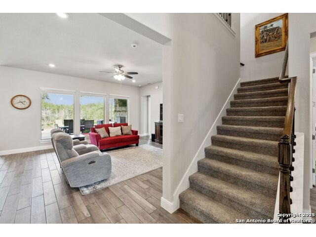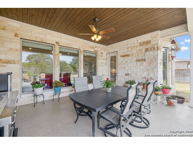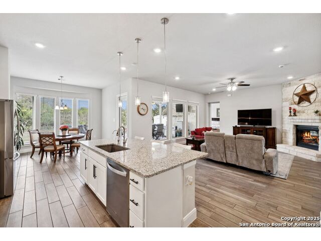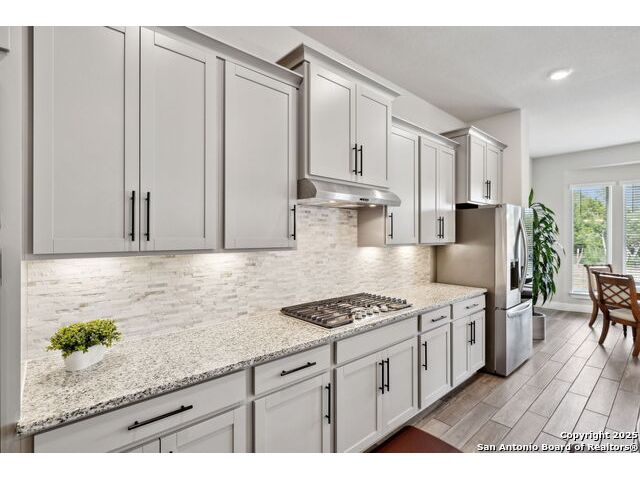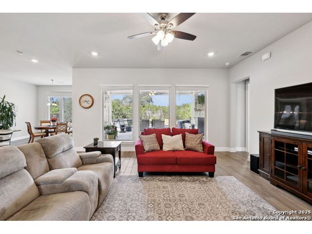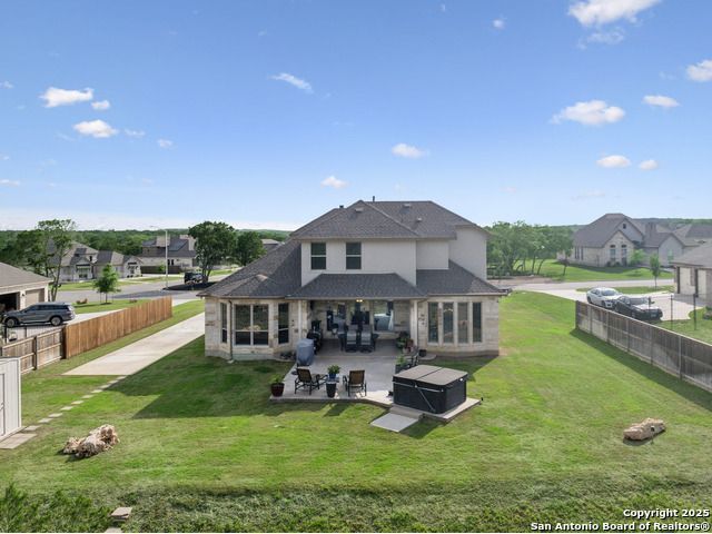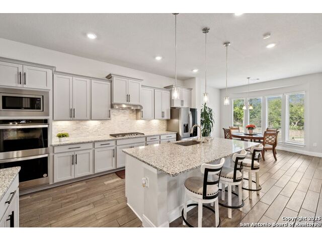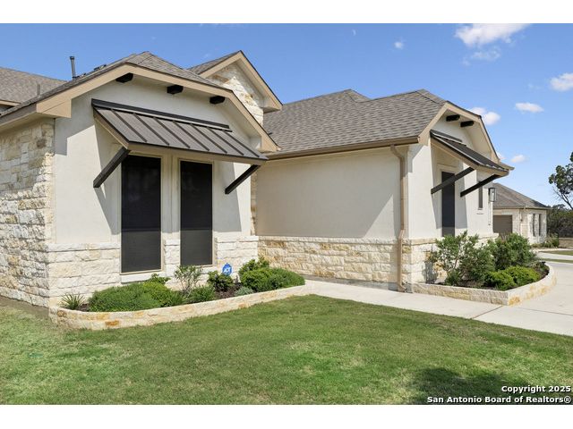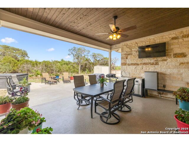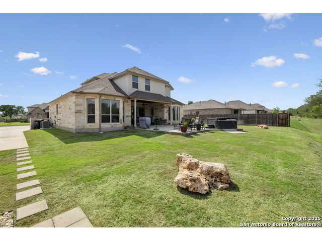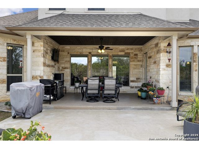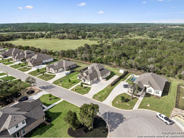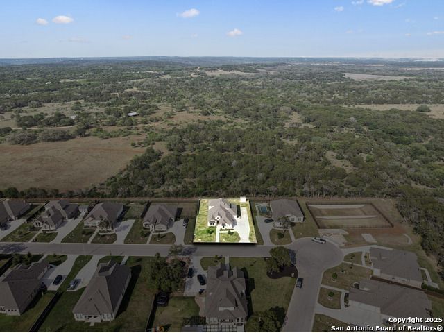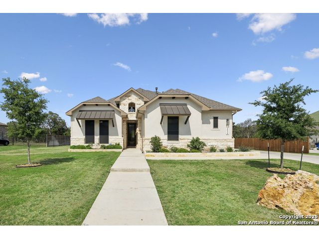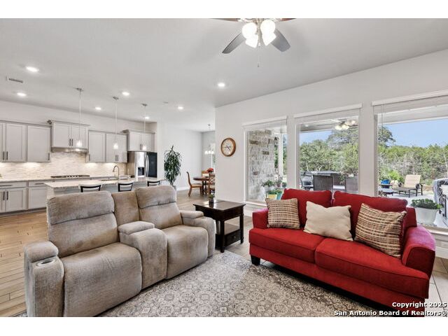Welcome to your modern Hill Country escape-where wide open skies meet thoughtful design. Built in 2021 and backing to a tranquil ranch, this home blends quiet surroundings with everyday convenience. Step inside to find an open-concept layout filled with natural light and upscale touches. The living room offers floor-to-ceiling views and a stone gas fireplace, while the kitchen boasts granite countertops, a gas cooktop, double ovens, a large island, and walk-in and butler's pantries-ideal for home chefs and entertainers alike. The main-floor owner's suite is tucked away for privacy and includes bay windows, a soaking tub, separate vanities, two walk-in closets, and a spa-inspired walk-in shower. Upstairs, a second living space adds flexibility for movie nights or game days. Outside, enjoy peaceful evenings on your covered patio with a wood ceiling, ceiling fan, and epoxy flooring-or grill and relax on the open patio with plenty of space to gather. Solar screens, a storage shed, and a landscaped yard make it turnkey ready. Set in a gated community with a pool and playground, this home offers the comfort of suburbia with a scenic Hill Country backdrop. It's not just a place to live-it's where weekends feel like a getaway, and every day brings room to breathe.