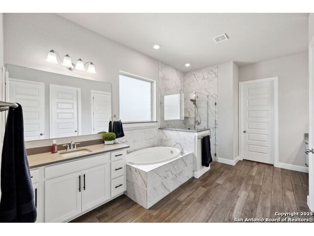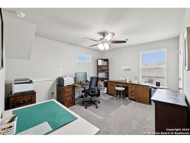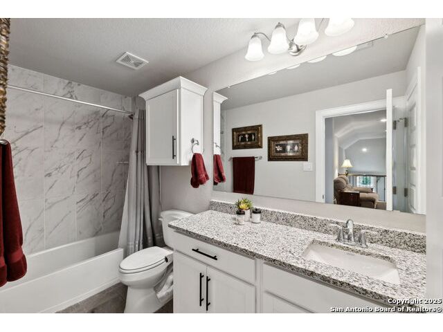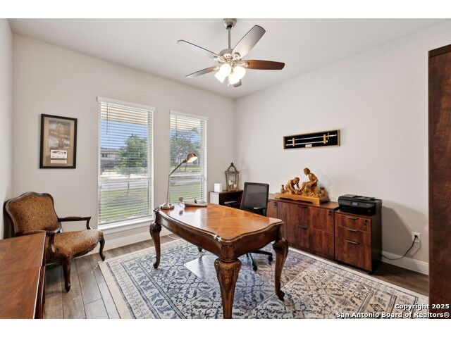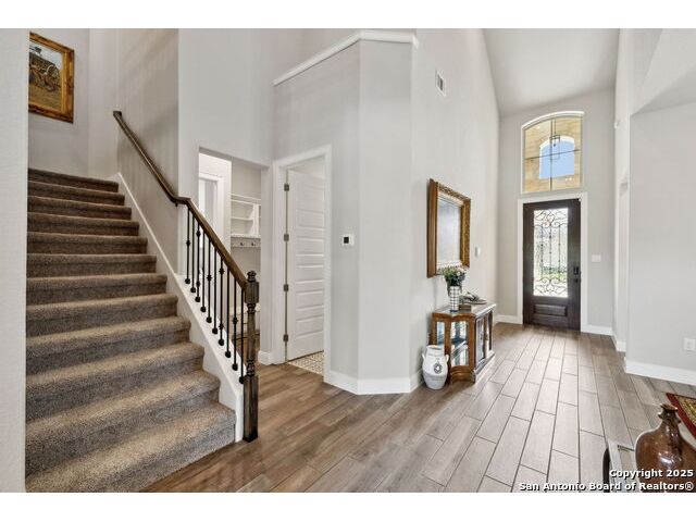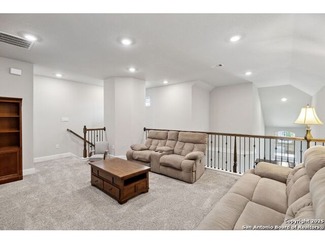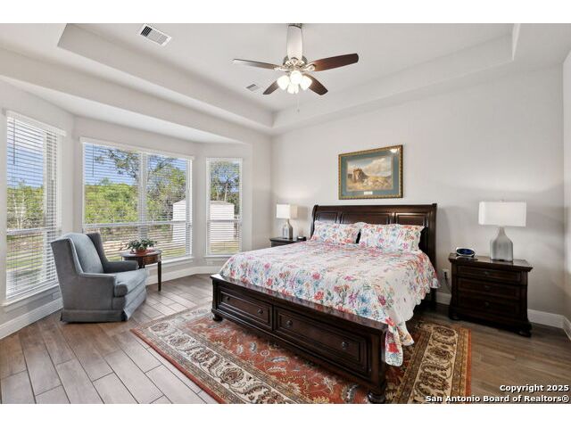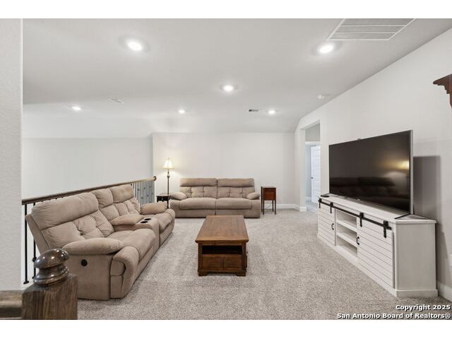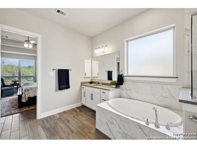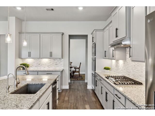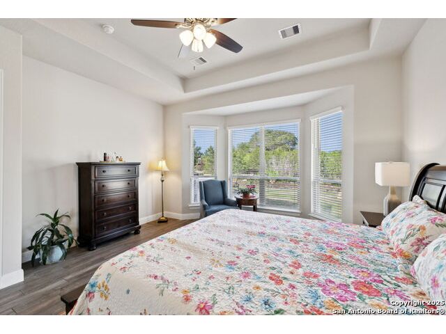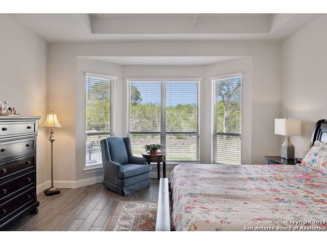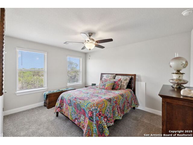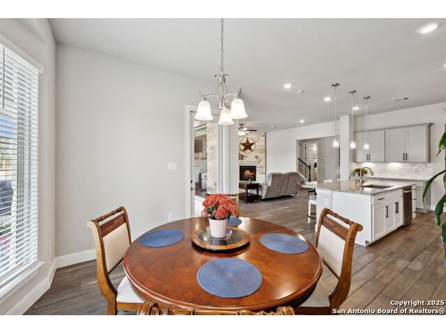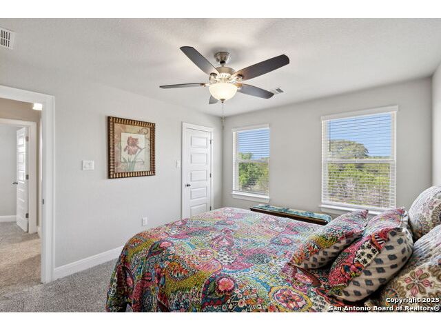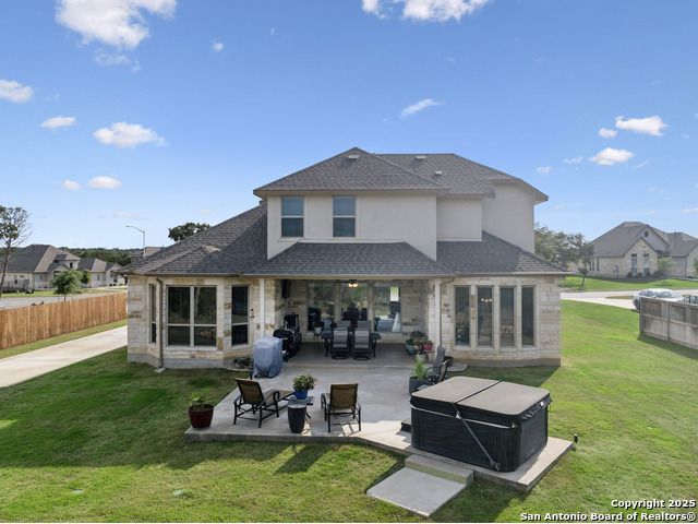 Welcome to your modern Hill Country escape-where wide open skies meet thoughtful design. Built in 2021 and backing to a tranquil ranch, this home blends quiet surroundings with everyday convenience. Step inside to find an open-concept layout filled with natural light and upscale touches. The living room offers floor-to-ceiling views and a stone gas fireplace, while the kitchen boasts granite countertops, a gas cooktop, double ovens, a large island, and walk-in and butler's pantries-ideal for home chefs and entertainers alike. The main-floor owner's suite is tucked away for privacy and includes bay windows, a soaking tub, separate vanities, two walk-in closets, and a spa-inspired walk-in shower. Upstairs, a second living space adds flexibility for movie nights or game days. Outside, enjoy peaceful evenings on your covered patio with a wood ceiling, ceiling fan, and epoxy flooring-or grill and relax on the open patio with plenty of space to gather. Solar screens, a storage shed, and a landscaped yard make it turnkey ready. Set in a gated community with a pool and playground, this home offers the comfort of suburbia with a scenic Hill Country backdrop. It's not just a place to live-it's where weekends feel like a getaway, and every day brings room to breathe.