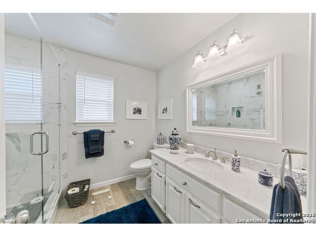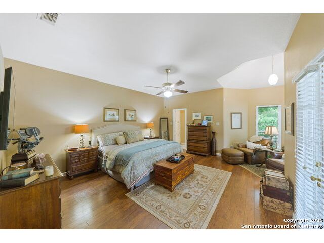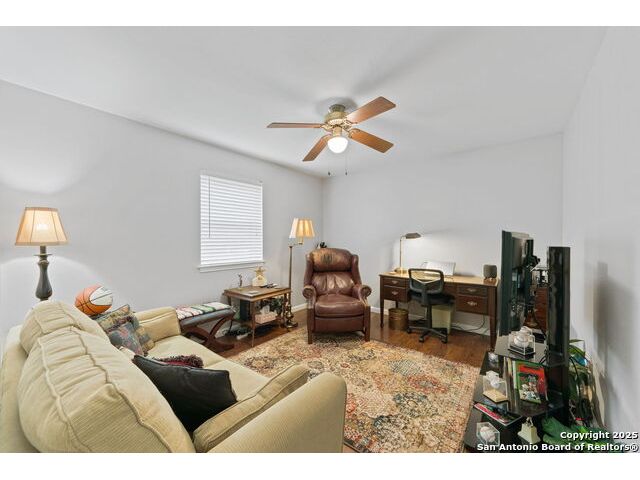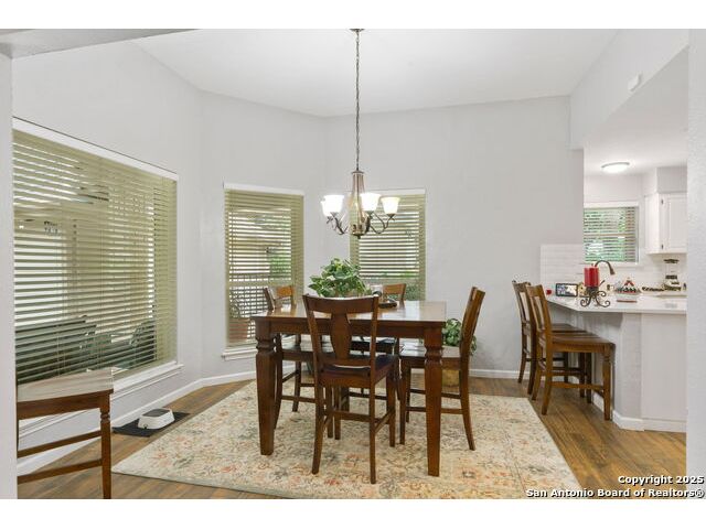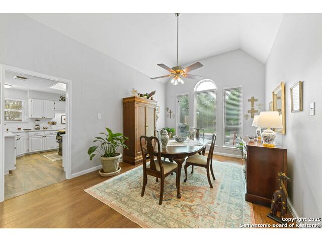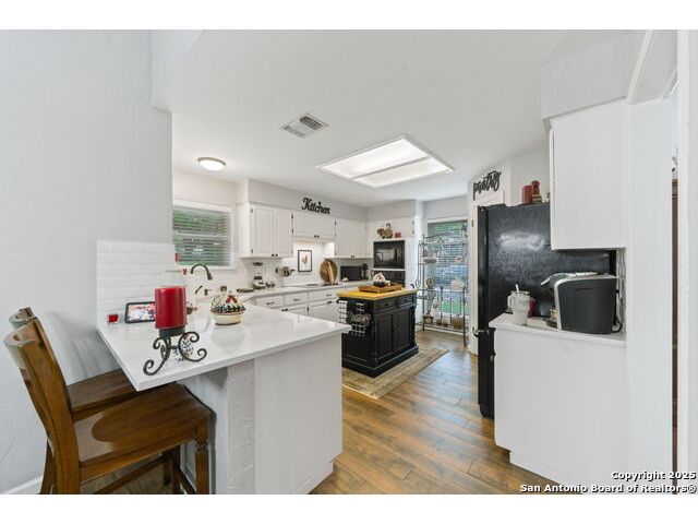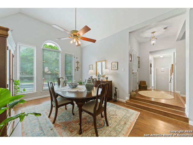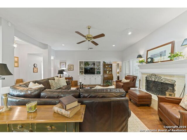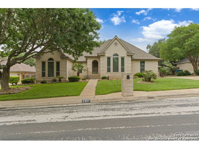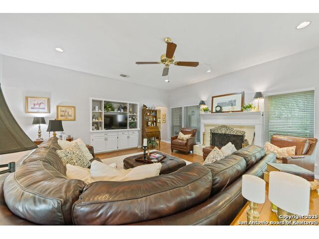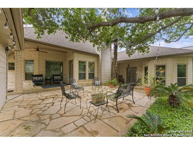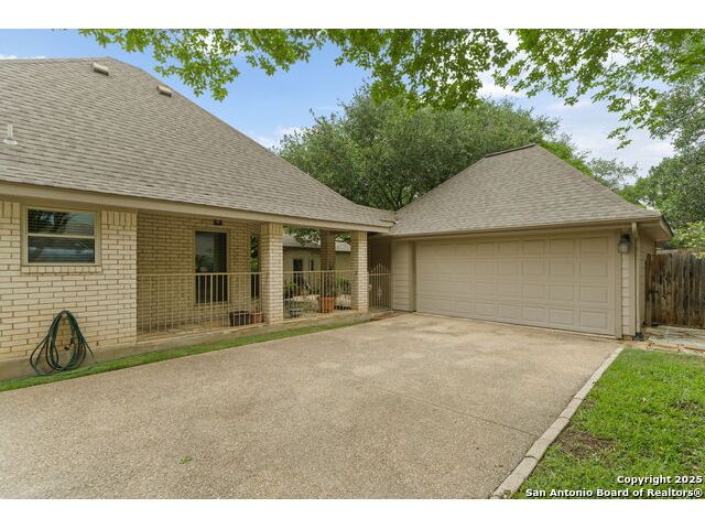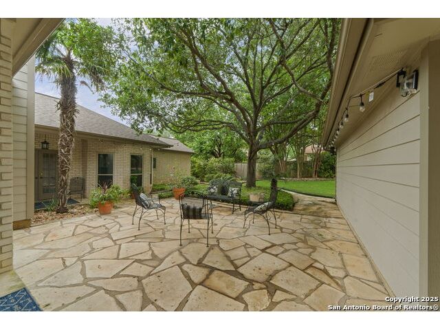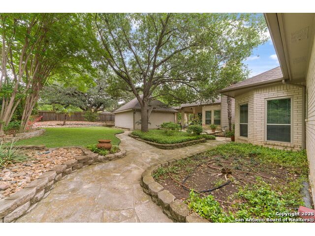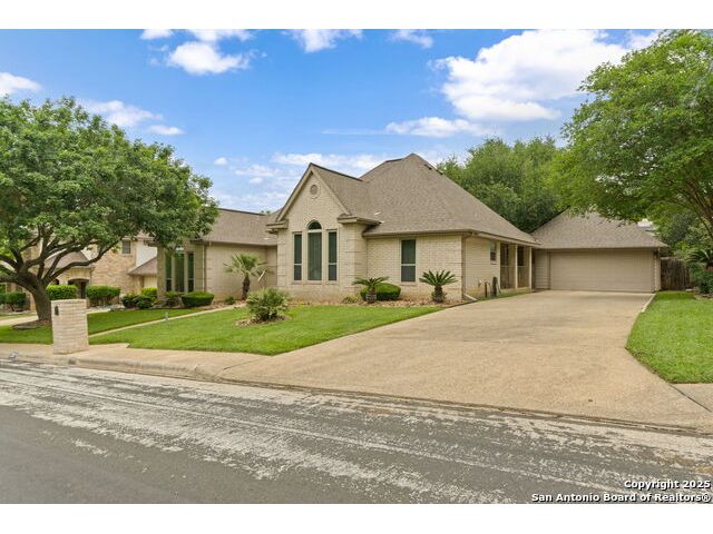 Nestled in the desirable Encino Park community, this charming 3-bed, 2-bath brick home offers comfort, character, and a backyard retreat you'll love. Consider this a multi-level home with 4-5 interior steps going down into the primary and secondary bedrooms. The spacious living room features high ceilings, a tile fireplace, and built-ins. The kitchen boasts white cabinetry, a cooktop, moveable island, and breakfast bar, plus a sunny nook overlooking the backyard. Formal dining adds space for entertaining. The primary suite offers outdoor access, a sitting area, multiple closets, and an ensuite with jacuzzi tub, shower, and dual vanity. Secondary bedrooms are well-sized, and the guest bath has a large walk-in shower. Step outside to a covered patio and flagstone extension, surrounded by mature trees and a park-like setting-ideal for relaxing or entertaining. Easy access to HWY 281, shopping, dining, and more! If schools are important, the 3 schools are top 10 with Encino Park, Tejeda and Johnson.