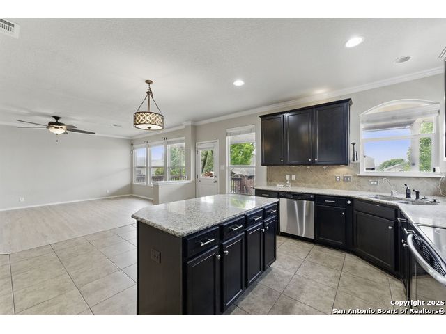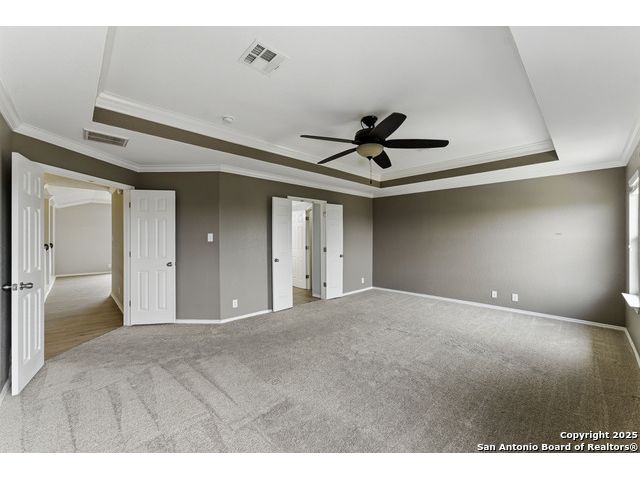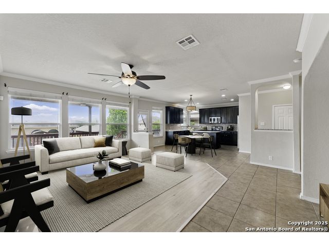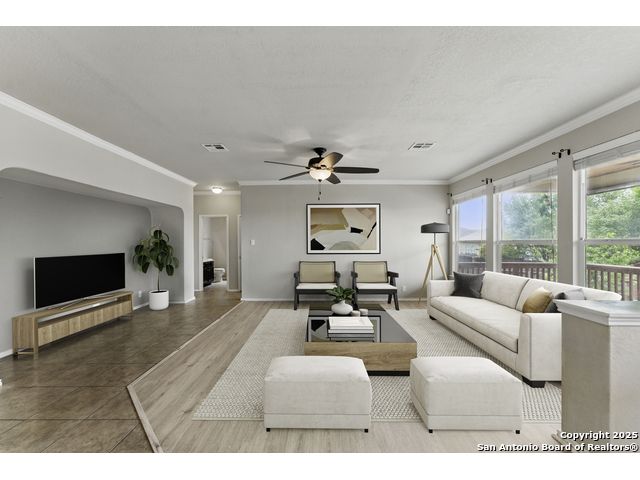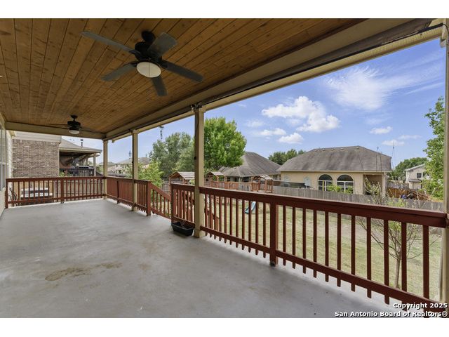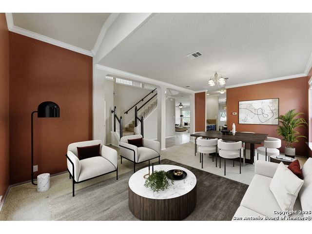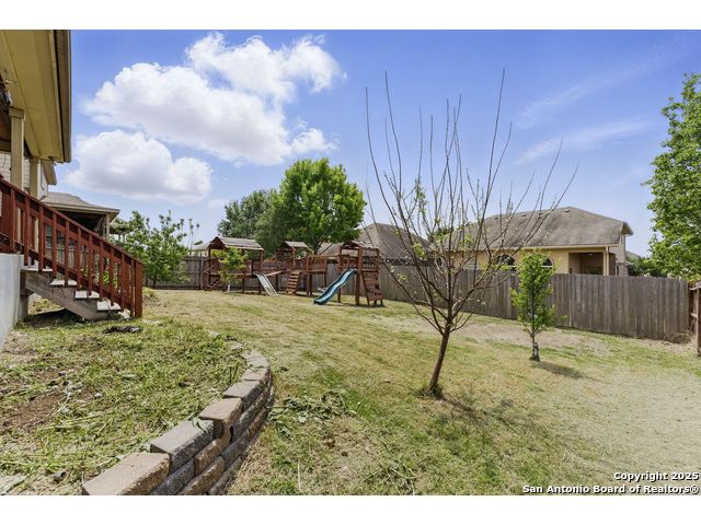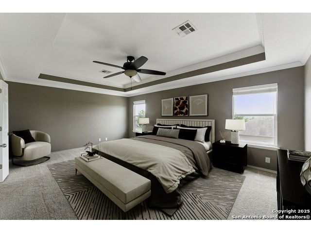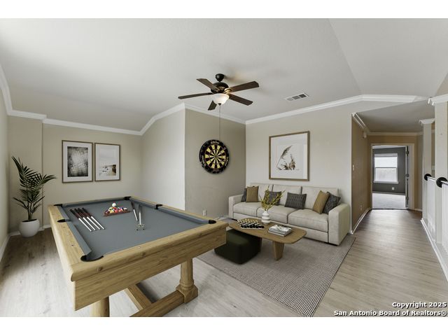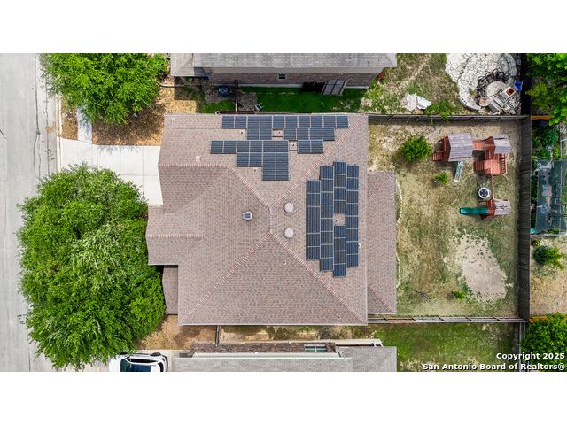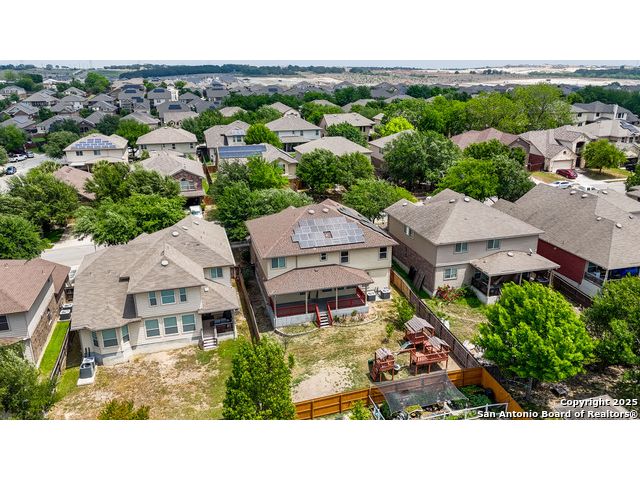 2.875 rate VA Assumable Mortgage. This home has it all! With over 3,200 square feet it has two living areas, two dining spaces, and an upstairs game room, 5 bedrooms, large covered back patio so there's room for everyone to spread out. The kitchen features granite counters, stainless steel appliances, a large island, 42" cabinets, a wet bar, and a massive walk-in pantry. Crown molding adds an elegant touch, and the downstairs bedroom and full bath are ideal for guests or multigenerational living. Upstairs, the private primary suite includes a spacious bath and dual walk-in closets, plus three additional bedrooms and a full bath. Enjoy outdoor living on the large covered patio with fans and sunshades. Additionally this home is equipped with solar panels that will be paid off at closing to keep your utility bills down! Located in a quiet neighborhood with a pool, playground, and easy access to RAFB, I-35, shopping, dining, and Steele High School.