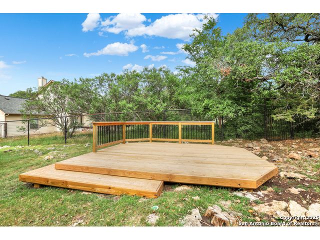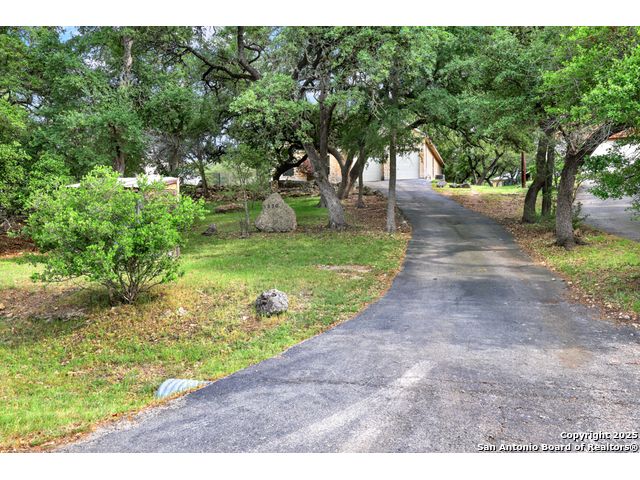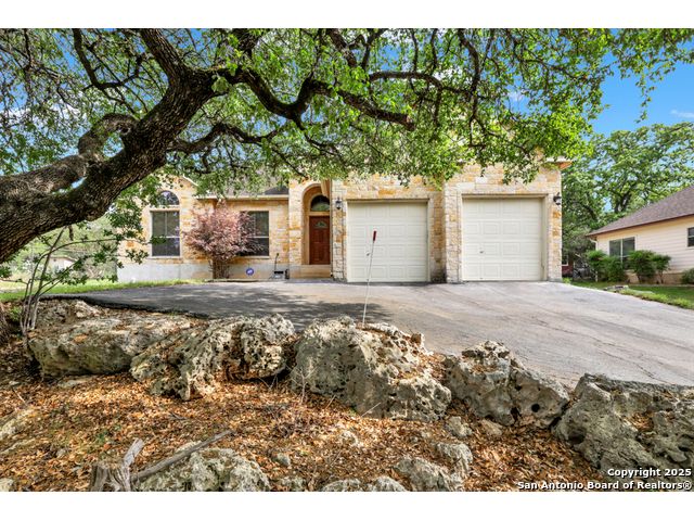 Charming 4 bedroom, 2 bath rock home on half an acre in the popular river park community of Rivermont! Welcome into this open floorpan that leads you to the large living area with a vaulted ceiling, hardwood flooring, and a very handsome wood burning rock fireplace. The island kitchen has a large breakfast bar, 42 inch cabinetry, smooth cooktop oven/range, open to the bay window accented dinging room. The primary suite with hardwood flooring and double crown molding has a newly updated shower, garden tub, dual sinks and a walk-in closet. The primary, living and kitchen areas all view the lush, mature treed back lawn! The secondary bedrooms are spacious with ample storage and have been painted neutral with the 4th bedroom being used as a home gym. You will love the spacious backyard that is partially fenced with a recently added wood deck and slab covered patio to BBQ for your friends and family! Picturesque outdoor living areas with many mature shade trees throughout the property make this the perfect evening to relax and witness the nature show of the occasional deer visits. Neighborhood amenities include a river park with a 1/4 mile of Guadalupe river frontage, a 6 acre pool park with a 43'x19' swimming pool, BBQ area, playground, bathrooms and walking trails, and a pavilion park situated on 16 acres with an outdoor kitchen, tennis/basketball courts, and additional walking trails. Welcome to Hill Country living at its finest yet close to the lake and daily necessities! A must see!
