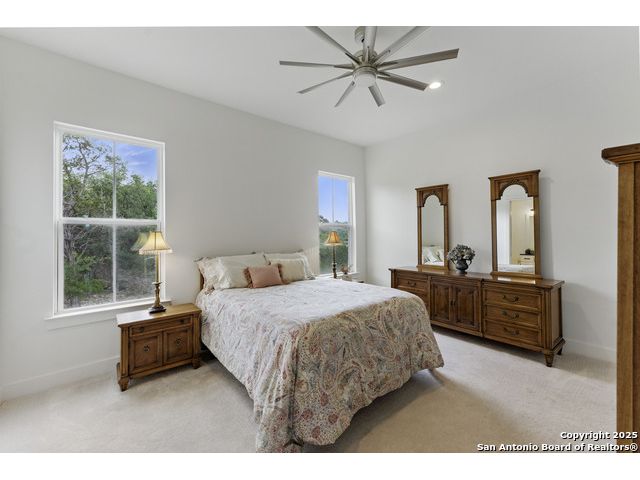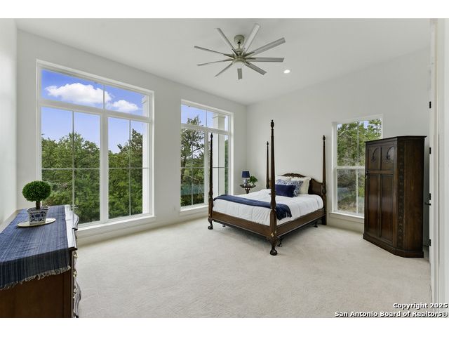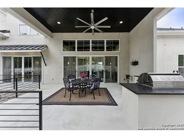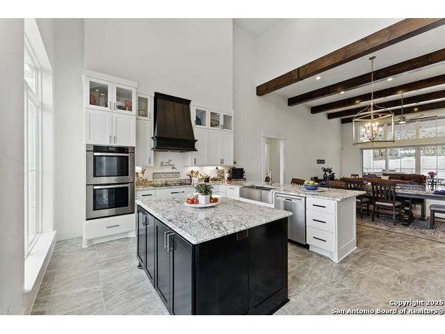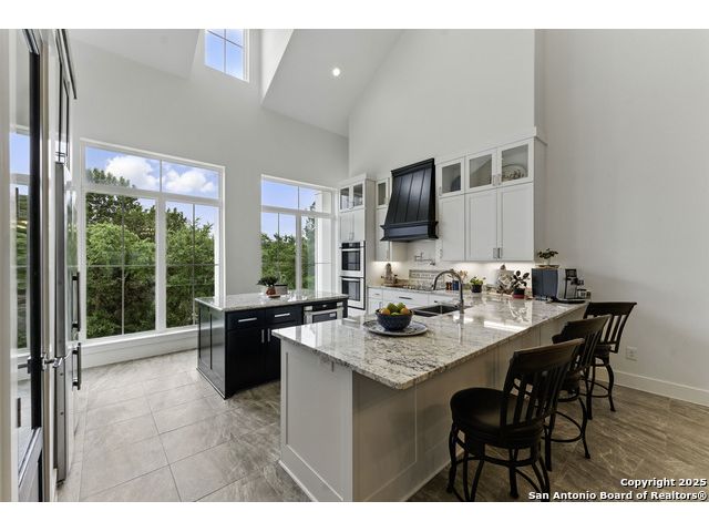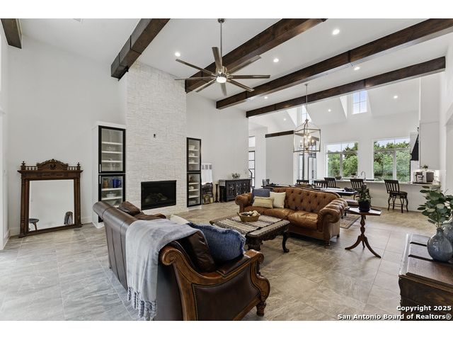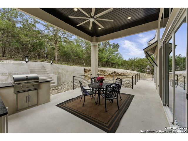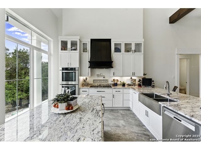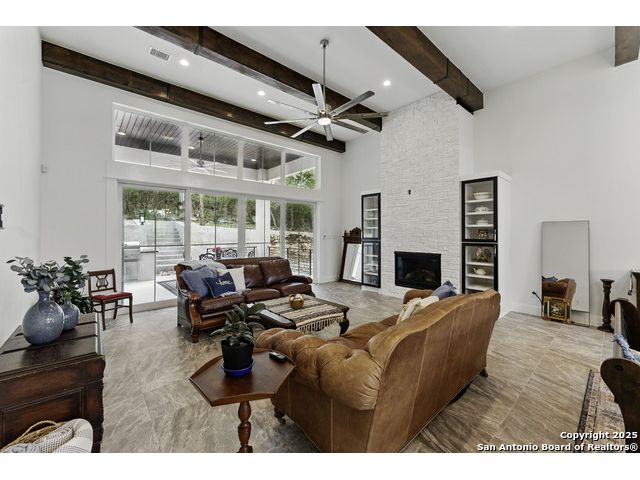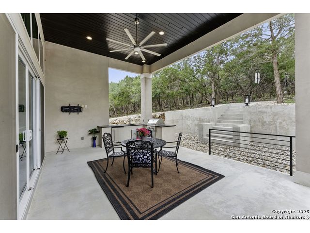 Welcome to this stunning estate home by Haven Builders, located in the highly sought-after River Crossing subdivision. Nestled on a private 1.16-acre lot surrounded by mature trees, this modern architectural masterpiece offers a perfect blend of elegance and functionality, seamlessly integrating with its natural surroundings. Step inside to discover expansive windows that frame breathtaking views, bringing the beauty of the outdoors into every room. The open-concept living, dining, and kitchen areas are accentuated by tall ceilings and the striking presence of exposed iron-strapped beams, creating a sense of grandeur. The wrought iron double-door entry and railings add a touch of sophistication, while panoramic windows and sliding doors further enhance the connection to the outdoors. The state-of-the-art kitchen is a chef's dream, featuring a Liebherr side-by-side refrigerator, a Bosch electric 5-burner cooktop with a convenient pot filler, built-in double ovens, and a sleek microwave drawer, offering both style and top-tier functionality for all your culinary needs. Additional features of this exceptional home include a climate-controlled safe room, generous walk-in attic space, spray foam insulation for energy efficiency, a Tesla charger for modern convenience, and epoxy-coated garage floors that provide durability and a polished finish. Outside, enjoy ample parking, soffit and exterior lighting, and a spacious covered patio perfect for entertaining. The home's luxurious patio features espresso tongue and groove ceilings, adding warmth and texture to the design. The outdoor kitchen is an ideal space for al fresco dining, offering a seamless transition from indoor to outdoor living. Every detail has been carefully considered to provide both style and comfort, ensuring an exceptional living experience. This is more than just a home; it's a lifestyle-where luxury meets nature in the heart of River Crossing.