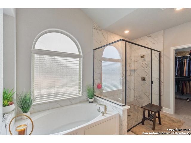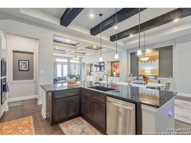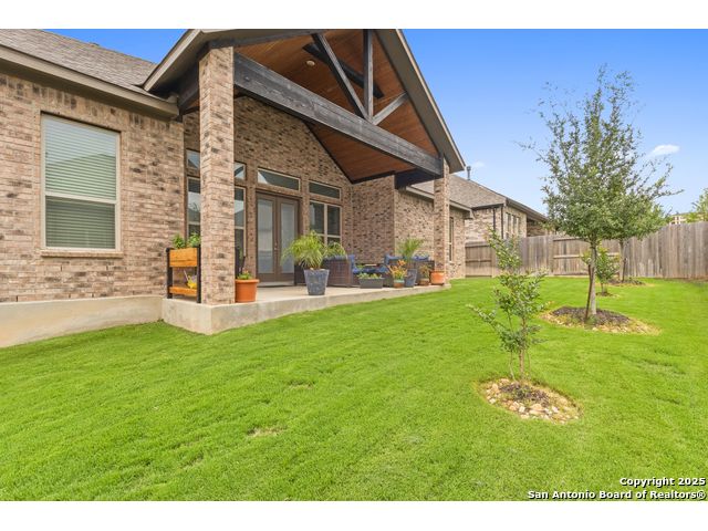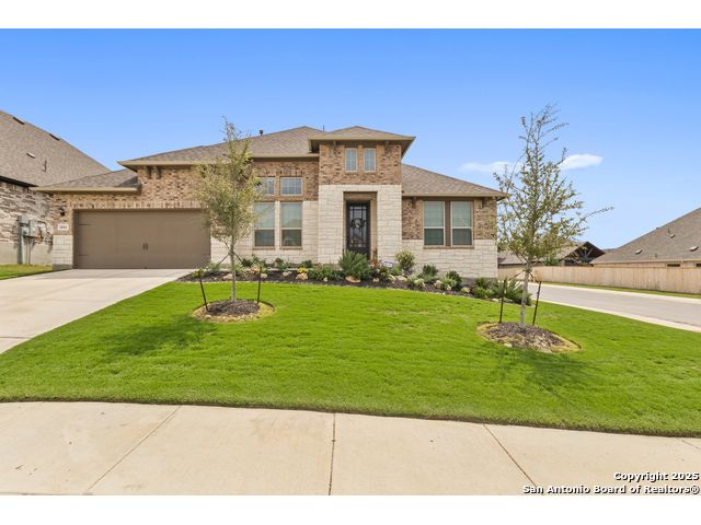 Gorgeous 1-story home, stone/brick, lovely curb appeal, lovely landscaping, 3 car tandem garage, on a large corner lot! Step into something truly special with this beautifully maintained better than new home highly sought-after Sunday Creek at Kinder Ranch. Warm, inviting fireplace and built-in cabinets in the spacious family room featuring an eye-catching ceiling detail. 8' front and back exterior doors. Features a gourmet kitchen with a center island, gas cook top, built-in oven, and a walk-in pantry. Formal dining room or office could be 4th bedroom flex room. Luxurious primary suite with extra large room with living room area with private bath including a mud-set shower, garden tub and double vanities. Outside, unwind under the covered patio, take in the lush landscaping, or enjoy a stroll on nearby walking paths-it's a tranquil retreat right in your own backyard. The 3-car tandem garage includes incredible built-in storage, tankless water heater, and a water softener, offering both convenience and comfort. Come experience it for yourself-this home has so much more to offer than meets the eye! Private study. Extended covered patio perfect for outdoor entertaining & relaxing.