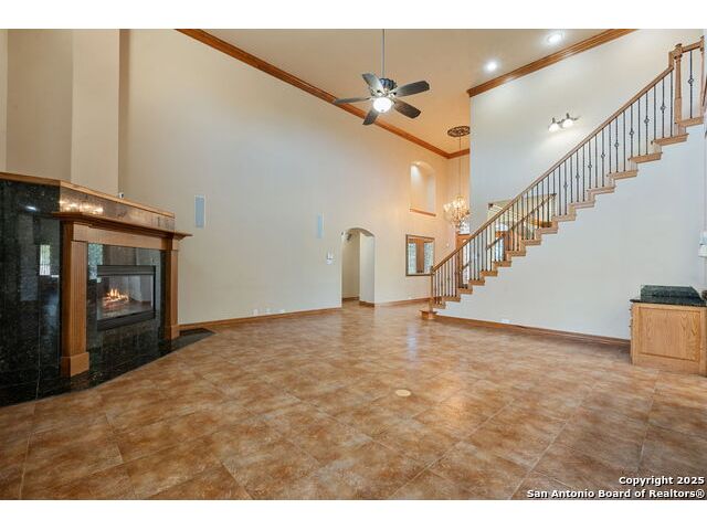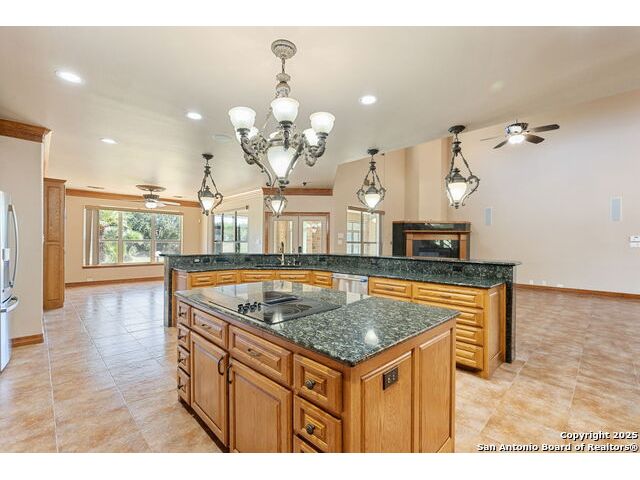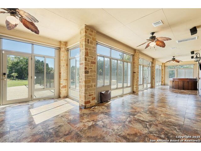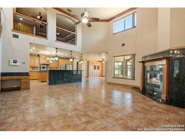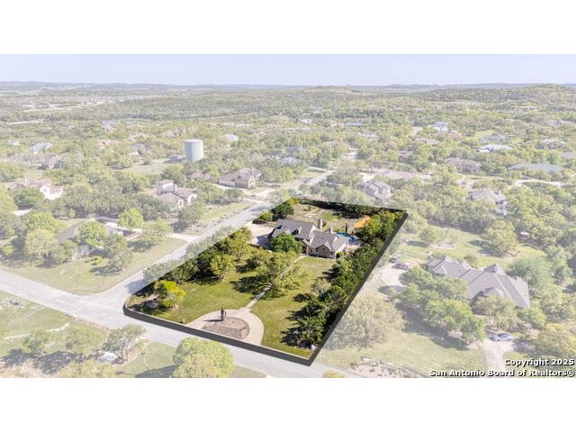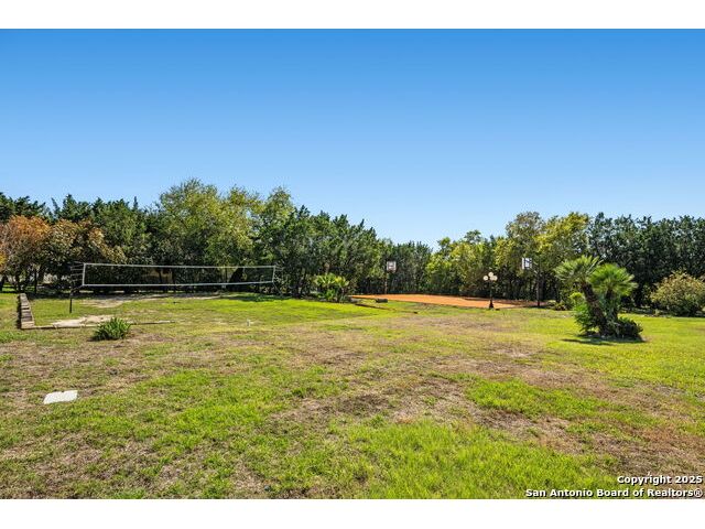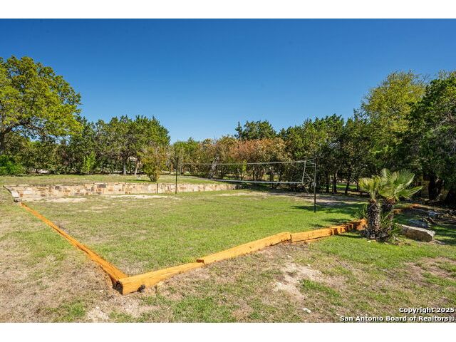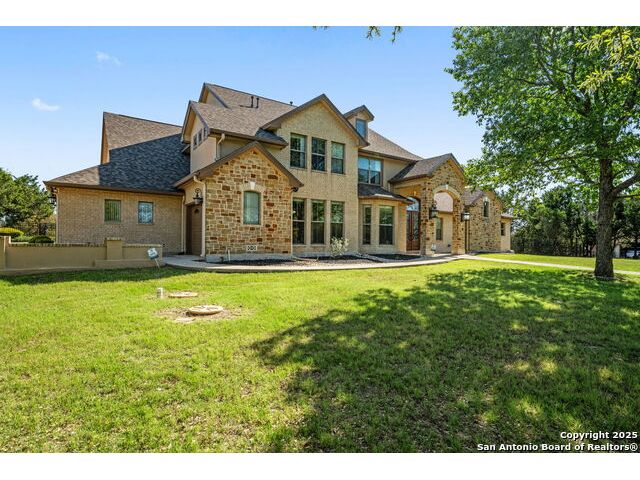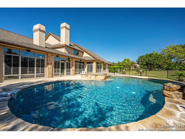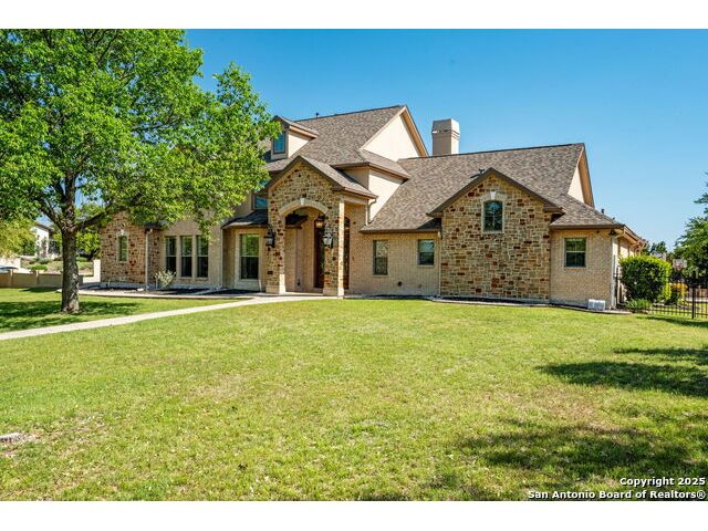 Welcome to this stunning two-story custom estate on 1.75 acres in the prestigious gated community of Menger Springs Estates. With 5 beds, 3.5 baths, and 5,718 sq ft of luxury living, this home offers space, comfort, and style. Step through elegant French doors into your Texas Hill Country getaway, featuring a beautifully landscaped backyard with a heated pool and spa, a waterfall feature, a full basketball court, a volleyball court and a cozy fire pit-perfect for cool Texas evenings. Inside, the open-concept layout showcases hardwood and porcelain tile floors throughout. The chef's kitchen is built to impress with a massive island that seats 10+, granite countertops, custom cabinetry, four convection ovens, a glass electric cooktop, gas stove with indoor grill, pot filler, and built-in hot/cold water dispensers. The primary bedroom with a sitting area, double-sided fireplace, and a spa-like bath with dual vanities, dual showers, whirlpool tubs, two walk-in closets, and its own laundry hookups with space for a fridge and microwave. A secondary bedroom with an en-suite bath and walk-in closet is also located on the main floor. Just minutes from La Cantera, The Rim, and The Dominion! Boerne ISD. Welcome home!