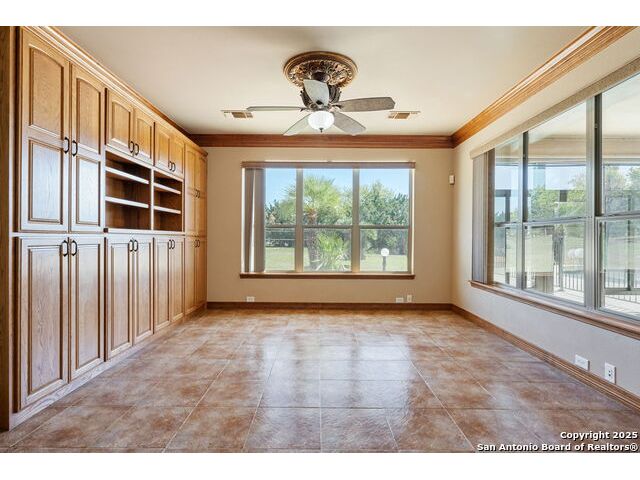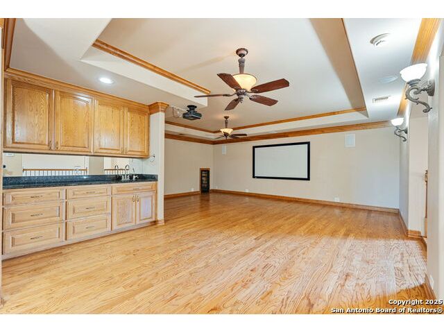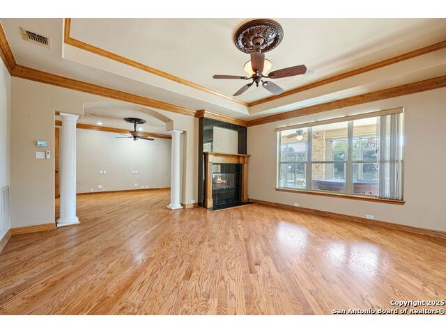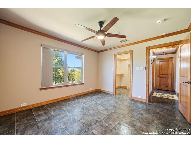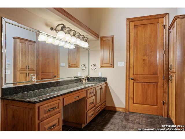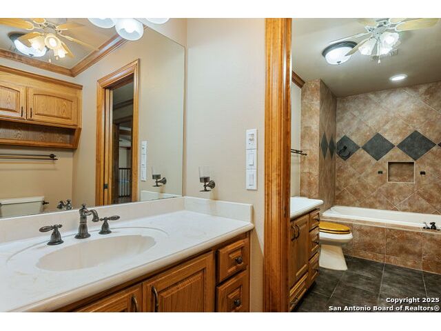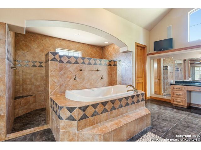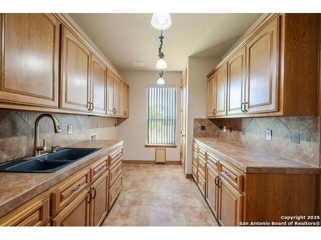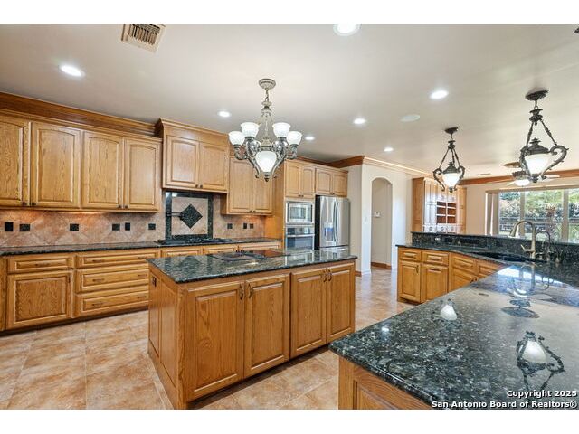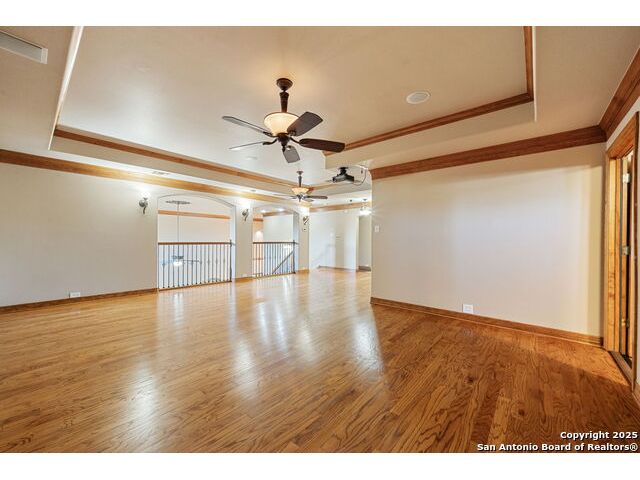 Welcome to this stunning two-story custom estate on 1.75 acres in the prestigious gated community of Menger Springs Estates. With 5 beds, 3.5 baths, and 5,718 sq ft of luxury living, this home offers space, comfort, and style. Step through elegant French doors into your Texas Hill Country getaway, featuring a beautifully landscaped backyard with a heated pool and spa, a waterfall feature, a full basketball court, a volleyball court and a cozy fire pit-perfect for cool Texas evenings. Inside, the open-concept layout showcases hardwood and porcelain tile floors throughout. The chef's kitchen is built to impress with a massive island that seats 10+, granite countertops, custom cabinetry, four convection ovens, a glass electric cooktop, gas stove with indoor grill, pot filler, and built-in hot/cold water dispensers. The primary bedroom with a sitting area, double-sided fireplace, and a spa-like bath with dual vanities, dual showers, whirlpool tubs, two walk-in closets, and its own laundry hookups with space for a fridge and microwave. A secondary bedroom with an en-suite bath and walk-in closet is also located on the main floor. Just minutes from La Cantera, The Rim, and The Dominion! Boerne ISD. Welcome home!