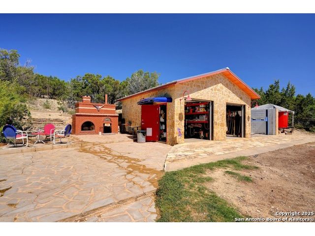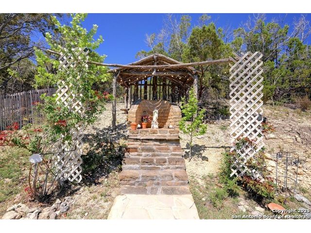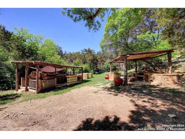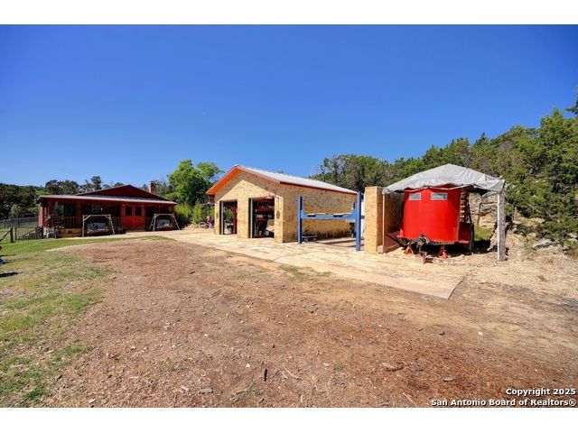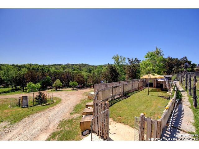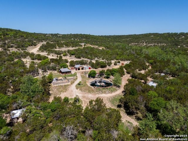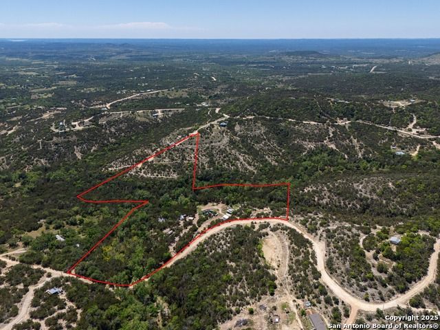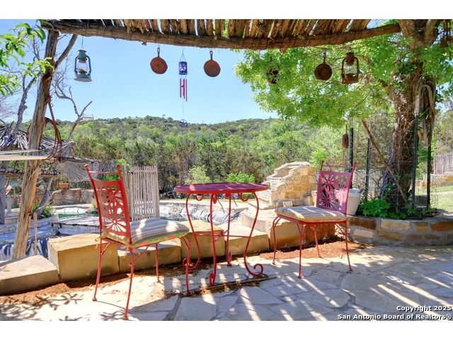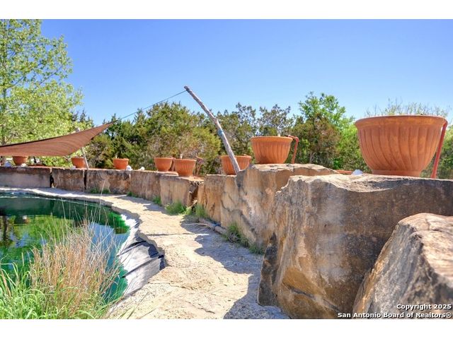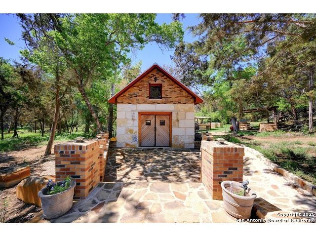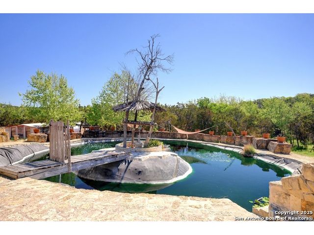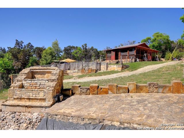 Amazing Unicorn Property!!! 18 +/- Unrestricted acres with huge views and wet weather creek. Massive Sycamore Trees and Large Oaks abound on this hidden gem of a property. Owners are stone masons and lots of amazing stonework has been done on the property. Everything is extremely well built. There is a cozy cabin to stay in while you build your forever home. Two car detached garage with lift rack. There is a chapel built from solid 2'x4' limestone blocks that is just amazing. Several outdoor kitchens on property. Wood fired Pizza Oven, numerous fountains and patio areas to enjoy the views and Hill Country. Two Ponds with Coy fish. Electrical and water lines have been installed all across the property. There is also a foundation for a forever home that was started. Part of the creek has had the walls rocked in to create a natural swimming hole. Dog lovers take note the owner has built a large dog run with a dog palace. It's heated and air conditioned. There is a pool for his dogs to cool off in under a shaded porch. He keeps the Saint Augustine grass watered and lush for his furry friends.
