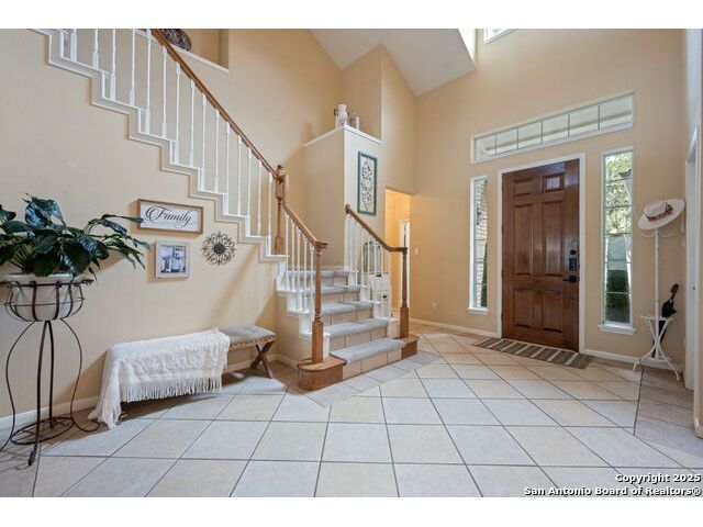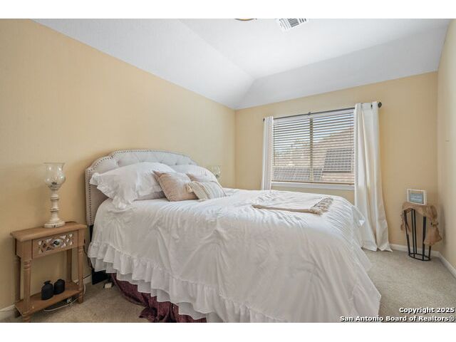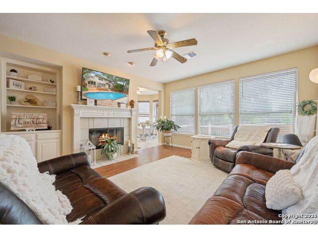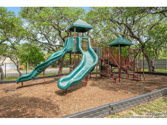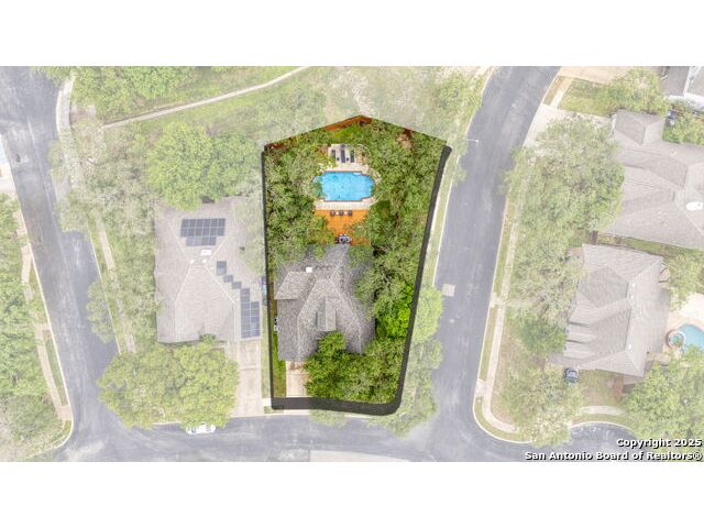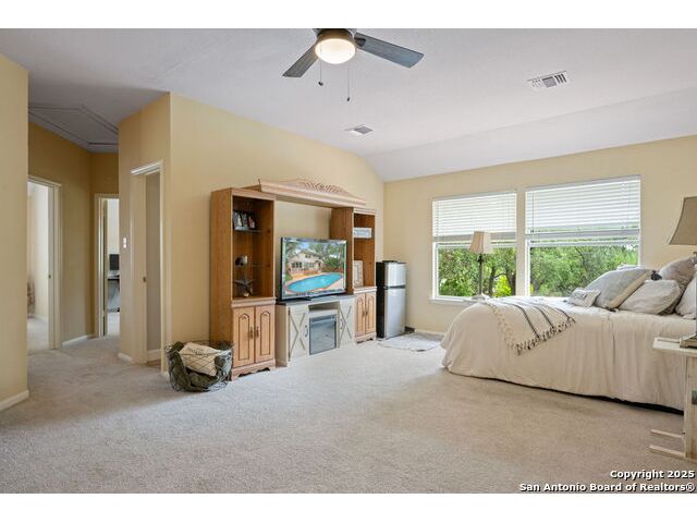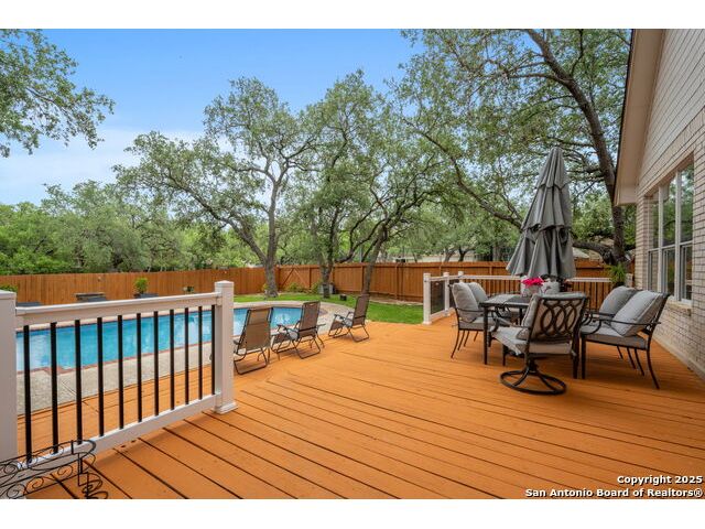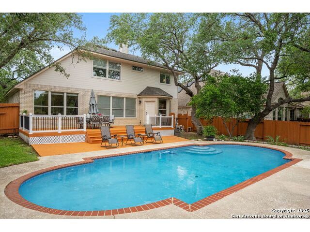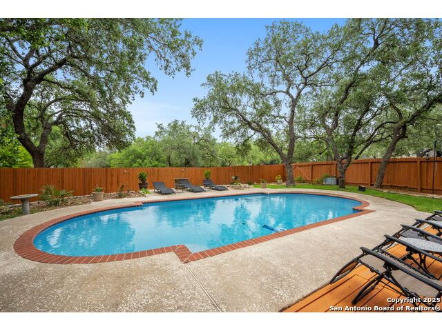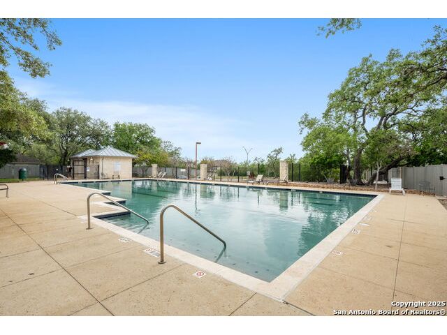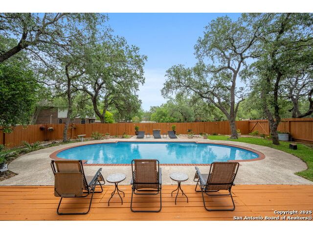 Experience resort-style living in this stunning home with a private inground pool, perfectly situated on a spacious corner lot within a serene, park-like cul-de-sac in the exclusive, gated community of The Fairways. Adjacent to the renowned 27-hole Hill Country Golf Club, this beautifully maintained 4-bedroom, 3-bath residence offers 2,702 sq ft of thoughtfully designed living space. Vaulted and 9-foot ceilings throughout create an open, airy feel, while multiple living and dining areas provide ideal spaces for both everyday living and entertaining. The inviting living room features a cozy gas fireplace, and the generously sized bedrooms include double walk-in closets and plenty of ample storage space. The primary suite is a true retreat with a spa-like garden tub and ample space to unwind. Enjoy peace of mind with recent updates including a new roof, both AC units, and a new water heater. Ideally located just minutes from premier golf, shopping, dining, and major highways-this home offers comfort, and convenience all in one. Located in Northside ISD. Welcome home!