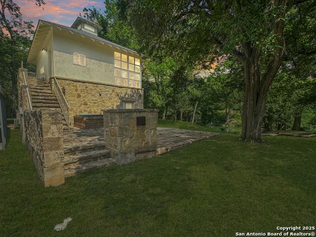 Rare Find! 100 feet Guadalupe River frontage in-town on almost 2 acres heavily wooded forest of towering oaks & elms. Very cool 2 story Alamo Stone cottage/weekend home. Lots of windows & views up and down the river. Spacious rock patio with hot tub & fire pit. This is a great place to relax & BBQ while watching the river activities. Wood deck on river's edge. Spiral stairs to loft/home office. Whether you're looking for a weekend getaway or your own everyday private oasis this is it.