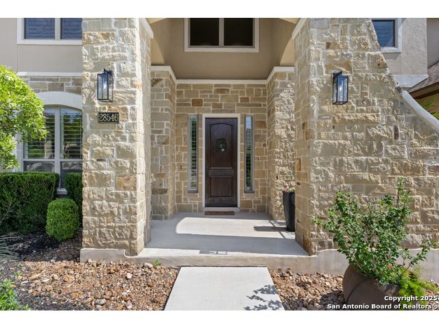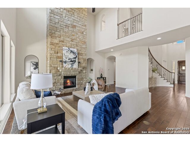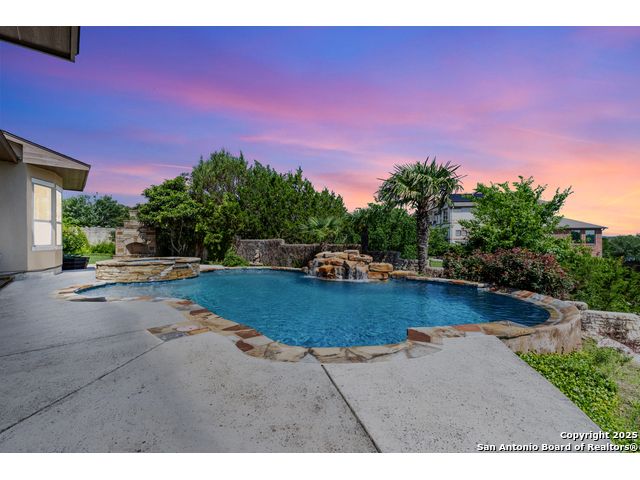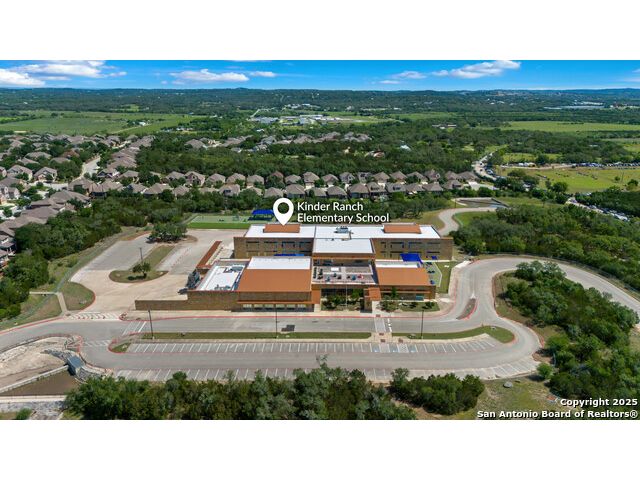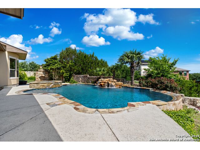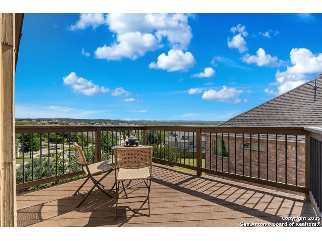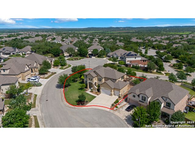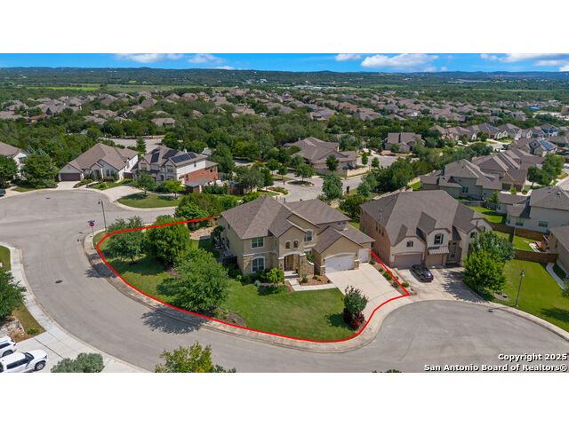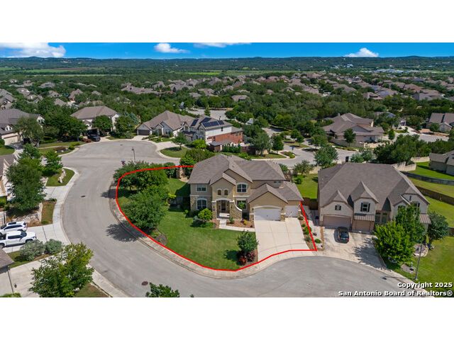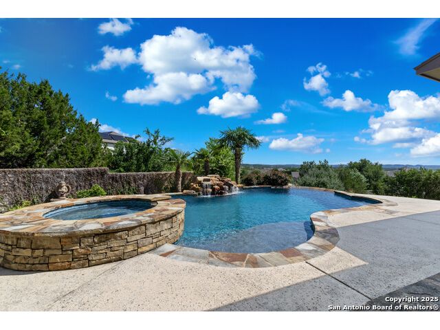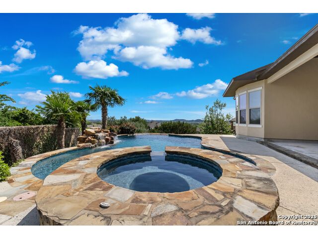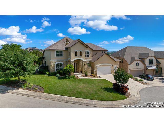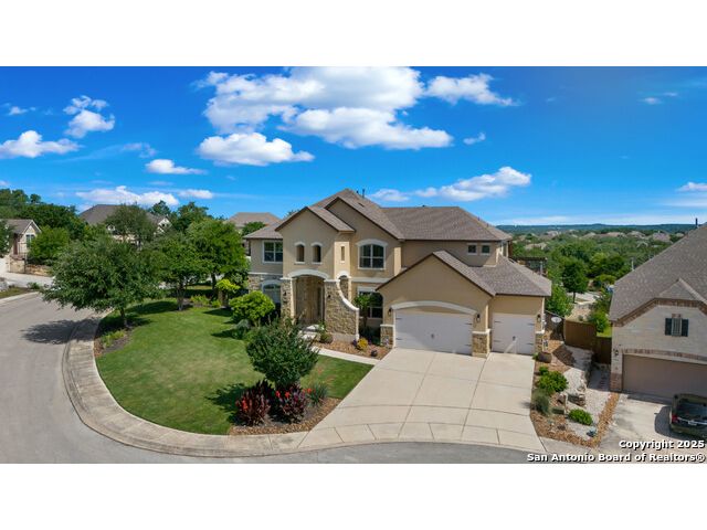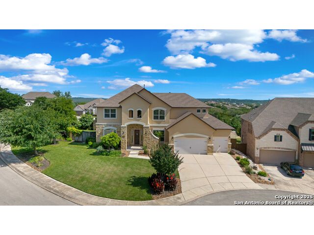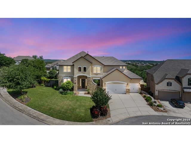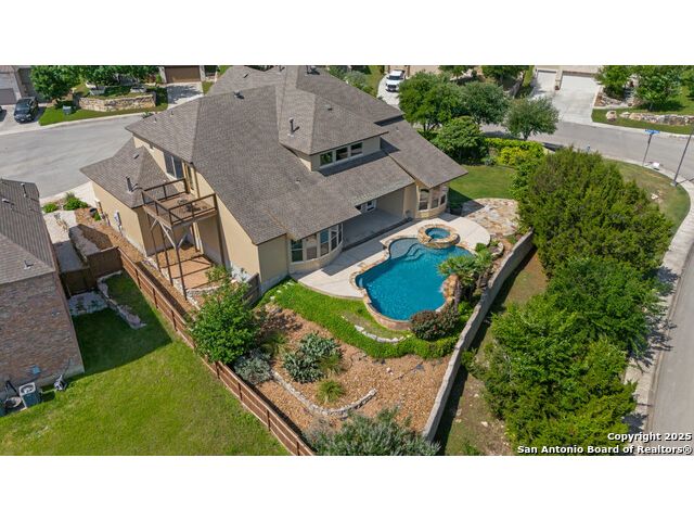 Luxury Living with Hill Country Views at an amazing price!!! Welcome to this stunning Monticello-built masterpiece, on an oversized corner lot at the top of the hill in the prestigious gated community of Hastings Ridge at Kinder Ranch. With unparalleled views, this 5-bedroom, 4-bathroom home offers 4,319 sq ft of thoughtfully designed space where elegance meets everyday comfort. As you approach the home, you're immediately welcomed by a beautifully landscaped front yard featuring lush Zoysia grass, mature crepe myrtle trees, and stately potted plants, all maintained by a full irrigation system-a true first impression of elegance and care. Upon entering, you're greeted by a grand foyer, a striking curved staircase, a private home office, and a formal dining room, setting the tone for the home's sophisticated character. Soaring 10-foot ceilings and an abundance of natural light carry you into the spacious living room-ideal for both entertaining guests and everyday relaxation. The gourmet kitchen is a chef's dream, showcasing high-end granite countertops, custom upgraded cabinetry, stone backsplash, gas cooking, and built-in appliances. You can also enjoy many family meals in the breakfast nook large enough for a 8 person table. The luxurious primary suite is your private sanctuary with sweeping Hill Country views, a spa-inspired bath featuring a mud-set walk-in shower, garden tub, dual vanities, and separate his-and-her closets. A large secondary bedroom and full bath on the main floor is perfect for multigenerational living or guests. Step outside to your private resort-style backyard oasis. Enjoy the large covered patio, outdoor stone fireplace, hot tub, and in-ground pool. This yard is perfect for relaxing evenings or lively gatherings. Don't miss the second-floor "Eagle's Nest" balcony, offering breathtaking panoramic views. Additional highlights include: wood and tile flooring throughout the first floor, a spacious game room with custom shuffleboard and darts, a separate media room with tv and surround sound, fitness equipment included, oversized laundry room with shelving and utility sink, drop zone off the oversized 3-car garage, two water heaters & two HVAC units, whole-home water filtration system, and custom shutters on all front-facing windows. Custom Hunter Douglas motorized shades available for all other windows in the home. This home is located in the highly acclaimed Comal ISD with the elementary, middle and high school that services the neighborhood all within walking distance. Just minutes from Hwy 281, top-tier shopping, dining, and all that North San Antonio has to offer. Hastings Ridge also features fantastic community amenities to include a pool, playground, basketball court, and scenic walking/jogging trails.