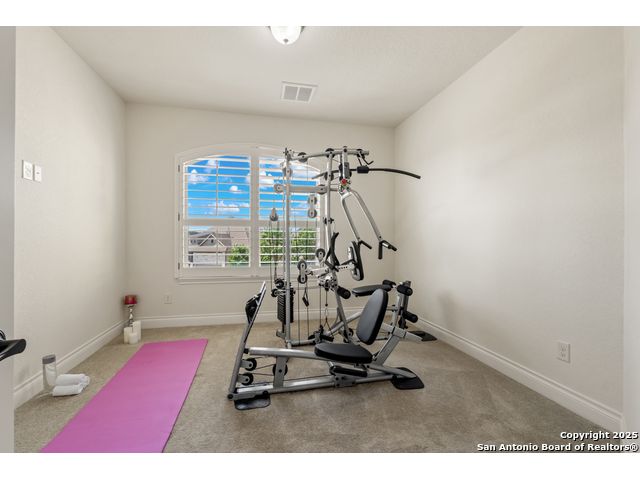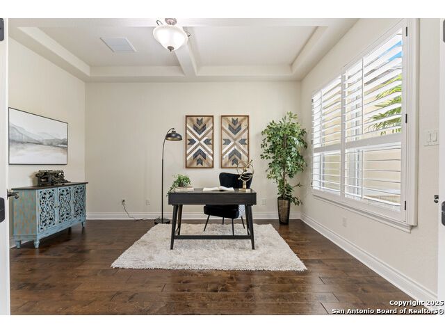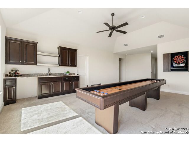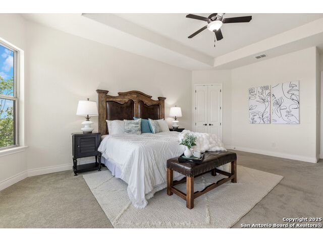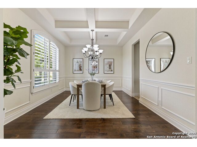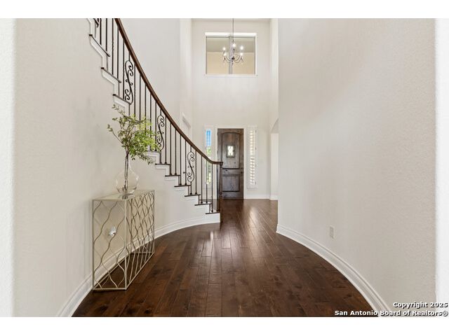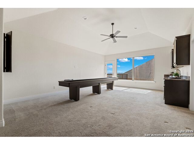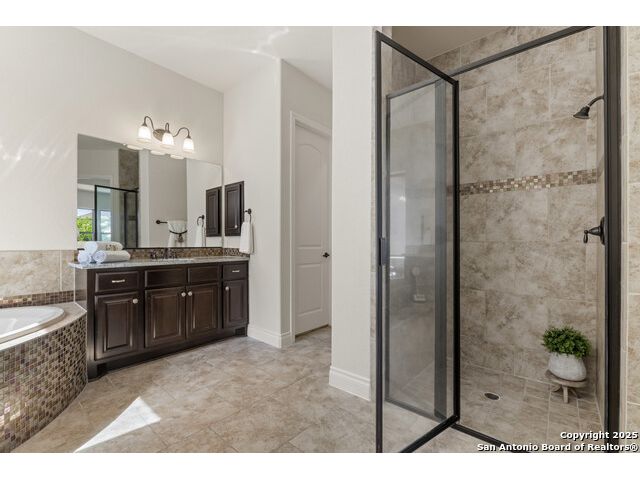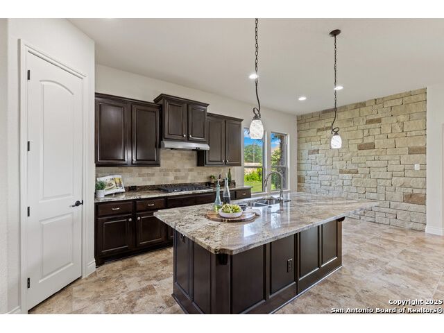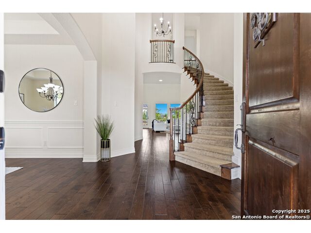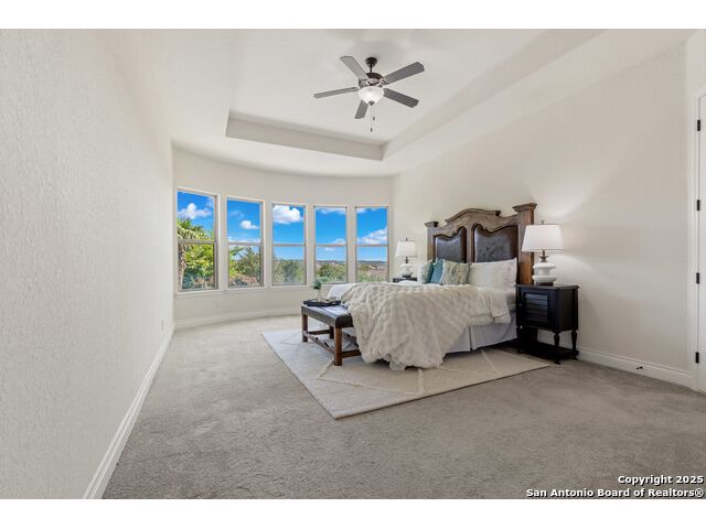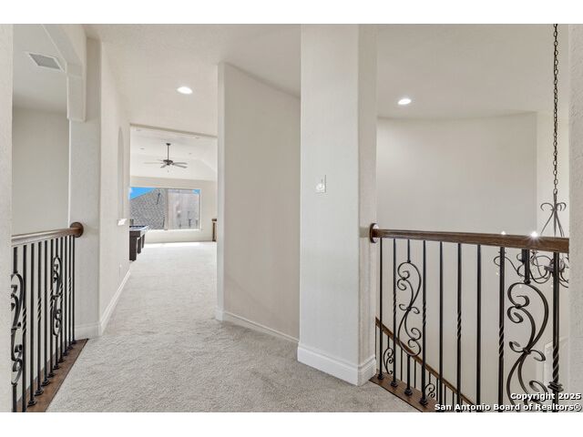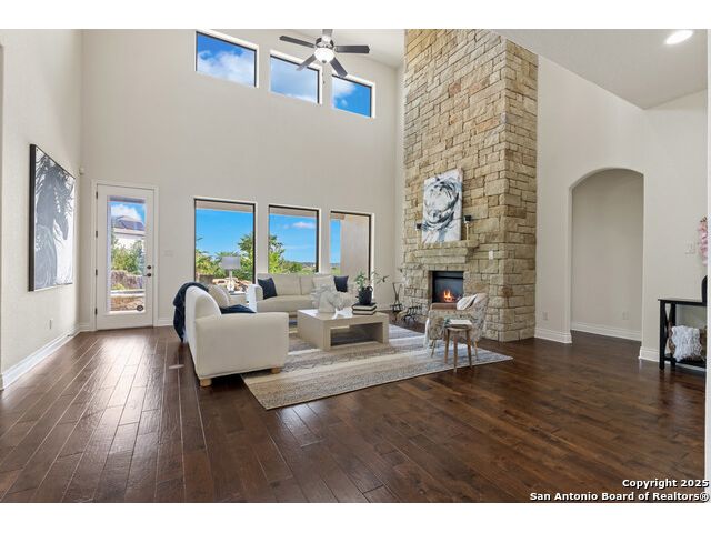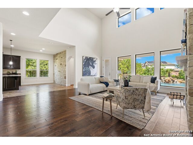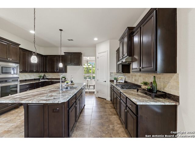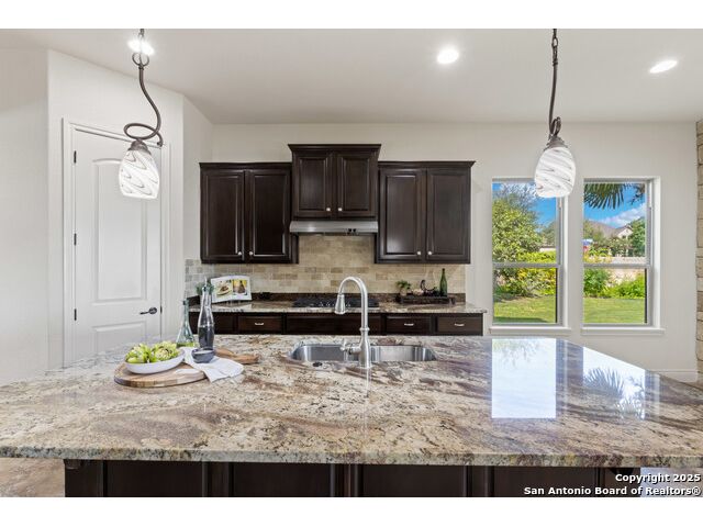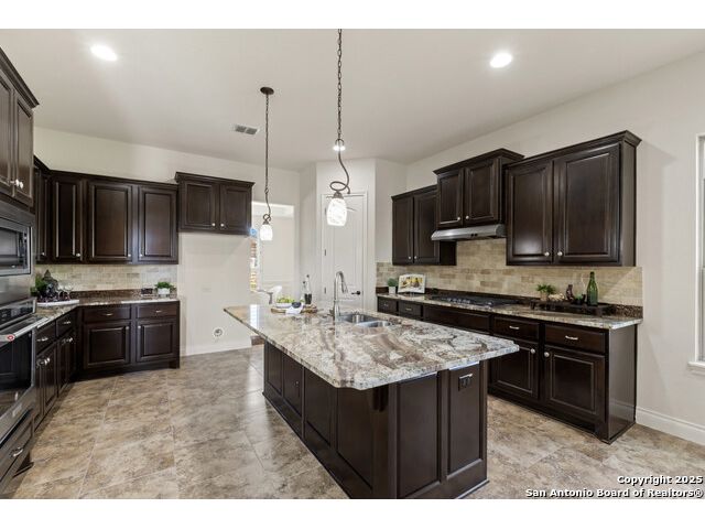 Luxury Living with Hill Country Views at an amazing price!!! Welcome to this stunning Monticello-built masterpiece, on an oversized corner lot at the top of the hill in the prestigious gated community of Hastings Ridge at Kinder Ranch. With unparalleled views, this 5-bedroom, 4-bathroom home offers 4,319 sq ft of thoughtfully designed space where elegance meets everyday comfort. As you approach the home, you're immediately welcomed by a beautifully landscaped front yard featuring lush Zoysia grass, mature crepe myrtle trees, and stately potted plants, all maintained by a full irrigation system-a true first impression of elegance and care. Upon entering, you're greeted by a grand foyer, a striking curved staircase, a private home office, and a formal dining room, setting the tone for the home's sophisticated character. Soaring 10-foot ceilings and an abundance of natural light carry you into the spacious living room-ideal for both entertaining guests and everyday relaxation. The gourmet kitchen is a chef's dream, showcasing high-end granite countertops, custom upgraded cabinetry, stone backsplash, gas cooking, and built-in appliances. You can also enjoy many family meals in the breakfast nook large enough for a 8 person table. The luxurious primary suite is your private sanctuary with sweeping Hill Country views, a spa-inspired bath featuring a mud-set walk-in shower, garden tub, dual vanities, and separate his-and-her closets. A large secondary bedroom and full bath on the main floor is perfect for multigenerational living or guests. Step outside to your private resort-style backyard oasis. Enjoy the large covered patio, outdoor stone fireplace, hot tub, and in-ground pool. This yard is perfect for relaxing evenings or lively gatherings. Don't miss the second-floor "Eagle's Nest" balcony, offering breathtaking panoramic views. Additional highlights include: wood and tile flooring throughout the first floor, a spacious game room with custom shuffleboard and darts, a separate media room with tv and surround sound, fitness equipment included, oversized laundry room with shelving and utility sink, drop zone off the oversized 3-car garage, two water heaters & two HVAC units, whole-home water filtration system, and custom shutters on all front-facing windows. Custom Hunter Douglas motorized shades available for all other windows in the home. This home is located in the highly acclaimed Comal ISD with the elementary, middle and high school that services the neighborhood all within walking distance. Just minutes from Hwy 281, top-tier shopping, dining, and all that North San Antonio has to offer. Hastings Ridge also features fantastic community amenities to include a pool, playground, basketball court, and scenic walking/jogging trails.