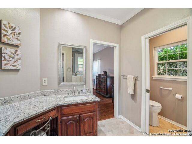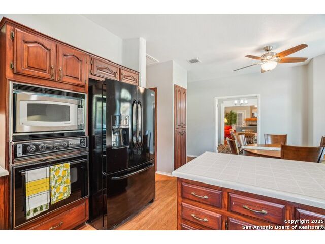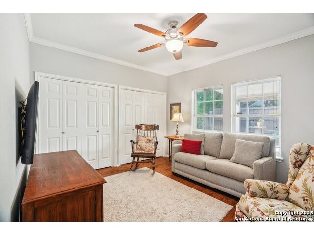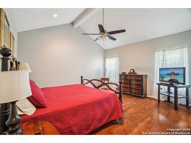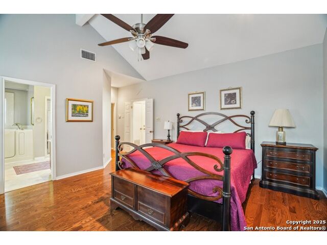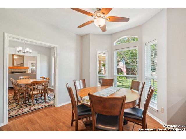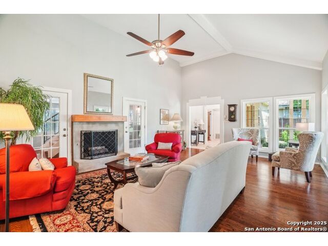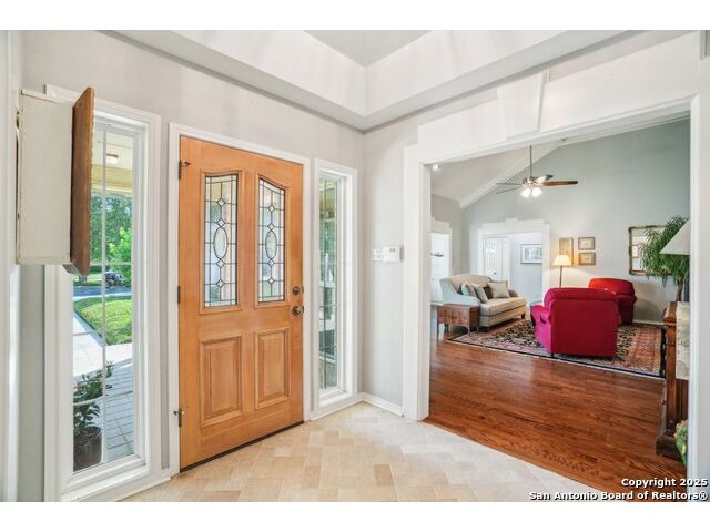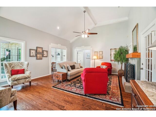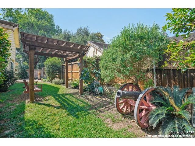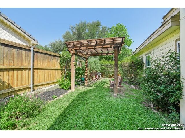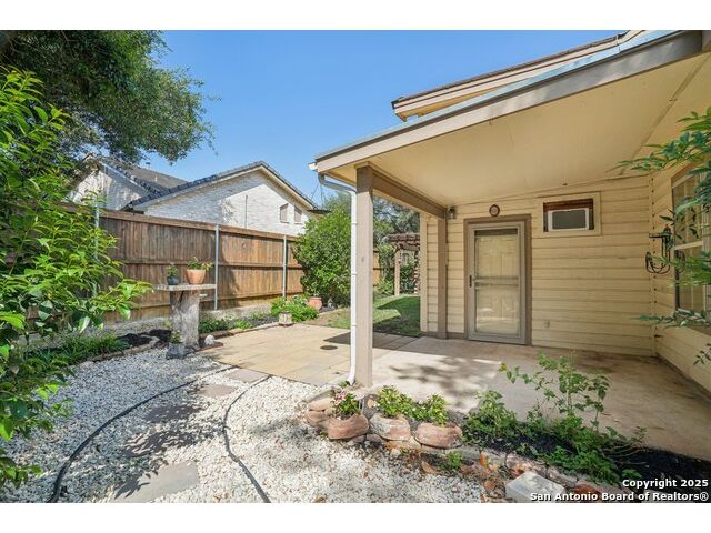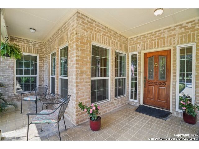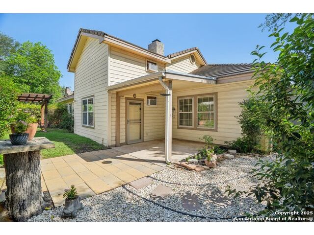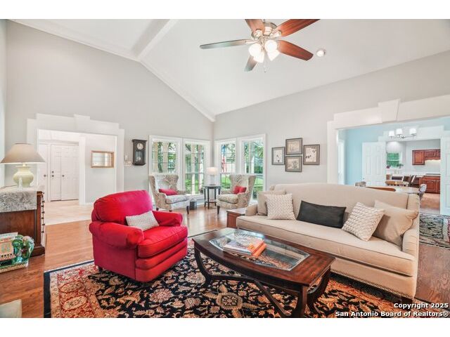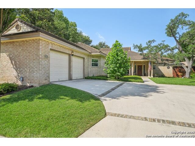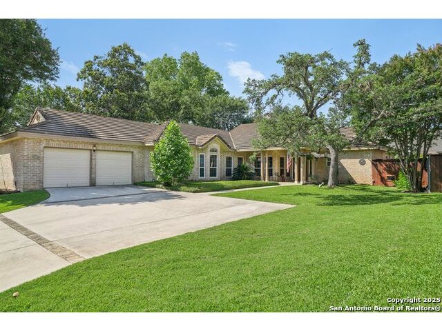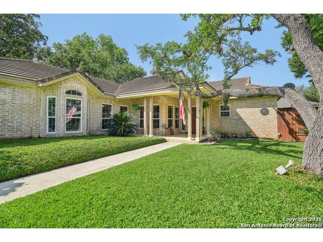 Set on nearly a quarter-acre in a highly sought-after, guarded and gated community, this beautiful 1.5-story home offers comfort, character, and versatility in a serene setting. A perfectly manicured yard framed by mature oak trees welcomes you, along with a breezy front porch, setting the tone for this residence. Step into the light-filled entryway, thoughtfully designed to separate the private primary suite from the rest of the home. To the left, you're greeted by a bright and airy living room with a vaulted ceiling and a cozy fireplace. Just off the living room is a generously sized flex room, offering versatility as a second living area, office, media or game room. As an added feature, a staircase leads to a private loft above, perfect as a creative space, hobby area, or personal library. The heart of the home flows from the main living area into a formal dining room, then into the breakfast room, adjoined to the kitchen - creating an ideal gathering space. The kitchen features solid wood cabinetry, tiled countertops, a gas stovetop, and a charming window over the sink - a functional and inviting space for everyday living. Three well-sized secondary bedrooms and a spacious full bathroom are located in their own wing, offering privacy and comfort for loved ones or guests. On the opposite side of the home, the primary suite is a true retreat, complete with a vaulted ceiling, large walk-in closet, and a beautifully appointed bath featuring a double granite vanity, walk-in shower, adaptive garden tub, and plenty of storage. The backyard is equally impressive with a covered patio, additional paved area, pergola with swing, and a lush landscape full of vibrant foliage - ideal for relaxing and entertaining. With close proximity to Loop 410 and access to all the conveniences of North San Antonio, this home offers the perfect blend of peaceful living and everyday practicality.