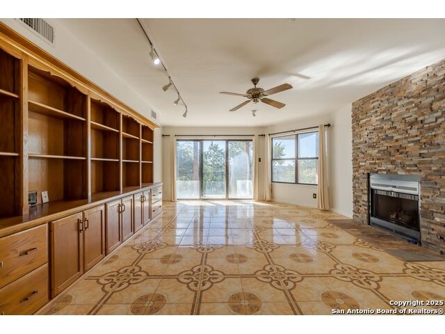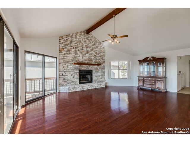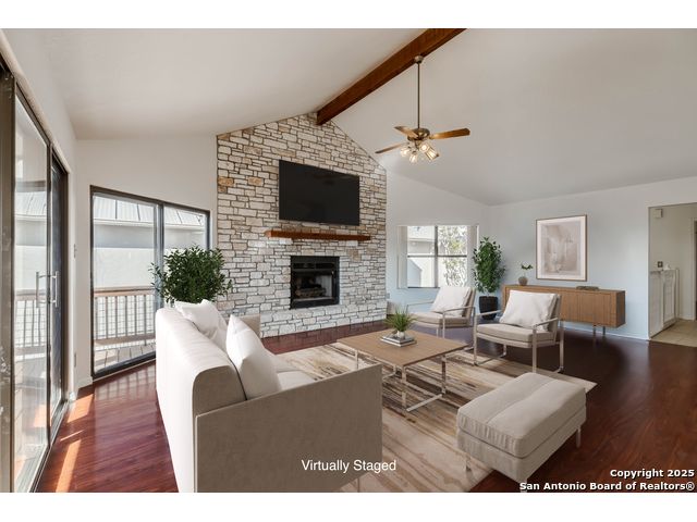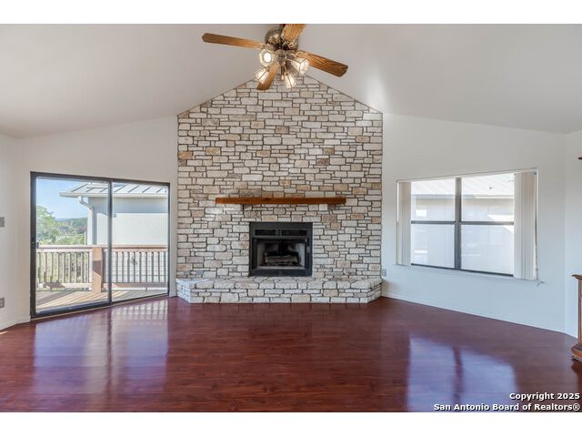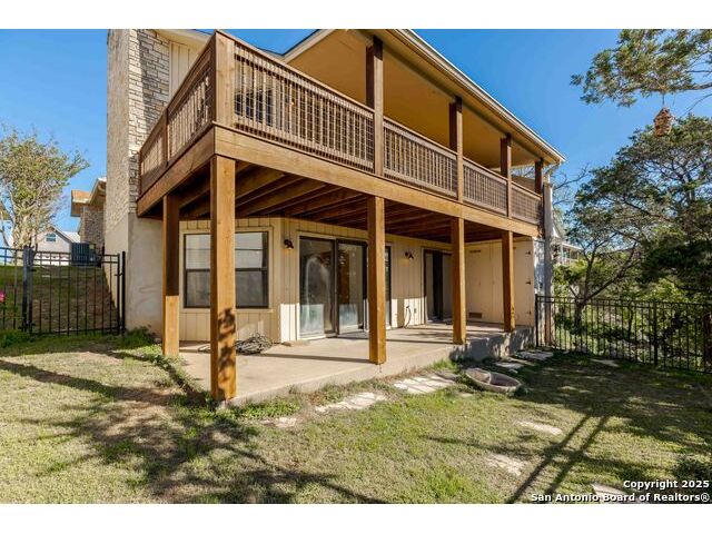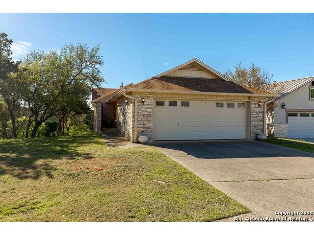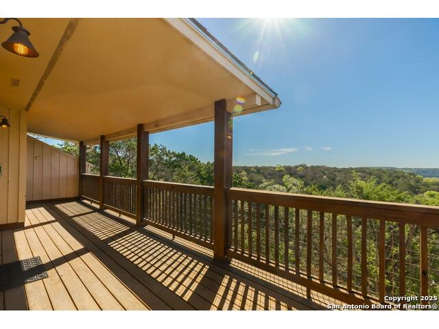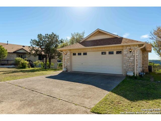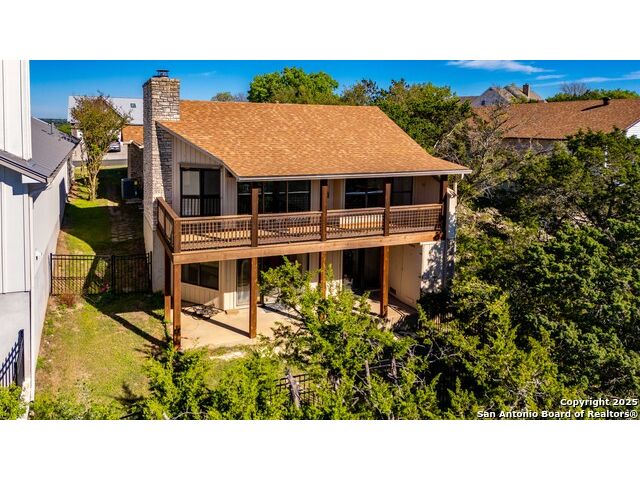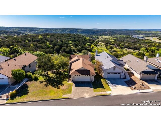 Enjoy Breathtaking Hill Country Views! If you've been searching for the perfect view, this is it! Take in the spectacular southeast panorama of the Texas Hill Country-perfect for afternoon relaxation without the harsh sun. The main level features the updated primary suite, a convenient half bath, an open kitchen, a laundry closet, and a welcoming living room with fireplace. Downstairs, you'll find a spacious second living area that can easily serve as a bedroom, office, or guest suite. Complete with built-in cabinetry, a cozy fireplace, and direct access to the covered patio, this space is ideal for entertaining or quiet retreats. Both lower-level rooms open to the outdoors, bringing in the beauty of the view. Recent updates include a NEW Class 3 impact-resistant roof with a transferrable warranty from local Cypress Roofing, brand-new gutters, and a new garage door on the way. All this, plus a location close to shopping, medical facilities, restaurants, and entertainment-with quick access to I-10. Come and See!!