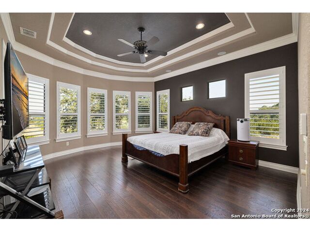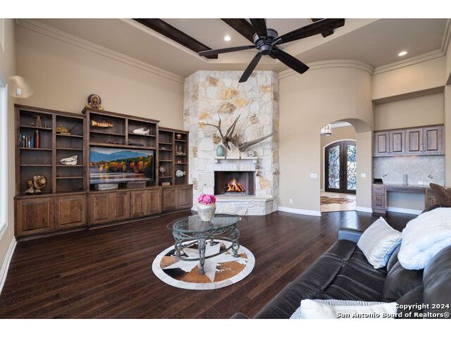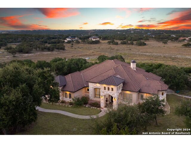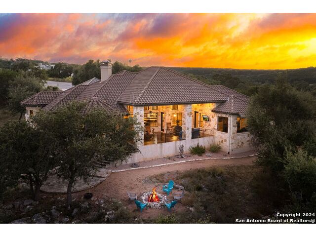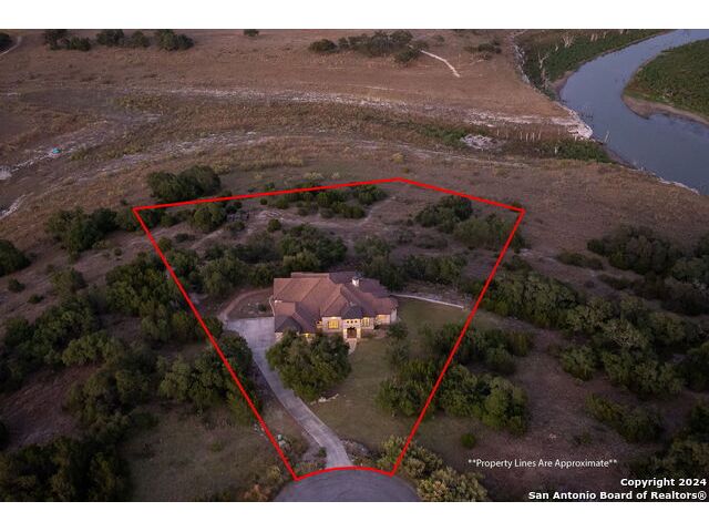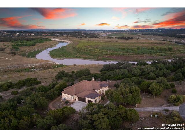 Presenting an exquisite 2.98-acre luxury estate on the waterfront, located in the highly sought-after gated community of Cordova Bend. With 513 feet of private Guadalupe River shoreline along Canyon Lake, this home offers the perfect combination of refined living and natural Hill Country beauty. Crafted by renowned builder Jimmy Jacobs, this single-story residence includes 3 generously sized bedrooms and 3 meticulously designed bathrooms. The spacious living area features a grand floor-to-ceiling stone fireplace and stunning wood floors, creating an atmosphere of warmth and sophistication. Large windows and a multi-room audio system throughout the home flood the space with light and ambiance. Enjoy sweeping views of Canyon Lake and the surrounding landscape. The open-concept layout seamlessly incorporates custom built-in wood shelving, enhancing both form and function. The gourmet kitchen, equipped with high-end appliances, custom cabinetry, and extensive counter space, is a dream for any chef. Just off the kitchen is a cutting-edge media room with a wet bar and expansive views, making it perfect for entertaining. The home also includes a quiet, private office offering an ideal work-from-home environment. The primary suite is a true retreat, with tray ceilings and a luxurious en suite bathroom featuring an expansive walk-through shower. The additional bedrooms are designed for both privacy and comfort, offering ample space for family and guests. Outside, the gently sloping grounds lead down to the water, where a charming lakeside fire-pit and a tree swing provide the perfect spot to enjoy tranquil evenings. Wildlife can often be seen roaming the property and the lake creates a stunning natural backdrop. This custom estate offers a perfect blend of rustic charm and modern luxury, making it ideal for those seeking a premier waterfront lifestyle in the Hill Country. This home invites both relaxation and adventure in a truly one-of-a-kind setting.