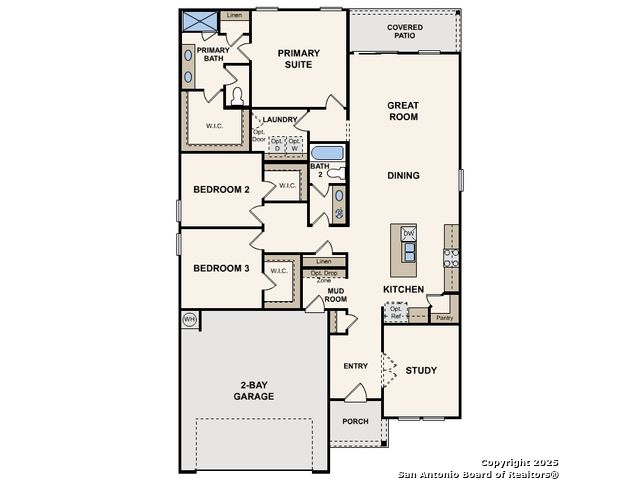 The Bowie at Cinco Lakes harmonizes style and function in a one-story design. The entrance foyer opens to a spacious open-concept great room, incorporating a dining area, living space, and a well-appointed kitchen with an island and corner pantry. This central hub extends to a covered patio for seamless indoor-outdoor living. Adjacent to the living area, a convenient laundry room and a dedicated mud room enhance the home's practicality, while a study at the front of the home offers flexibility. Two centrall