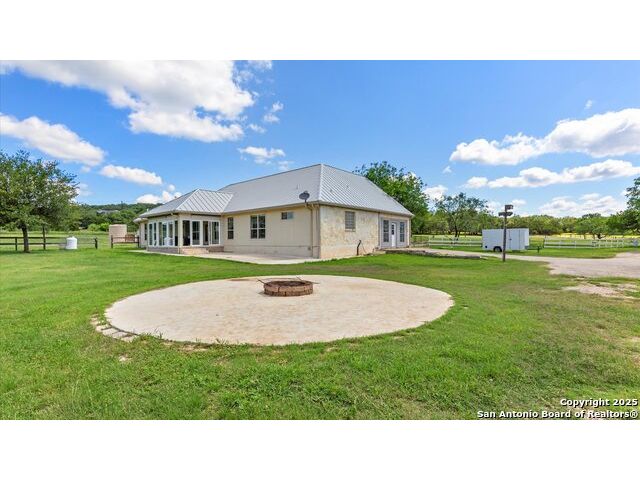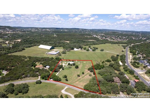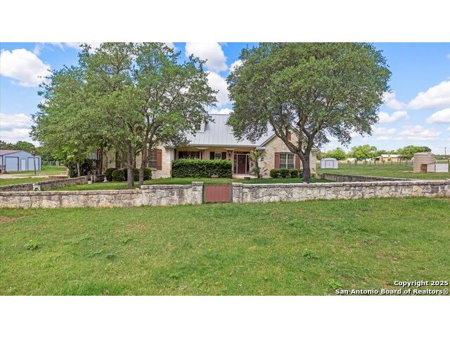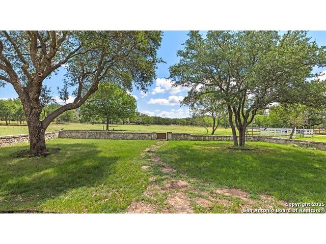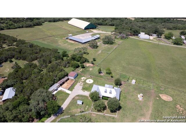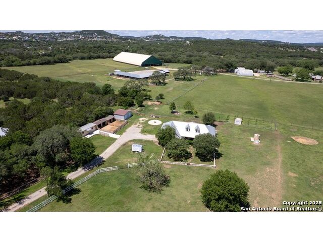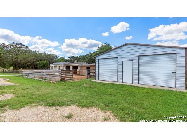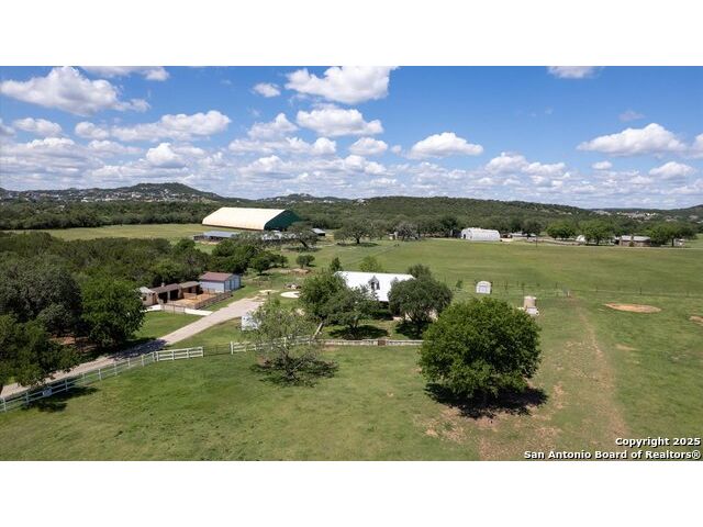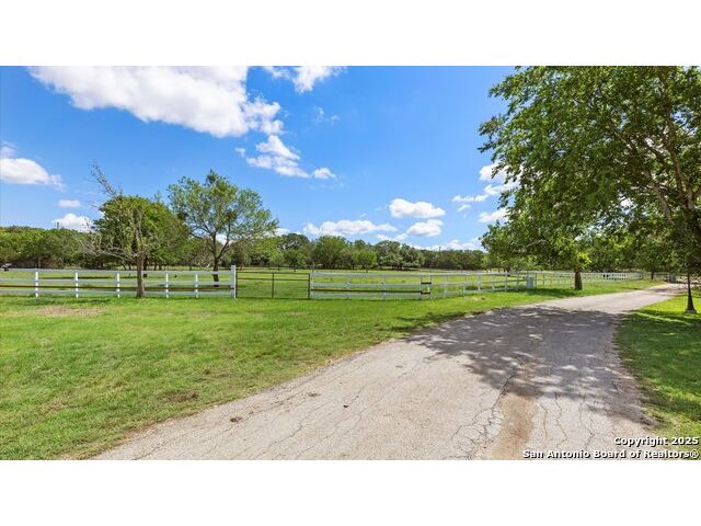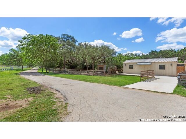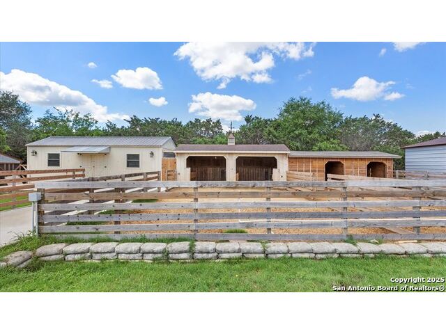 Nestled in the tranquil Texas Hill Country, 24935 Pecan Creek Lane presents a rare opportunity to own a luxurious 5-acre mini-ranch just minutes from San Antonio's premier dining, shopping, and entertainment destinations. A long, gated private driveway welcomes you home, flanked by classic white farm fencing and open views of lush green pastures dotted with mature oak trees. The meticulously maintained single-story home blends comfort and craftsmanship with hardwood floors, custom wood accents, and a flowing open floor plan. The kitchen features granite countertops, stainless steel appliances, and a breakfast bar, ideal for entertaining or everyday living. Additional highlights include a fully enclosed patio, a climate-controlled bonus room above the garage, and an enclosed two-car garage. Equestrian and agricultural amenities abound, including a two-stall horse barn with extension, a 32' x 12' tack/feed barn with electricity, a 26' x 21' metal building, and an enclosed chicken coop. Recent improvements include a new well pump with a 2,500-gallon holding tank, a 10' x 13' storage shed, and extensive concrete work throughout the property. Backing up to a 60-acre horse ranch, this peaceful retreat offers exceptional privacy and sweeping countryside views-perfect for equestrian enthusiasts or those seeking a serene, rural lifestyle with city conveniences just a short drive away.