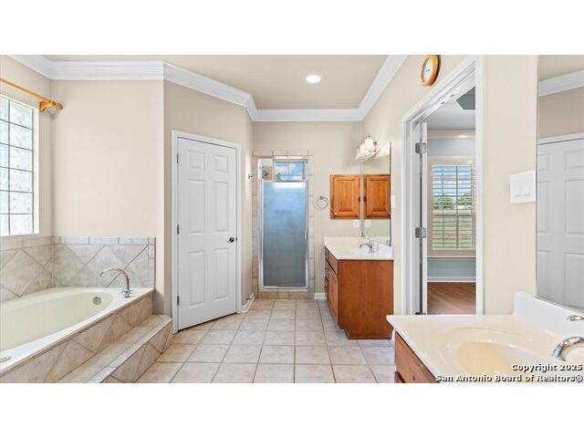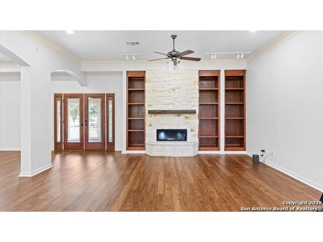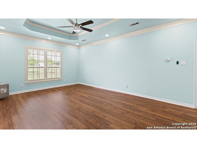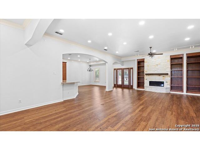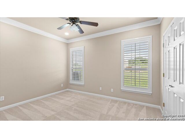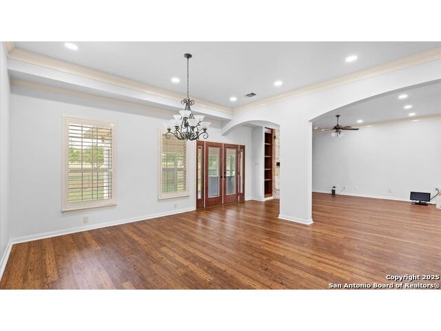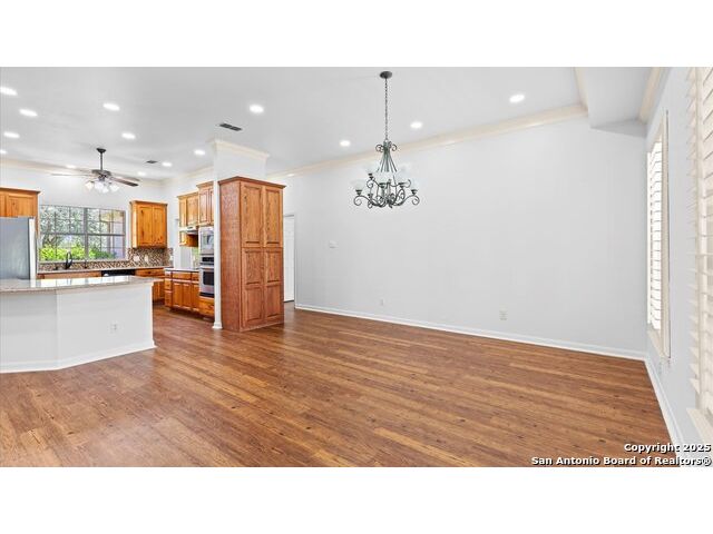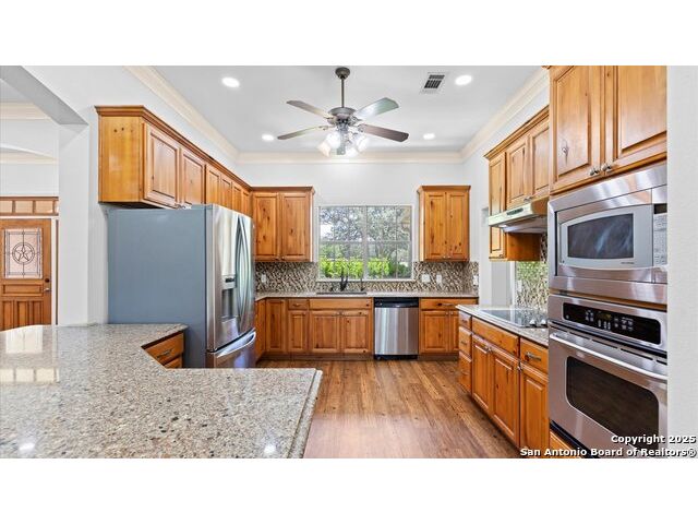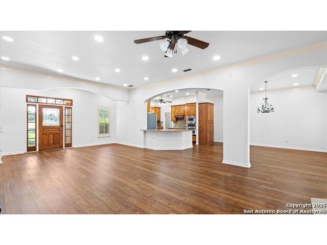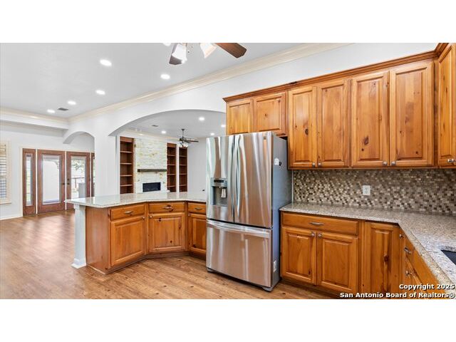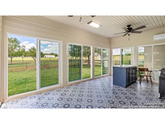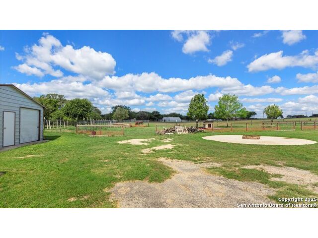 Nestled in the tranquil Texas Hill Country, 24935 Pecan Creek Lane presents a rare opportunity to own a luxurious 5-acre mini-ranch just minutes from San Antonio's premier dining, shopping, and entertainment destinations. A long, gated private driveway welcomes you home, flanked by classic white farm fencing and open views of lush green pastures dotted with mature oak trees. The meticulously maintained single-story home blends comfort and craftsmanship with hardwood floors, custom wood accents, and a flowing open floor plan. The kitchen features granite countertops, stainless steel appliances, and a breakfast bar, ideal for entertaining or everyday living. Additional highlights include a fully enclosed patio, a climate-controlled bonus room above the garage, and an enclosed two-car garage. Equestrian and agricultural amenities abound, including a two-stall horse barn with extension, a 32' x 12' tack/feed barn with electricity, a 26' x 21' metal building, and an enclosed chicken coop. Recent improvements include a new well pump with a 2,500-gallon holding tank, a 10' x 13' storage shed, and extensive concrete work throughout the property. Backing up to a 60-acre horse ranch, this peaceful retreat offers exceptional privacy and sweeping countryside views-perfect for equestrian enthusiasts or those seeking a serene, rural lifestyle with city conveniences just a short drive away.