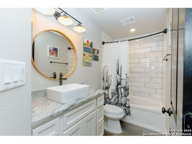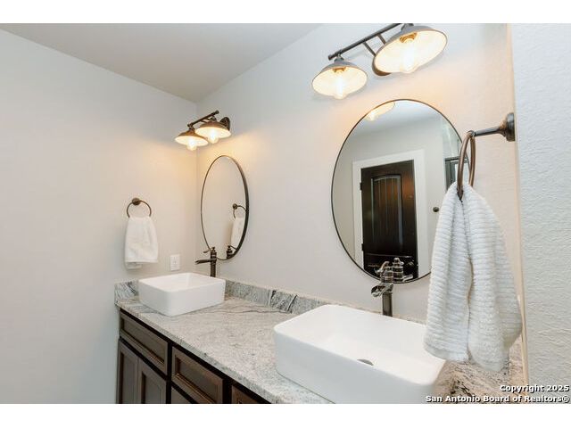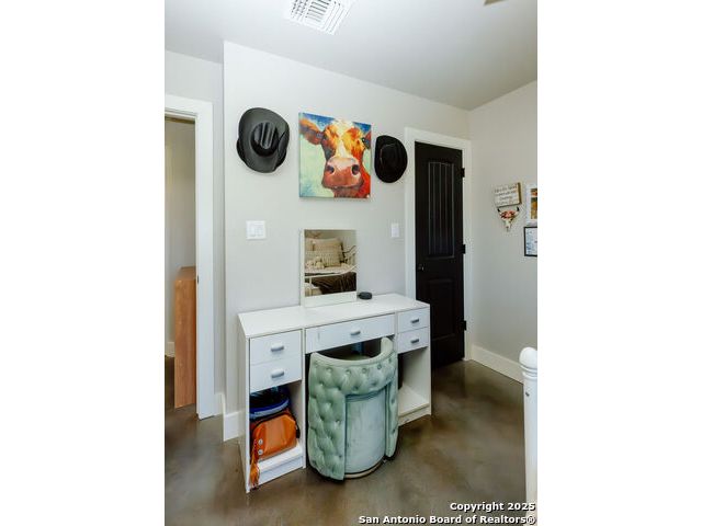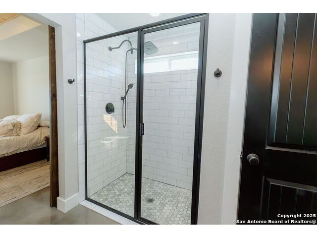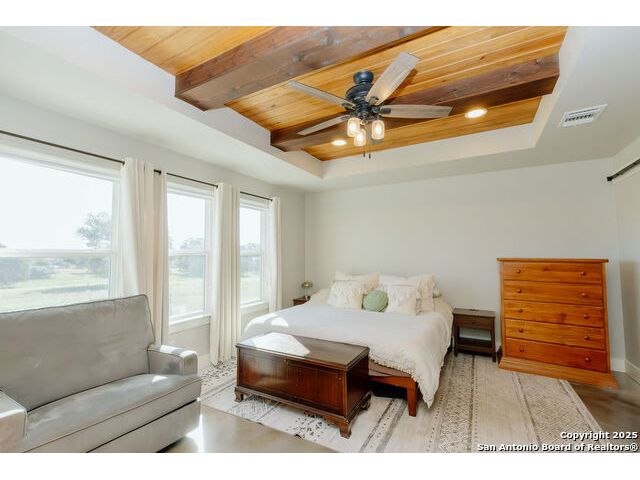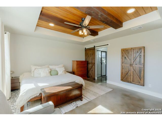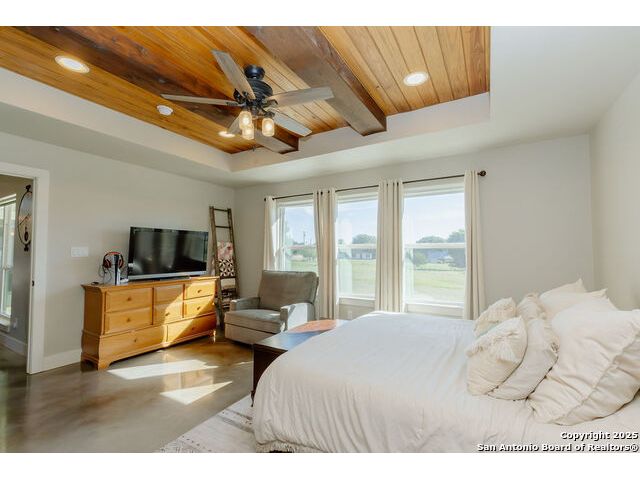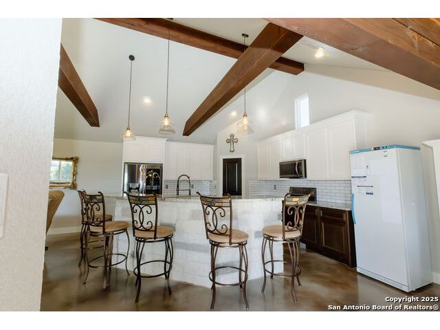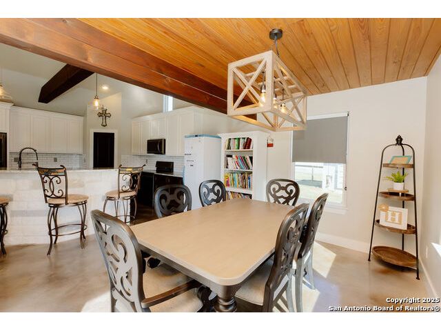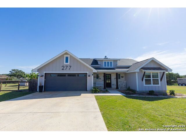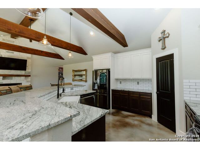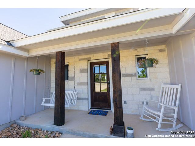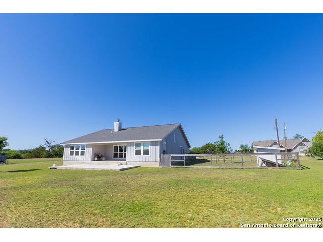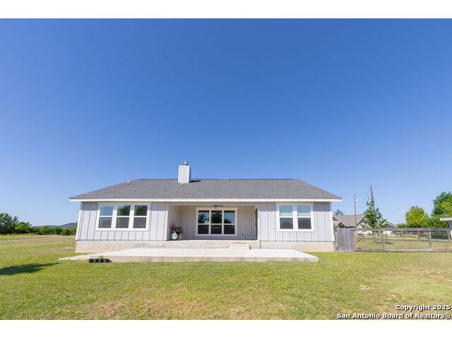 Welcome to this immaculate single-story Texas Hill Country home nestled in the desirable Flying L Ranch community. Situated on nearly half an acre across two lots, this 3-bedroom, 2-bath residence offers a harmonious blend of modern comfort and rustic charm. Step inside to discover an open-concept layout featuring soaring ceilings and stained concrete floors throughout. The gourmet kitchen boasts custom wood cabinetry, granite countertops, a breakfast bar, and stainless steel appliances-perfect for culinary enthusiasts. The spacious living area is anchored by a cozy wood-burning fireplace, creating an inviting atmosphere for gatherings. Retreat to the luxurious primary suite, complete with a double vanity, walk-in shower, garden tub, and an expansive walk-in closet. Additional highlights include a covered front porch and back patio ideal for entertaining, a fenced side yard for pets, and a 2-car attached garage equipped with plumbing for a dog wash station. Residents can purchase memberships to the Flying L Ranch. The amenities include a swimming pool, tennis courts, and basketball courts and more. Located within the Bandera ISD, this home offers the perfect blend of tranquility and convenience.