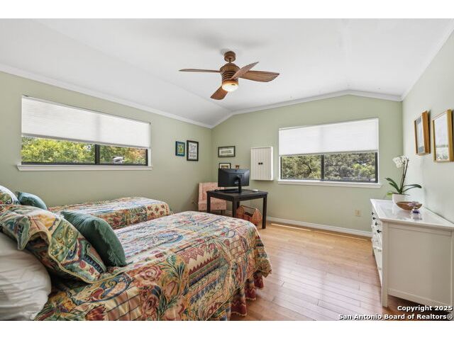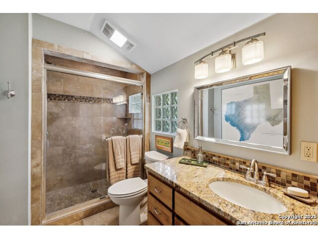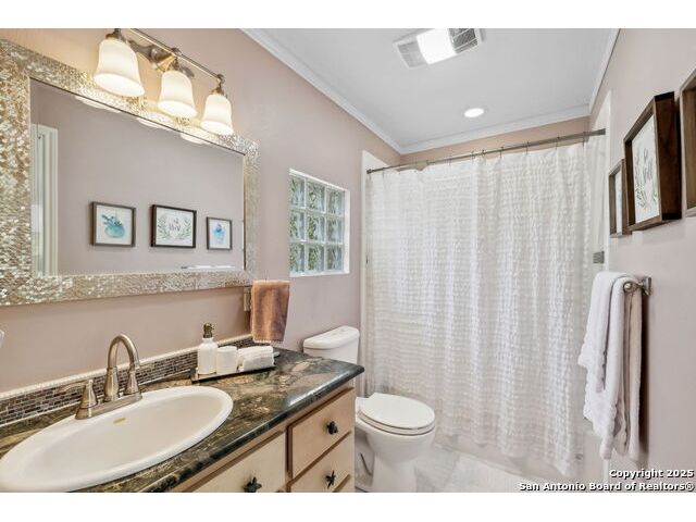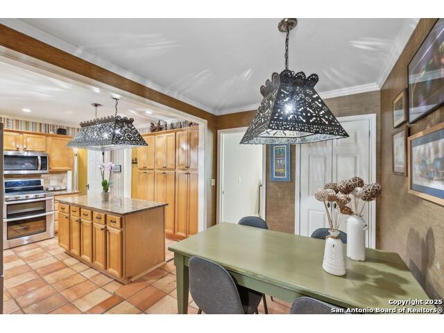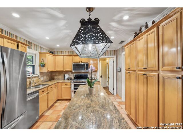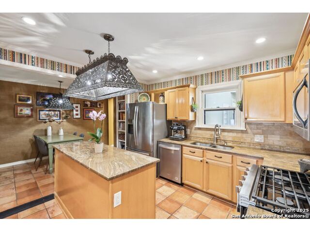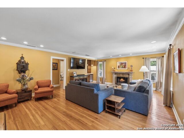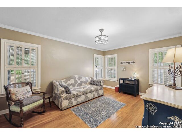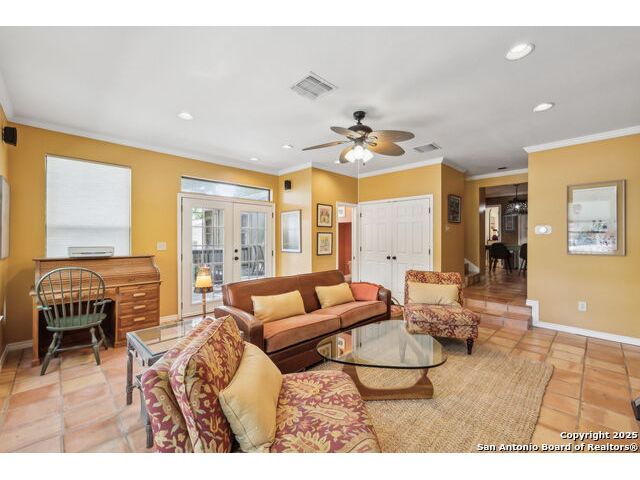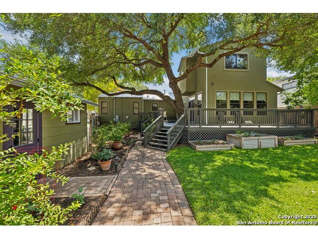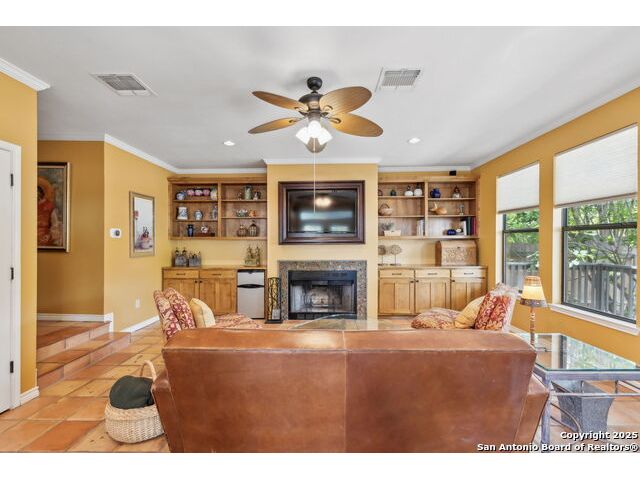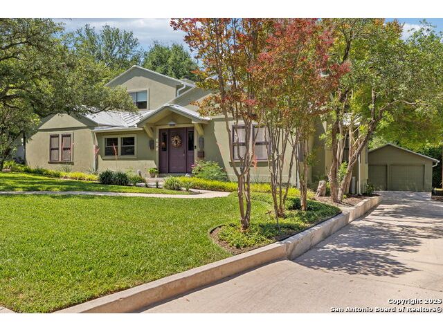 Alamo Heights location within AHISD * Close to Sunset Ridge Shopping Center, Central Market, the Pearl District, and Downtown San Antonio 261 E Fair Oaks Pl is a beautifully updated 4-bedroom, 4.5-bath home offering approximately 2,922 square feet of inviting living space on a tree-lined street in the heart of Alamo Heights. Thoughtful 2024-2025 improvements include freshly painted interiors (July 2025), updated lighting (June 2025), enhanced insulation, and a new HVAC system with UV filtration (June 2025) to help reduce allergens. Additional upgrades include a 2024 A/C unit, prior HVAC enhancements (2023), new roof and gutters (2025), and new sod that enhances curb appeal and outdoor comfort while preserving the home's mid-century warmth and character. The living room features hardwood floors, crown molding, and a limestone fireplace anchored by custom cabinetry and a built-in bar with wine fridge. The updated kitchen offers granite countertops, stainless appliances, a gas range, and generous cabinet storage adjoining a cozy dining nook. A spacious family room with Saltillo tile and window walls opens to a large deck-ideal for outdoor dining or entertaining beneath mature oaks. The floor plan includes two living areas, four bedrooms, and 4.5 baths, including a guest suite on the main level and a thoughtfully separated primary suite upstairs with a walk-in closet and dual-sink bath. A flex office niche, indoor laundry room, and built-in storage add everyday functionality. Outside, the fenced backyard features raised garden beds, lush lawn, and a detached two-car garage with epoxy flooring and an extended driveway for extra parking. Mature trees and privacy landscaping frame a setting that's both inviting and versatile-offering space for relaxation or a future pool. Located just minutes from Sunset Ridge Shopping Center, Central Market, Alamo Quarry Market, and numerous cafes and restaurants along Broadway and Austin Highway. Convenient access to Olmos Basin Park, Brackenridge Park, and The Pearl District connects everyday living to shopping, dining, and recreation throughout central San Antonio.