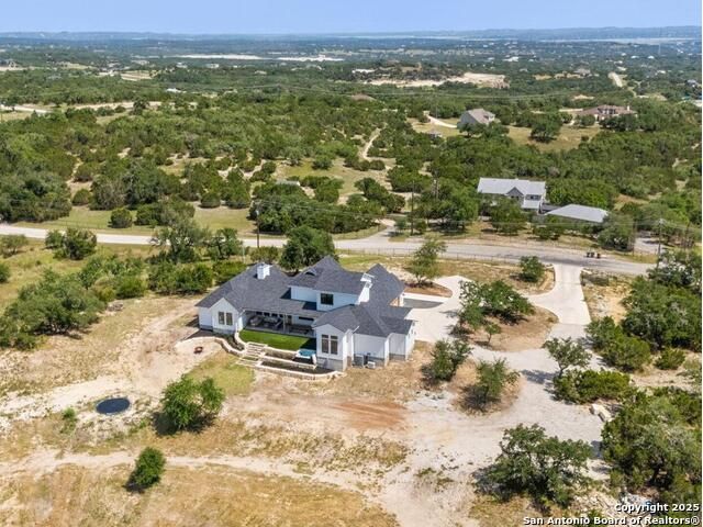 Welcome to 837 Mystic Breeze, an exceptional modern farmhouse built in 2023, nestled atop a hillside in the prestigious Mystic Shores community in the TX Hill Country. This 5-bedroom, 4-bathroom custom home offers 4,112 sq ft of beautifully designed living space on a serene 5.14-acre lot, blending luxury, comfort, and sweeping Hill Country views. The property welcomes you with a gated entrance, oak trees, and sustainable rock landscaping. Inside, tall ceilings with exposed wood beams, expansive windows, and wide-plank wood flooring create a warm and open atmosphere filled with natural light. The heart of the home is the spacious living and dining area anchored by a wood-burning fireplace with gas start. Perfect for entertaining, the open-concept layout flows seamlessly into a gourmet kitchen featuring quartz countertops, an oversized island, propane gas cooktop, electric double ovens, pot filler, farmhouse sink, microwave, dishwasher, and custom cabinetry. A generous butler's pantry adds functionality with custom cabinets, shelving, and a built-in coffee and tea bar. Designer lighting and ceiling fans throughout the home add a polished, cohesive feel. The primary suite is a peaceful retreat with a sitting area, high ceilings, and large windows framing spectacular views. The luxurious en-suite bath offers dual vanities, two walk-in closets, and a spa-style walk-through tiled shower with dual shower heads. A rare highlight is the glass-enclosed dry sauna-ideal for relaxation and wellness. Thoughtfully designed for convenience, the home also features a large laundry room with lots of space for a washer, dryer, refrigerator or freezer, plus a utility sink and custom cabinetry. A mudroom off the garage entrance includes built-in storage with coat hooks and drawers. Outdoor living shines here, with a spacious covered patio perfect for both lounging and dining. The upper backyard includes turf grass, outdoor string lighting, and hot tub, offering an inviting space to unwind while enjoying stunning views. Tiered flower beds and stone stairs lead to the lower yard with fire pit, enhancing the natural beauty of the landscape. Located in Mystic Shores-one of the Hill Country's premier communities-residents enjoy world-class amenities including two swimming pools, pickleball, tennis, basketball, and volleyball courts, a community center, two lakeside parks with grilling and picnic areas, and a 200+ acre nature preserve. 837 Mystic Breeze is more than just a home-it's a lifestyle, offering privacy, elegance, and an unparalleled Hill Country setting just minutes from Canyon Lake. Don't miss the opportunity to make this one-of-a-kind retreat your own.