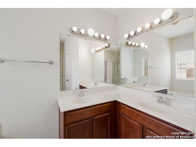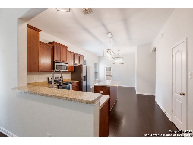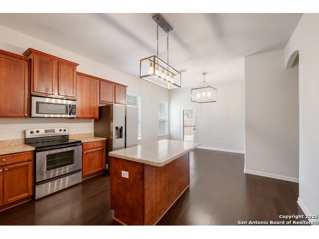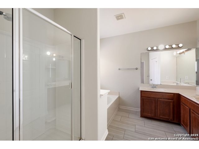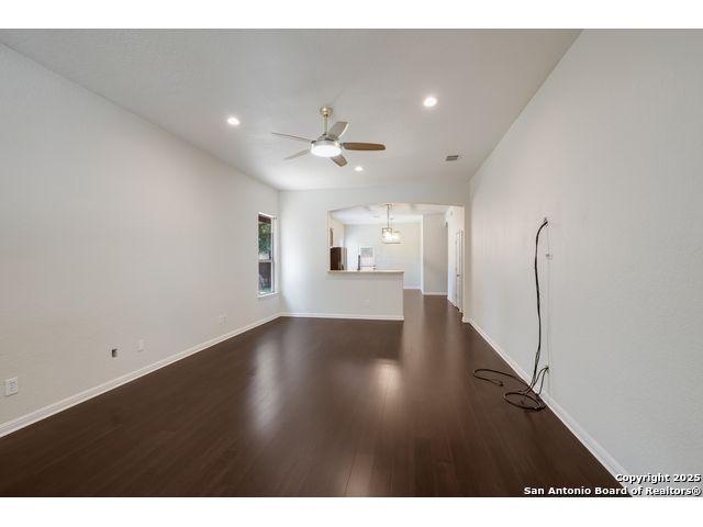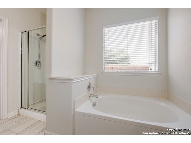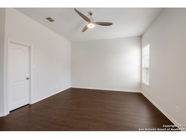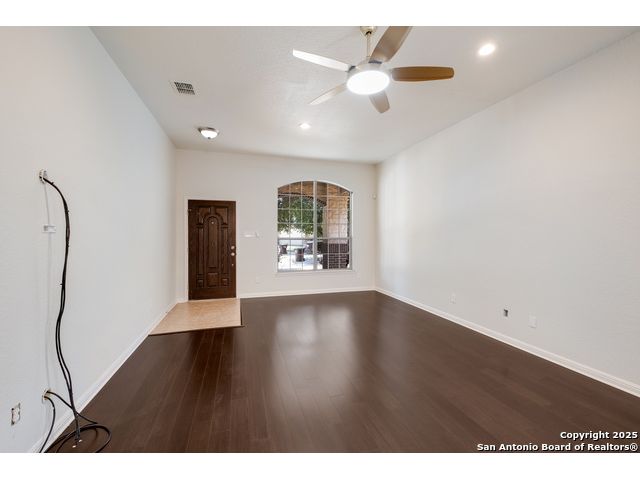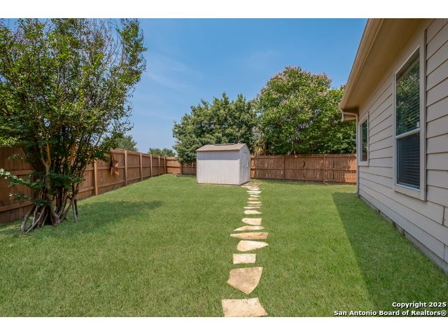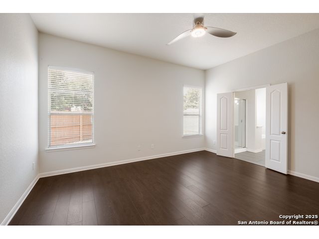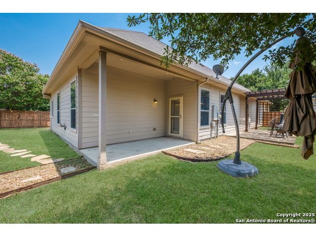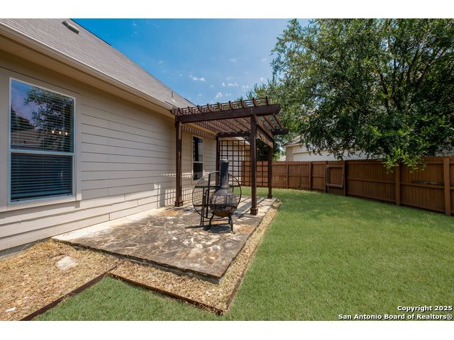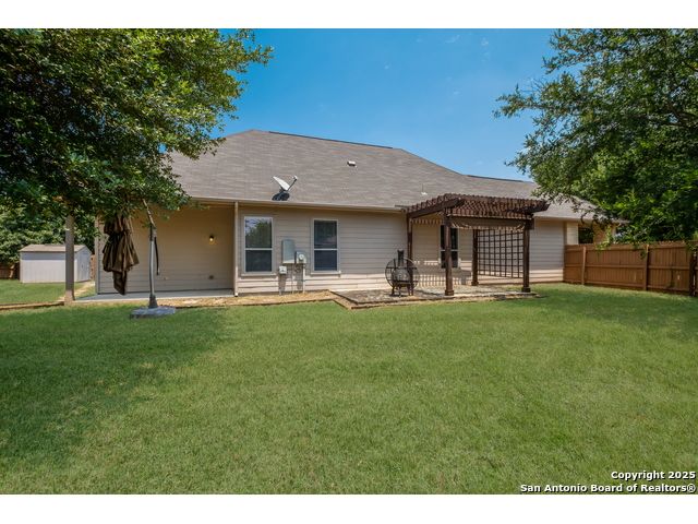 Charming Single-Story Home in Gated Community - Move-In Ready! Discover this beautifully maintained 3-bedroom, 2-bathroom home located on a quiet cul-de-sac in a desirable gated neighborhood. This inviting property features 9-foot ceilings, espresso hardwood floors, recessed lighting, and elegant finishes throughout. Enjoy a bright, open living space highlighted by a large arched window and a champagne remote-controlled ceiling fan that adds style and comfort. The kitchen is a true standout with ample cabinetry, stainless steel appliances, a central island, nickel-finished pendant lighting, and a refrigerator included-perfect for move-in convenience. The spacious primary suite offers a modern remote-controlled ceiling fan, walk-in closet, and a luxurious bath with dual vanities, a deep garden tub, and a separate walk-in shower. Two additional bedrooms include carpeted flooring, ceiling fans, windows, and generous closet space. The outdoor area is fully equipped for enjoyment with pergola, covered patio, and a storage shed-ideal for relaxing or entertaining.