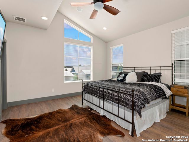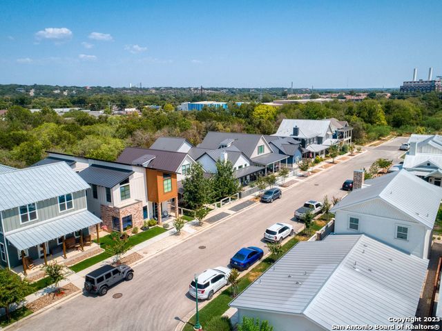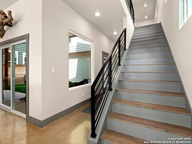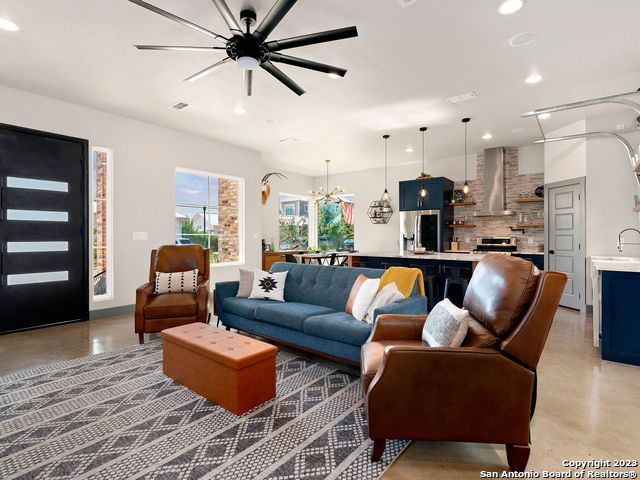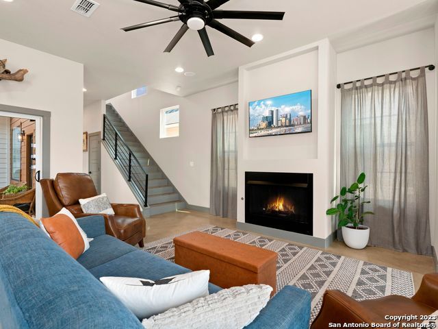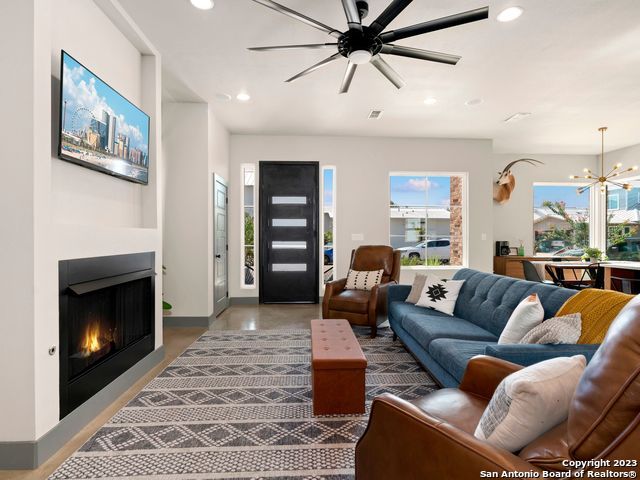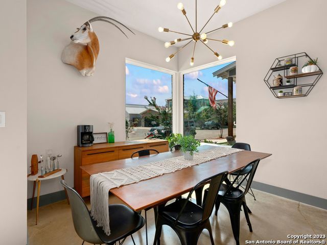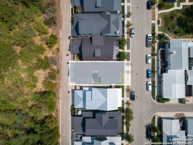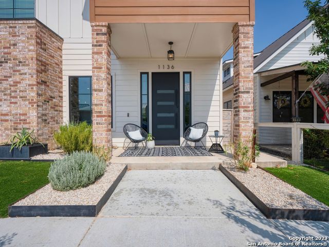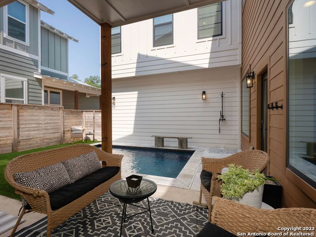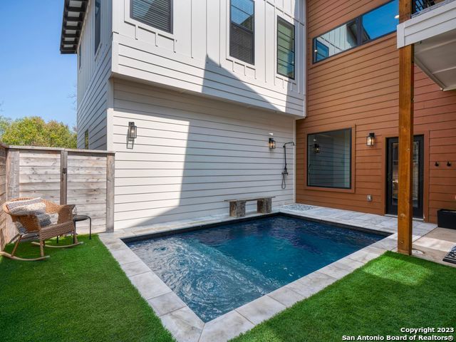 Tucked into one of New Braunfels' most sought after neighborhoods, this exceptional two story modern home blends sleek design with the charm of a tight knit community. Designed with everyday luxury in mind, the open concept floor plan flows effortlessly between the living, dining, and kitchen areas, enhanced by soaring ceilings, abundant natural light, and premium finishes throughout. At the heart of the home, the chef inspired kitchen features a unique garage door window that opens directly to the outdoor entertaining space, perfect for serving drinks by the pool. A whole home surround sound system enhances both indoor gatherings and outdoor relaxation. The primary suite offers a peaceful retreat with a spa inspired en suite bath, featuring a spacious walk in shower, dual vanities, and a generous walk in closet. Upstairs, you'll find well sized secondary bedrooms and a flexible loft area ideal for a home office, game room, or media lounge. An additional space above the secondary bedrooms is prepped for finish out with A/C and electricity. Step outside to your own private backyard oasis, featuring a 10x15 heated plunge pool that can be enjoyed year round. The low maintenance turf lawn adds ease and beauty to the space, while the oversized garage provides ample storage or room for a golf cart. With a walkable location near local shops and restaurants, and a layout designed for both everyday comfort and stylish entertaining, this home truly captures the quintessential New Braunfels lifestyle.