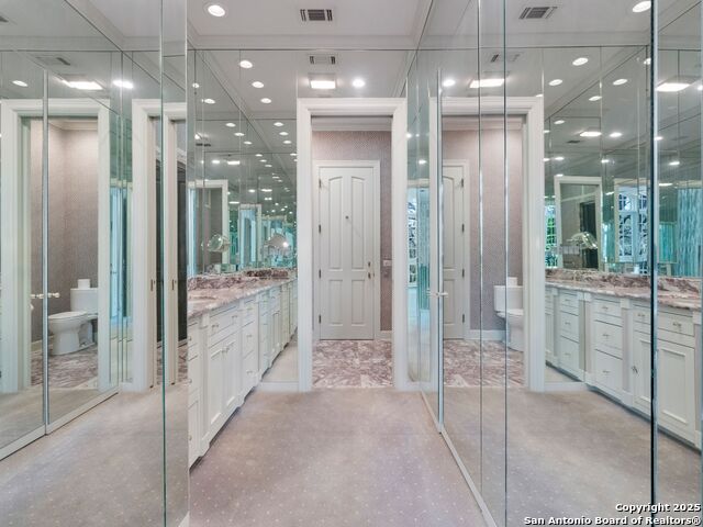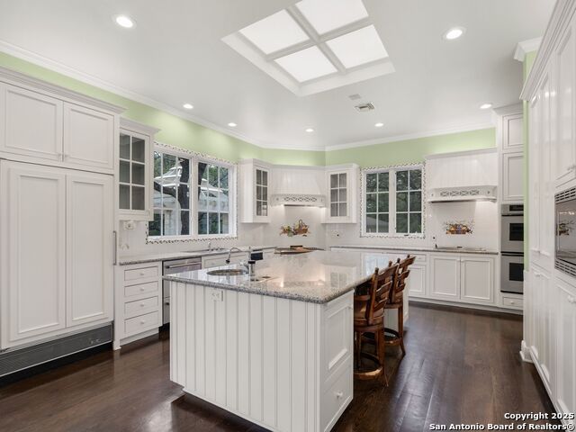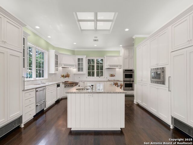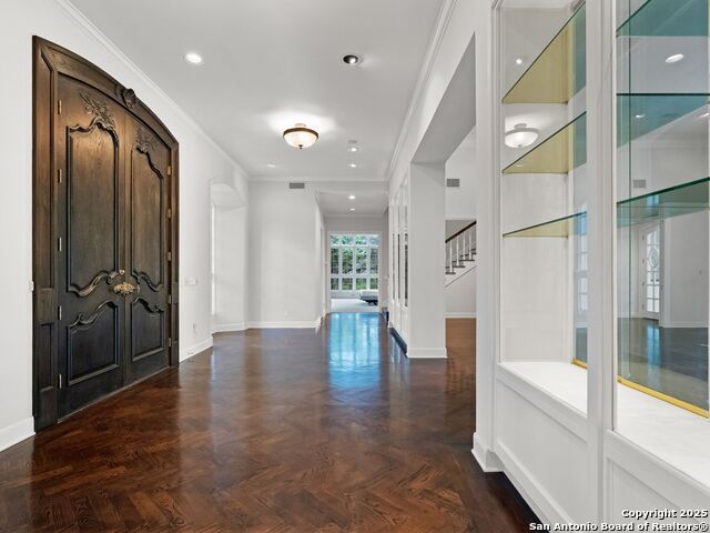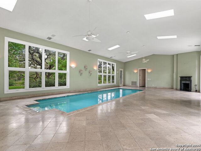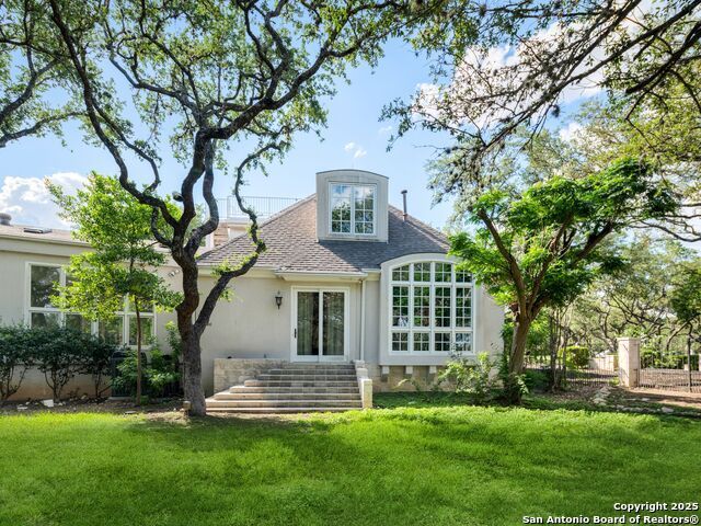 Privately nestled on a prominent corner lot in the heart of Hill Country Village, this estate spans 5.4 acres of mature oaks and manicured grounds, offering an unparalleled sense of privacy and space just minutes from the city. A dramatic pond with a central fountain anchors the landscape, creating a park-like setting that evokes the calm and stillness of a zen garden, where nature and design blend in quiet harmony. The residence unfolds with a thoughtful layout designed to accommodate both everyday living and large-scale entertaining. Light-filled interiors are met with timeless finishes and impressively scaled rooms, creating a setting of understated elegance. A blend of formal and casual spaces offers flexibility throughout, while the layout allows for both openness and separation. The main residence is complemented by separate quarters, ideal for extended guests or additional functional space, finished with traditional Saltillo tile. At the center of the home lies a spacious indoor pool and entertainment lounge, a true year-round retreat that transforms easily from quiet respite to vibrant gathering space. Five garage bays accommodate car enthusiasts or multi-generational living needs. The home is connected to city water, with a private well supporting irrigation. Fully fenced and gated, the grounds provide peace of mind and total privacy. With its rare combination of usable acreage, private infrastructure, and irreplaceable location, this estate offers a singular opportunity within one of San Antonio's most coveted areas. A property of this scale and setting is seldom available and impossible to replicate.