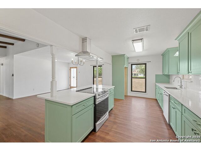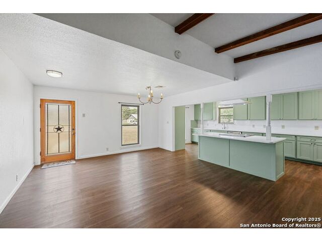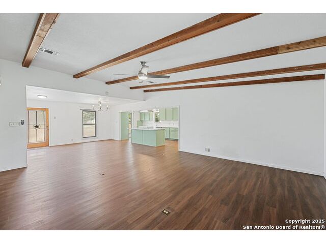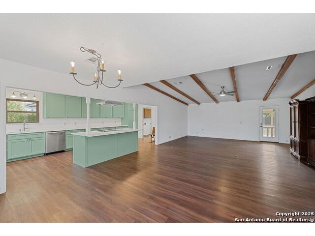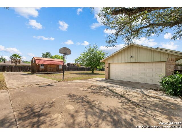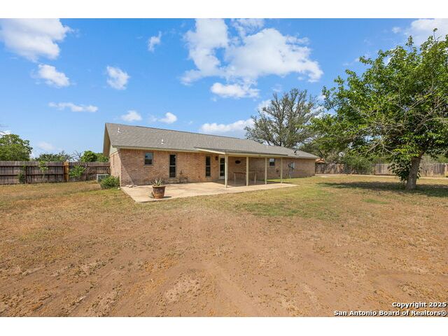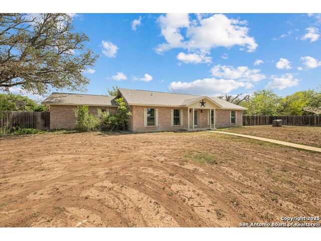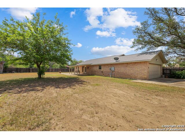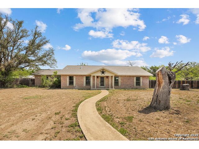 Welcome to this beautiful, recently remodeled home in the highly sought after neighborhood of Kollman Oaks in Hondo!! The large, open kitchen has custom cabinetry with tons of storage space including pull-out storage drawers in the pantry. Just as expansive are beautiful quartz countertops providing ample room if you're a baker or plenty of area for food prep and serving!! The kitchen overlooks the combo dining and living area, making it great for hosting gatherings! The spacious living area has a vaulted ceiling and wood beam accents. A back door in the living area opens out to a large covered back patio and a huge back yard that is privacy fenced with an alley entrance onto a concrete drive leading to the garage and includes a spacious storage building or flex space. The huge front yard is a blank space with endless possibilities as well as a circle driveway for additional parking! This is a wonderful, spacious home on a huge lot in a beautiful subdivision! Note: There are several trees in the yard that have been cut down due to Oak Wilt. Entertainment center is negotiable.
