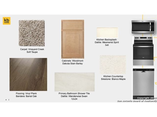 Experience modern living in this stylish home featuring 9-ft. first-floor ceilings and a bright, open layout. The kitchen boasts Whirlpool stainless steel appliances, Woodmont Dakota Shaker 42-in. cabinets, a Daltile tile backsplash, Silestone Blanco Maple countertops, and an extended breakfast bar perfect for casual dining. The primary bath offers a raised vanity, upgraded cabinets, and a sleek 42-in. shower with Daltile tile surround. Durable vinyl plank flooring enhances the bathrooms, kitchen, and living room. Thoughtful touches include a Carrara-style entry door, soft water loop, and wireless security system. Outside, enjoy a fully sodded yard with an automatic sprinkler system for easy maintenance.