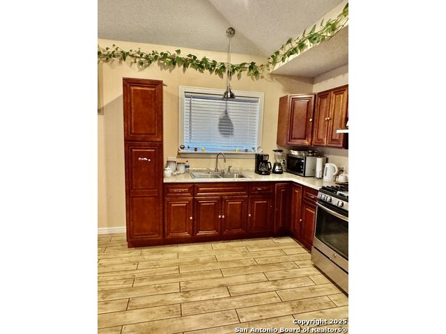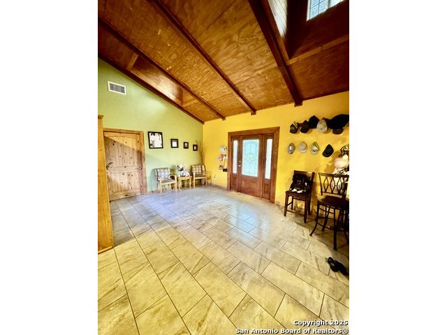 Welcome Home To Your Charming 4-Bedroom Home at 22739 Lazy Stream Dr, Elmendorf, TX 78112. We are offering credit for buying down your interest rate. Property Interior Has New Fresh Paint! Your new home in the serene community of Elmendorf, Texas! This beautifully maintained 4-bedroom, 2-bathroom single-story residence at 22739 Lazy Stream Dr offers a perfect blend of modern comfort and rustic charm, ideal for families or anyone seeking a peaceful retreat just outside San Antonio. Step inside to discover an inviting open-concept living area featuring a stunning stone fireplace with a cozy electric insert, perfect for chilly evenings. The vaulted wooden ceiling with exposed beams adds a touch of warmth and character, while the neutral tile flooring throughout ensures easy maintenance and a cohesive flow. The living room is bathed in natural light, thanks to the dormer windows and a glass double door leading to the backyard, creating a bright and airy atmosphere. The kitchen is a chef's delight, boasting rich wooden cabinetry, a spacious double sink, and sleek stainless steel appliances, including a gas range. Ample counter space and a convenient layout make meal prep a breeze, while the adjacent dining area is perfect for family gatherings or entertaining guests. The breakfast bar offers an area for party trays and get togethers. Bedrooms are generously sized, with the primary suite offering a private ensuite bathroom for added convenience. The home also features a welcoming entryway with a stylish front door, flanked by area enough for morning coffee or greeting guests. Outside, the property sits on a spacious lot surrounded by mature trees, providing shade and privacy. The front yard is beautifully landscaped with flower beds and decorative elements, while the large circular driveway offers tons of parking space, including room for an RV and boat, also plenty of room for large parties and room to play outside. The exterior stone facade and warm earth tones give the home excellent curb appeal, complemented by the quiet, tree-lined street in this peaceful neighborhood. There is a large two car covered carport easily convertible to an enclosed garage, with an attached storage area. Located just minutes from major highways, this home offers easy access to San Antonio's vibrant downtown, shopping, dining, and entertainment, while maintaining the tranquility of small-town living in Elmendorf. Don't miss the opportunity to own this charming home that combines modern amenities with a warm, inviting aesthetic.