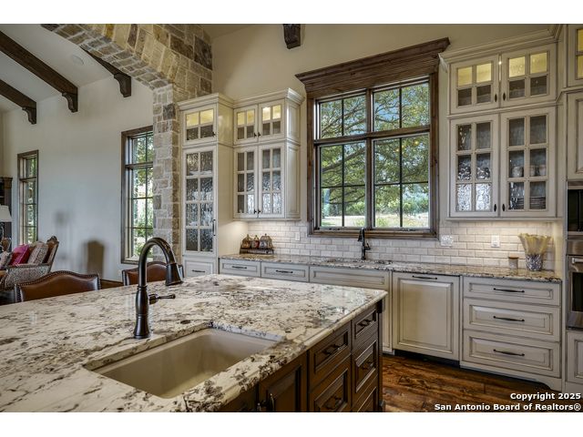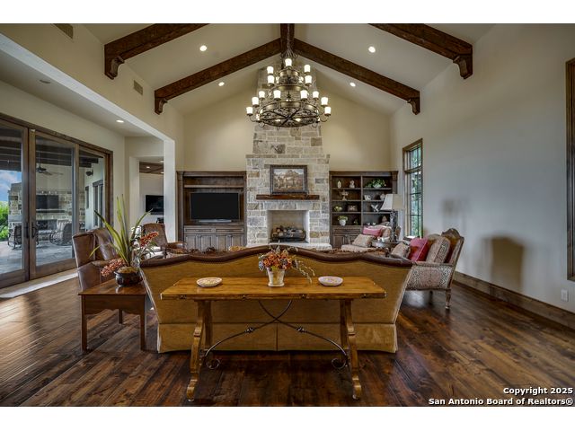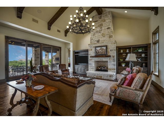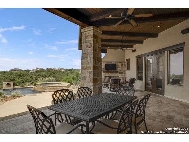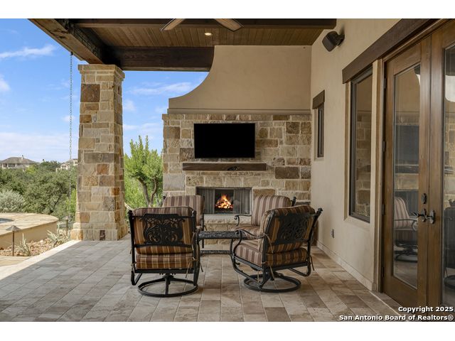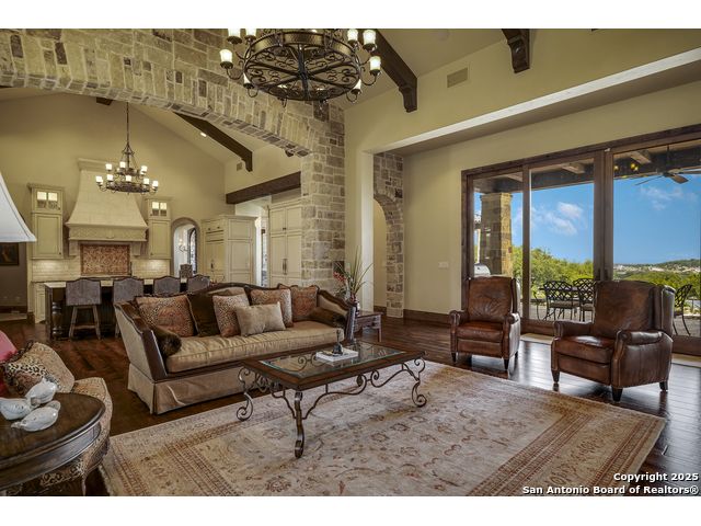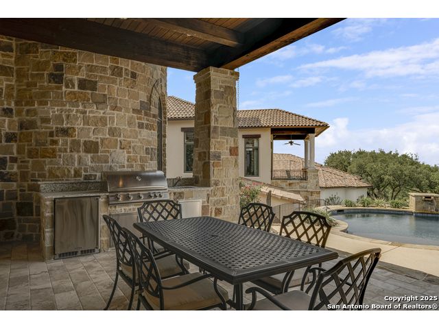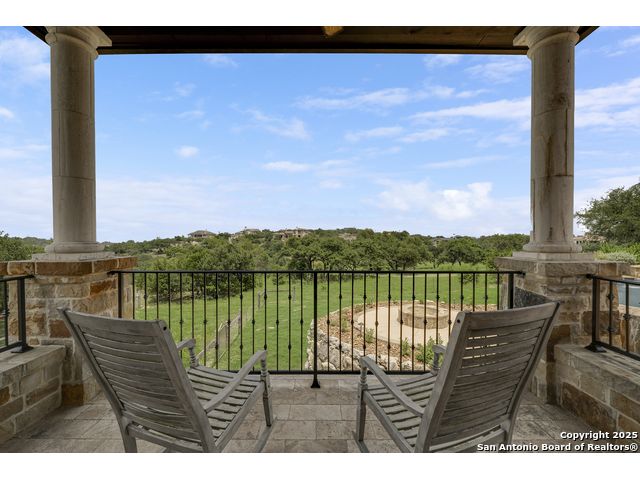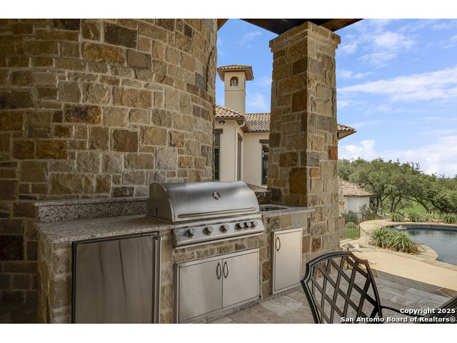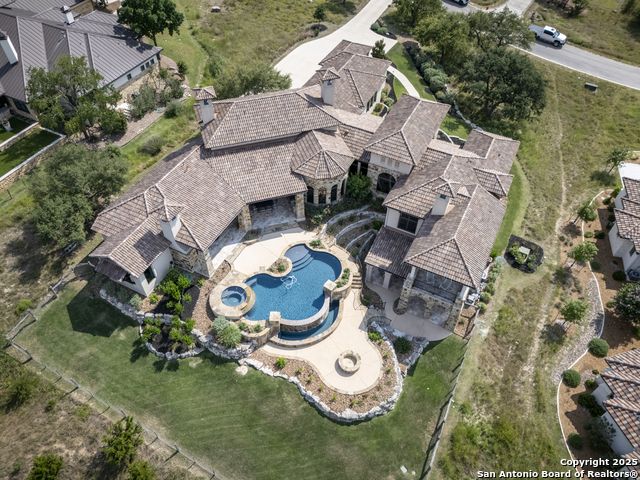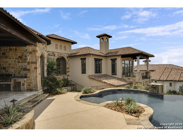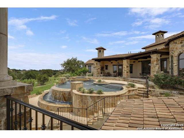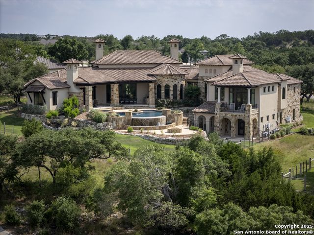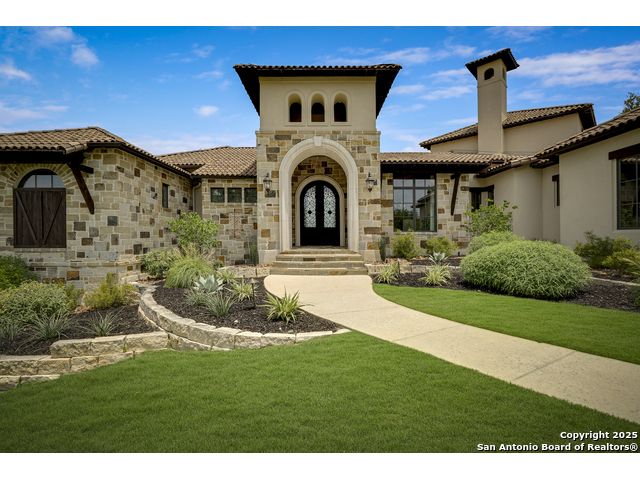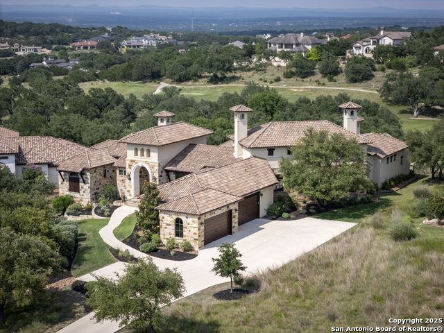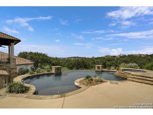 *This home has a FULL MASTER GOLF MEMBERSHIP AVAILABLE* Welcome to this one-of-a-kind custom-built Stadler home, nestled in the coveted Clubs Village section of the well-known Cordillera Ranch neighborhood. Perfectly positioned on a beautifully landscaped 1.01-acre lot, this exceptional residence backs to the 6th tee box of the Signature Jack Nicklaus Golf Course-offering serene, expansive Hill Country views and an unmatched lifestyle. With 5,940 square feet of meticulously crafted living space, this home seamlessly blends timeless architecture with luxurious modern amenities. Upon entry, you are greeted by soaring custom beamed ceilings and a flood of natural light pouring in through expansive windows, creating a warm and inviting ambiance throughout the home. To your right, a formal dining room sets the stage for elegant gatherings, seamlessly connecting to the open-concept living area. The gourmet island kitchen is a chef's dream, featuring abundant custom cabinetry, granite countertops, gas cooking, sub-zero refrigerator, 2 Bosch dishwashers, three Wolf ovens, double sinks, a spacious walk-in pantry, and an adjacent wet bar with built-in cabinetry. A charming breakfast room offers serene views of the backyard, perfect for morning coffee. The main living room boasts a floor-to-ceiling stone gas fireplace flanked by custom built-ins, leading into an expansive game room with a floating ceiling and a stylish bar area. Off the game room is a private guest suite with a full bathroom-ideal for overnight visitors. On the opposite wing, a dedicated office with built-in shelving provides the perfect work-from-home setup. The luxurious primary suite features private access to a covered patio, a striking stone fireplace, and a spa-like bathroom with dual vanities, a third prep vanity, garden tub, glass walk-in shower, and an oversized walk-in closet. Additional main-level highlights include two half baths, a mudroom, and a spacious laundry room. A temperature-controlled wine cellar is tucked halfway down the stairs, leading to the lower level where a second living room, and two additional bedrooms with their own ensuite bathroom, each offering a private covered patio. A large 24x14 ft storage room provides extensive storage solutions. Step outside to your private outdoor oasis, complete with a covered patio, full outdoor kitchen-including a gas grill, beverage fridge, and sink-ample seating space, and a cozy gas fireplace. Take in breathtaking Hill Country views while relaxing in the infinity-edge pool with attached spa and soothing water features. This remarkable home also includes an oversized 3 1/2-car garage, central vacuum system, and numerous thoughtful upgrades-offering both convenience and elegance in one of the Hill Country's most prestigious communities.