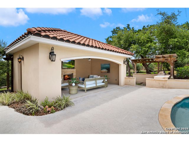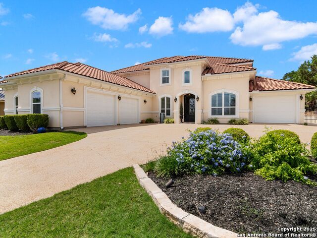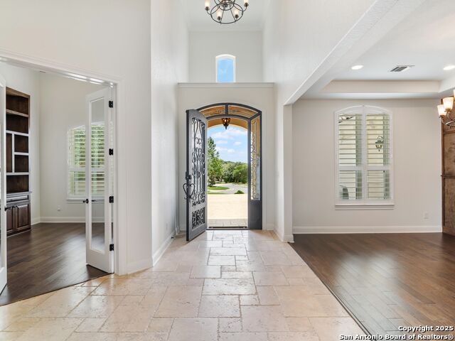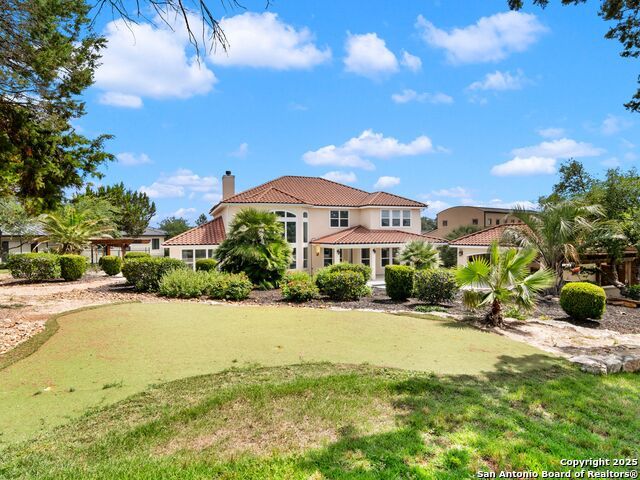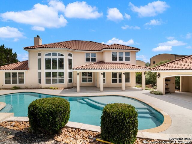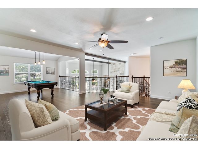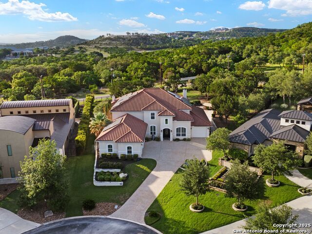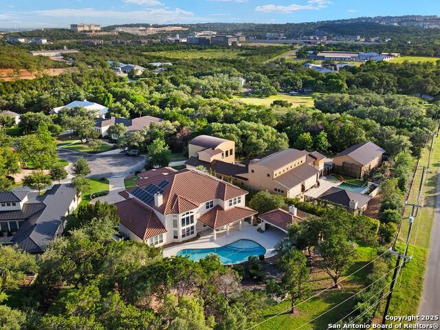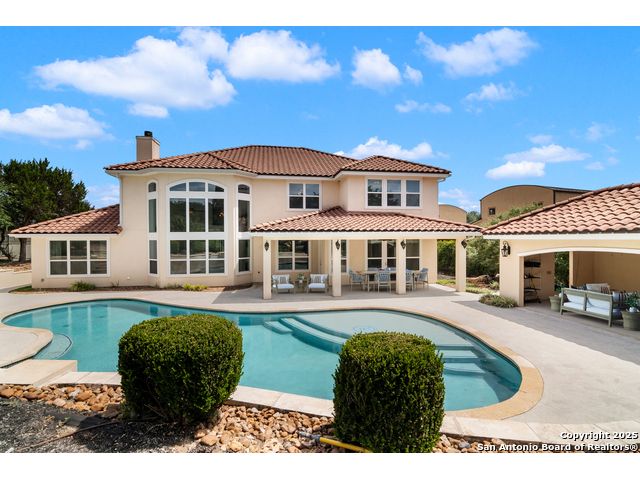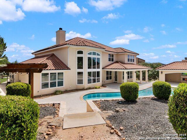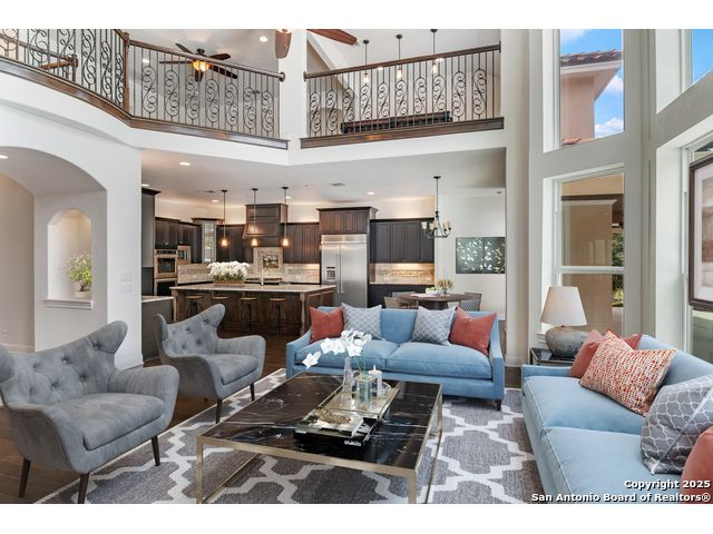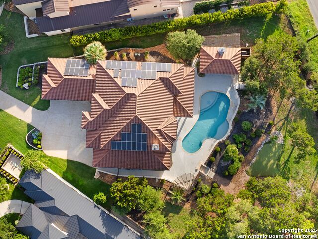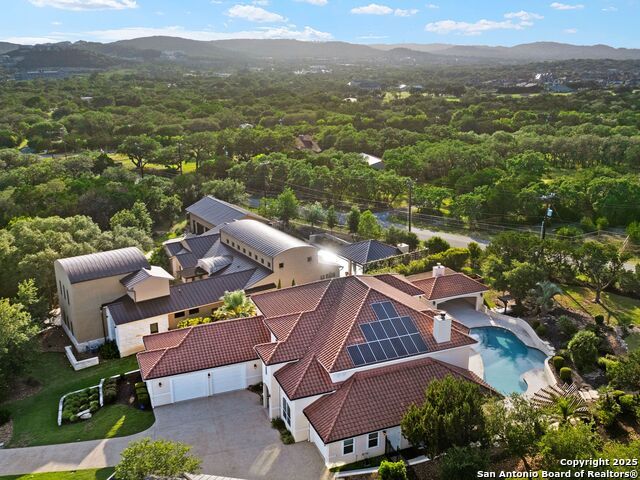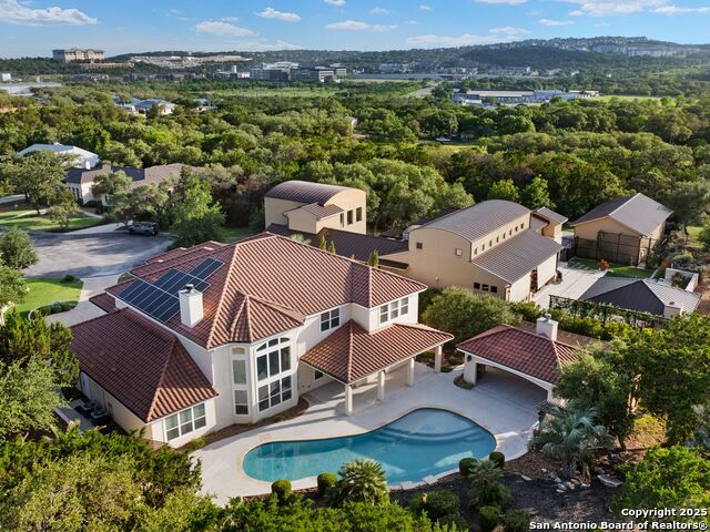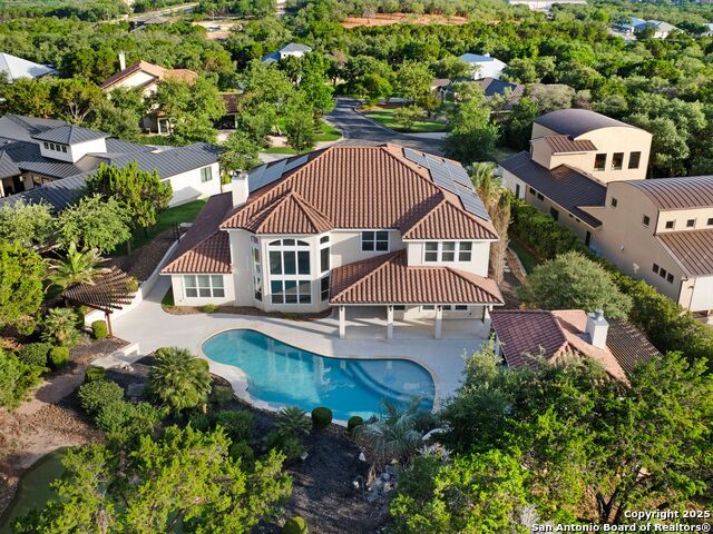 This stunning contemporary estate blends luxury with an open, light-filled design. Expansive living spaces are accented by elegant hardwood floors (wood floors in dining, study, living, and kitchen), soaring cathedral ceilings, and walls of windows that create a seamless indoor-outdoor flow. The chef's kitchen is a masterpiece, featuring custom soft-close wood cabinetry, an oversized granite island with contrasting finishes, and professional-grade stainless steel appliances, all set beneath dramatic ceiling details. The island kitchen provides granite counters, a 5-burner gas cooktop, a double oven, and a wine refrigerator. The master suite offers a true retreat with spa-like amenities, a separate living space, and a spacious walk-in closet complete with a dressing area. The en-suite bath showcases his/her granite counters, two vanities, a whirlpool tub, and a walk-in shower. The second bedroom is down with an en-suite bath, perfect for guests or in-laws. Game room, media room, and two bedrooms each with en-suite bath complete upstairs. Additional washer/dryer upstairs in the media room. The outdoor space is an entertainer's dream, featuring a sparkling pool, built-in gas grill, and ample outdoor living space. Don't miss the Cabana area with TV and fireplace, great for entertaining, and includes an outdoor shower. The pool with waterfalls is the focal point of the backyard, offering views from every room that has windows facing the back. 3 car garage - 3rd car garage has heat with air conditioning. Check out the solar system in place / a huge savings on utilities. Located in a gated community that harmonizes luxury living with the natural beauty of the surrounding area, this home also enjoys easy access to local attractions, dining, and shopping.