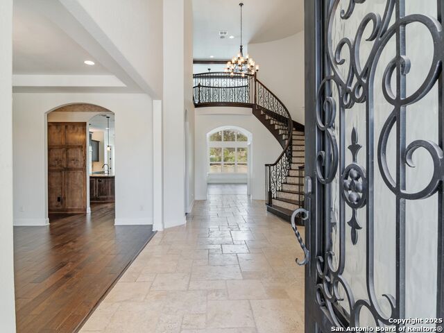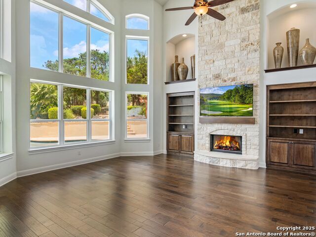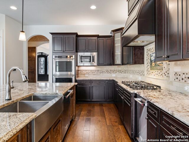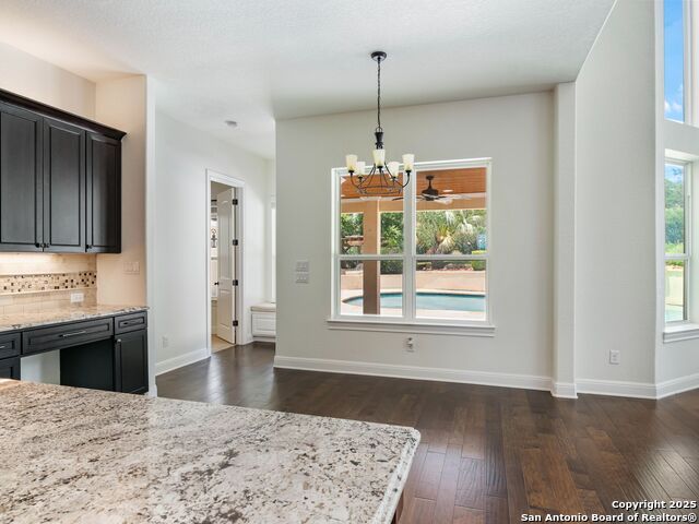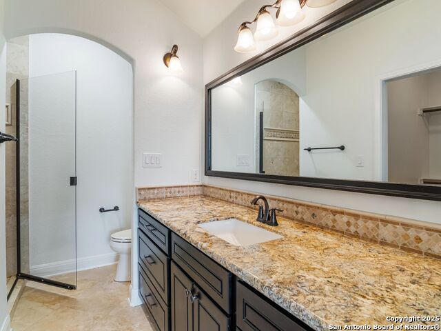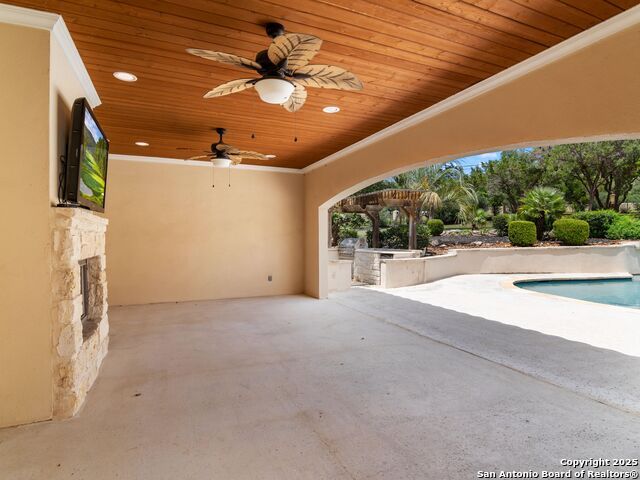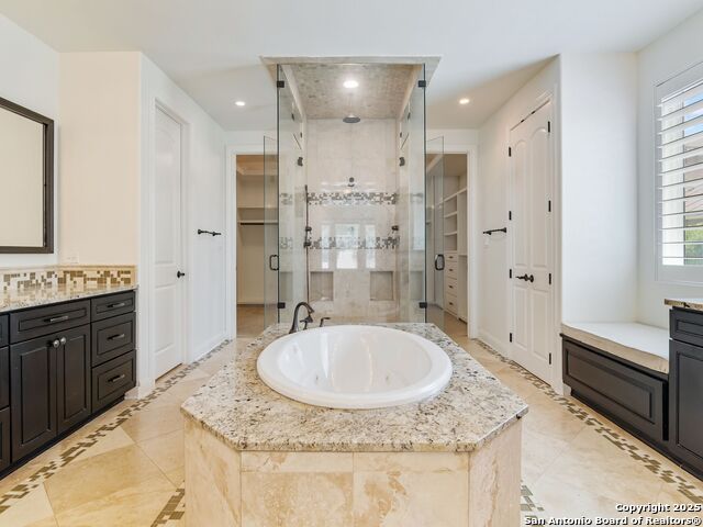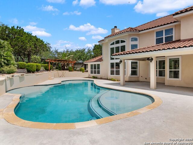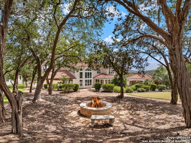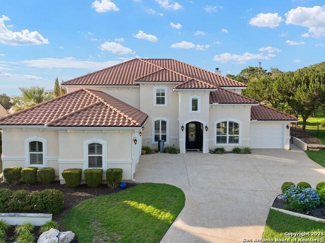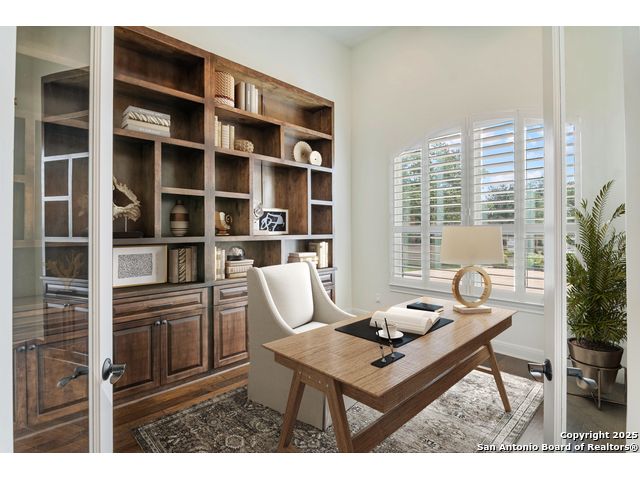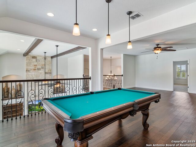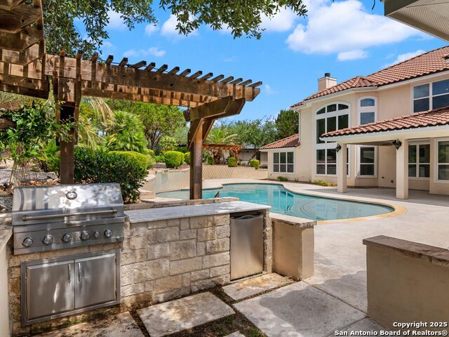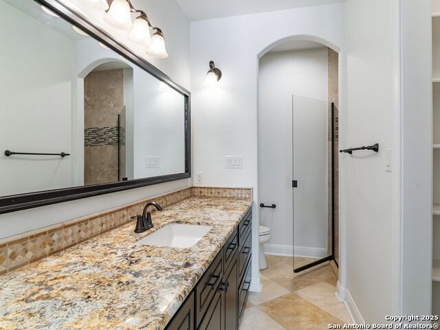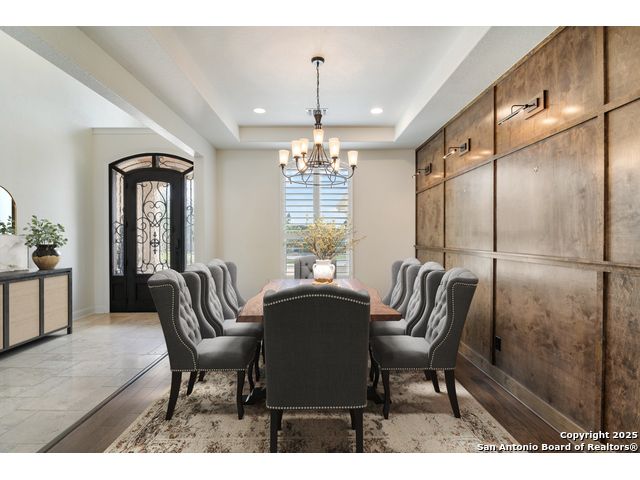 This stunning contemporary estate blends luxury with an open, light-filled design. Expansive living spaces are accented by elegant hardwood floors (wood floors in dining, study, living, and kitchen), soaring cathedral ceilings, and walls of windows that create a seamless indoor-outdoor flow. The chef's kitchen is a masterpiece, featuring custom soft-close wood cabinetry, an oversized granite island with contrasting finishes, and professional-grade stainless steel appliances, all set beneath dramatic ceiling details. The island kitchen provides granite counters, a 5-burner gas cooktop, a double oven, and a wine refrigerator. The master suite offers a true retreat with spa-like amenities, a separate living space, and a spacious walk-in closet complete with a dressing area. The en-suite bath showcases his/her granite counters, two vanities, a whirlpool tub, and a walk-in shower. The second bedroom is down with an en-suite bath, perfect for guests or in-laws. Game room, media room, and two bedrooms each with en-suite bath complete upstairs. Additional washer/dryer upstairs in the media room. The outdoor space is an entertainer's dream, featuring a sparkling pool, built-in gas grill, and ample outdoor living space. Don't miss the Cabana area with TV and fireplace, great for entertaining, and includes an outdoor shower. The pool with waterfalls is the focal point of the backyard, offering views from every room that has windows facing the back. 3 car garage - 3rd car garage has heat with air conditioning. Check out the solar system in place / a huge savings on utilities. Located in a gated community that harmonizes luxury living with the natural beauty of the surrounding area, this home also enjoys easy access to local attractions, dining, and shopping.