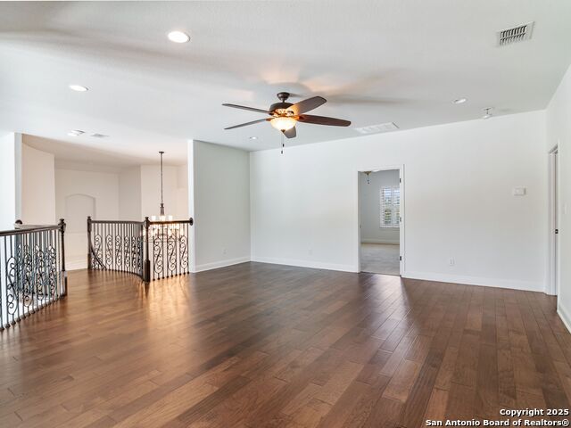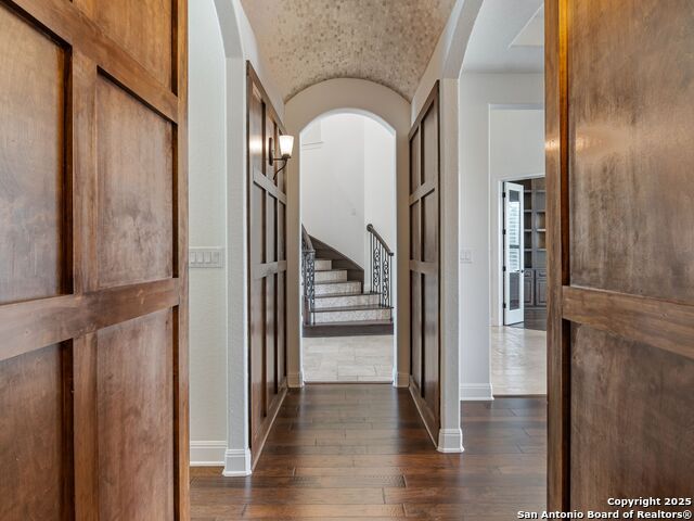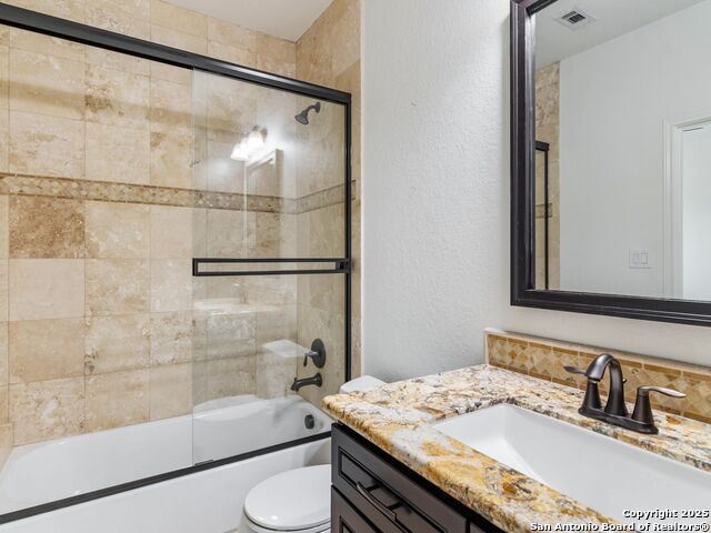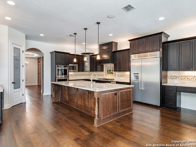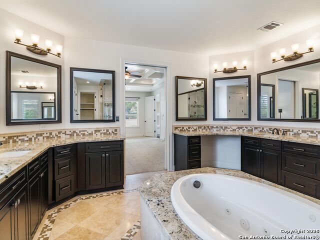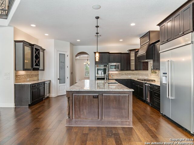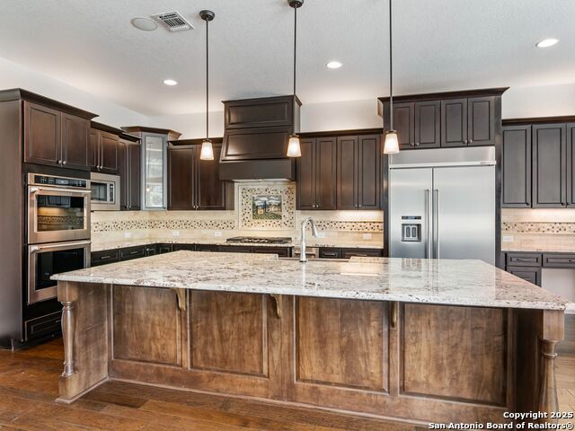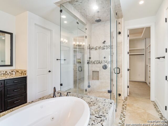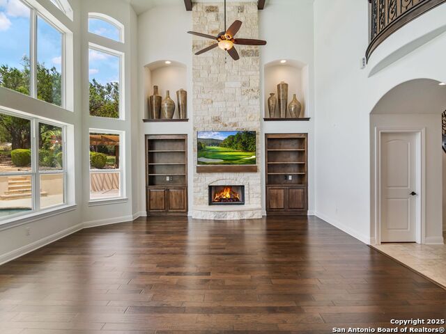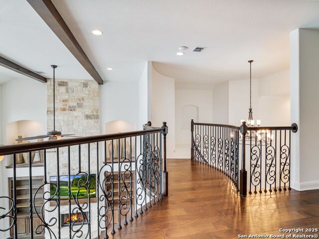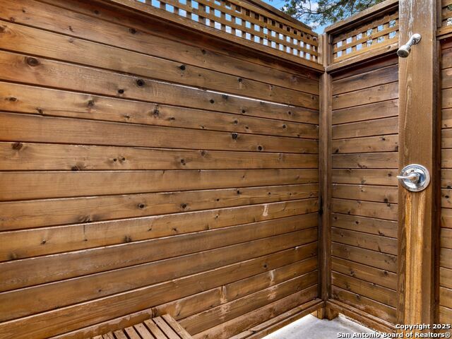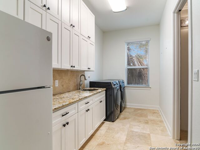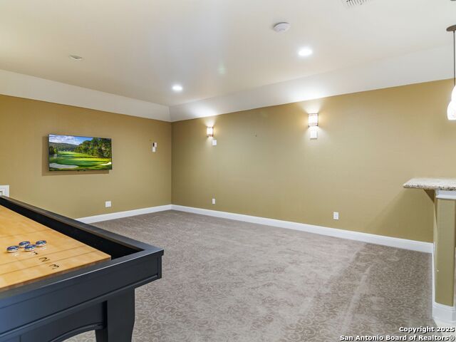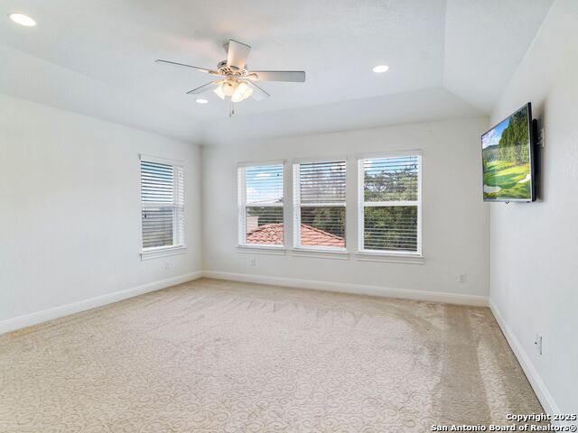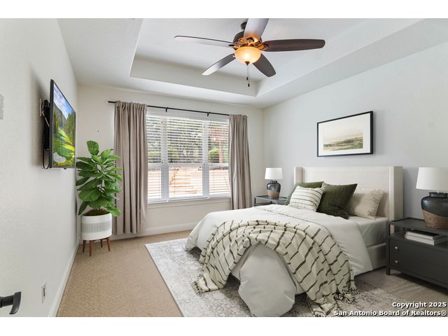 This stunning contemporary estate blends luxury with an open, light-filled design. Expansive living spaces are accented by elegant hardwood floors (wood floors in dining, study, living, and kitchen), soaring cathedral ceilings, and walls of windows that create a seamless indoor-outdoor flow. The chef's kitchen is a masterpiece, featuring custom soft-close wood cabinetry, an oversized granite island with contrasting finishes, and professional-grade stainless steel appliances, all set beneath dramatic ceiling details. The island kitchen provides granite counters, a 5-burner gas cooktop, a double oven, and a wine refrigerator. The master suite offers a true retreat with spa-like amenities, a separate living space, and a spacious walk-in closet complete with a dressing area. The en-suite bath showcases his/her granite counters, two vanities, a whirlpool tub, and a walk-in shower. The second bedroom is down with an en-suite bath, perfect for guests or in-laws. Game room, media room, and two bedrooms each with en-suite bath complete upstairs. Additional washer/dryer upstairs in the media room. The outdoor space is an entertainer's dream, featuring a sparkling pool, built-in gas grill, and ample outdoor living space. Don't miss the Cabana area with TV and fireplace, great for entertaining, and includes an outdoor shower. The pool with waterfalls is the focal point of the backyard, offering views from every room that has windows facing the back. 3 car garage - 3rd car garage has heat with air conditioning. Check out the solar system in place / a huge savings on utilities. Located in a gated community that harmonizes luxury living with the natural beauty of the surrounding area, this home also enjoys easy access to local attractions, dining, and shopping.