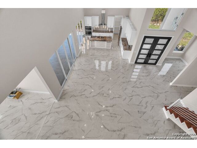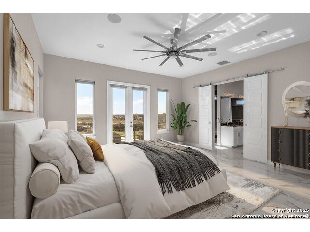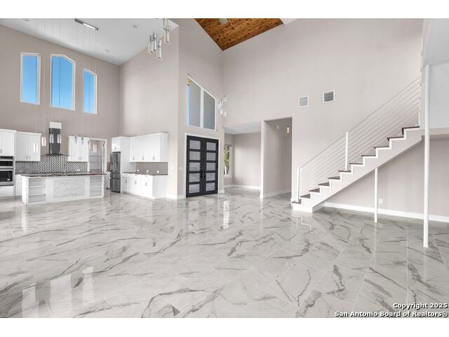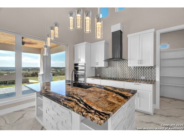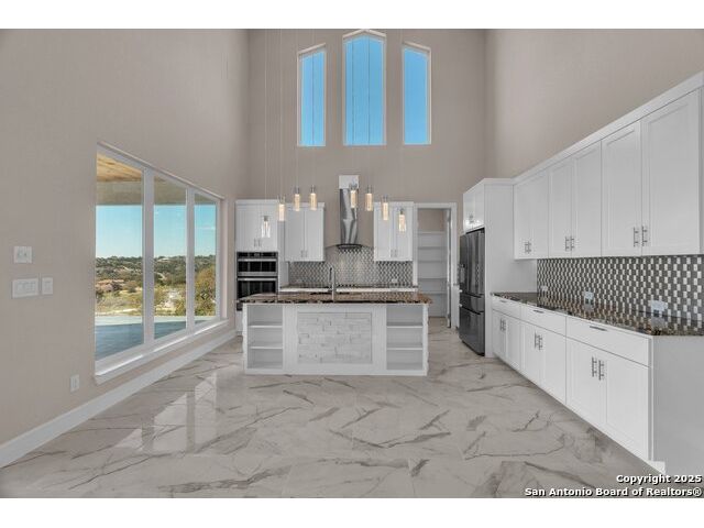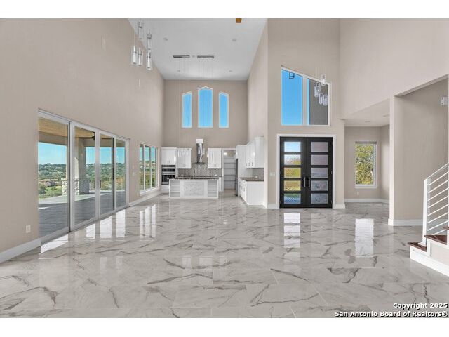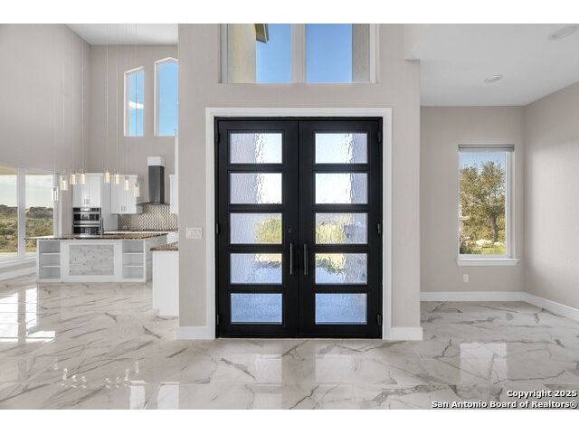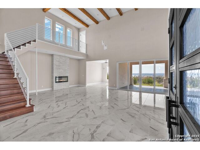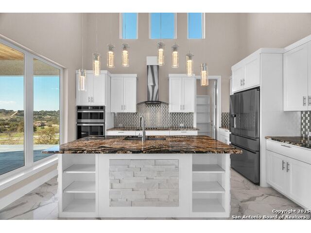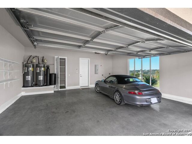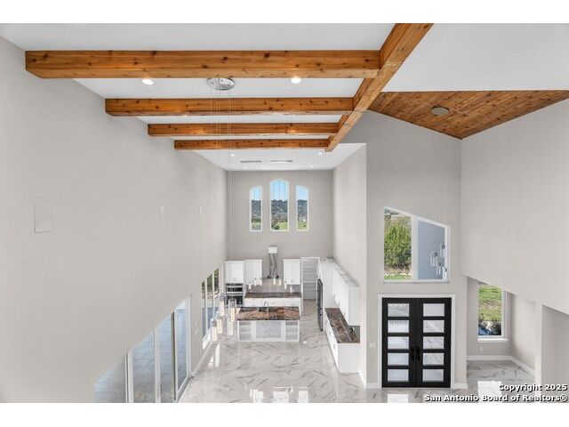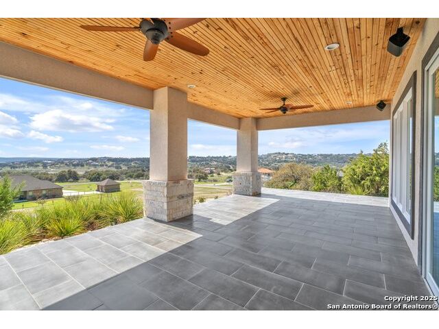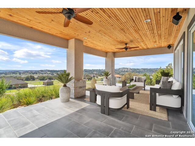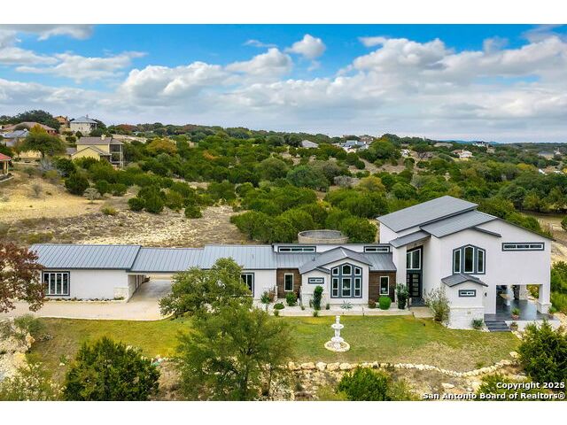 Welcome to this striking custom-built estate perched atop 2.16 acres in the prestigious Mystic Shores community of Spring Branch-offering commanding views of Canyon Lake and over 4,200 square feet of sophisticated living. Built in 2020 and gently lived in by the builder himself, this home blends modern elegance with thoughtful craftsmanship throughout. Step inside through solid metal and glass doors into soaring 22-foot ceilings, porcelain floors that flow seamlessly from room to room, and a surround sound system wired throughout the home-including the garage and outdoor patio-for an immersive audio experience. This 4-bedroom, 3.5-bath masterpiece features two primary suites, top-of-the-line cabinetry, stunning granite countertops, and a chef's kitchen ready to impress. A 2-car garage is connected by a breezeway to a separate 4-car garage-perfect for car collectors, hobbyists, or future casita conversion. Set on a beautifully elevated 2.16-acre lot, you'll enjoy unmatched privacy, panoramic lake views, and ample space to create your outdoor dream retreat. Plus, Mystic Shores offers resort-style amenities including lakeside parks, a community pool, tennis and sports courts, and playgrounds. This is more than a home-it's a rare opportunity to live elevated, both in lifestyle and location.