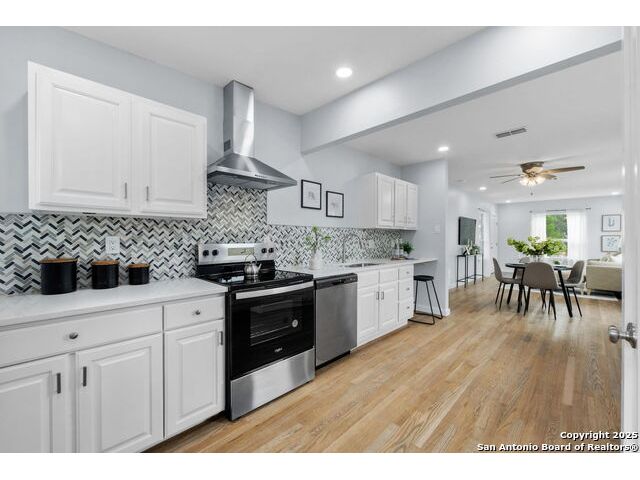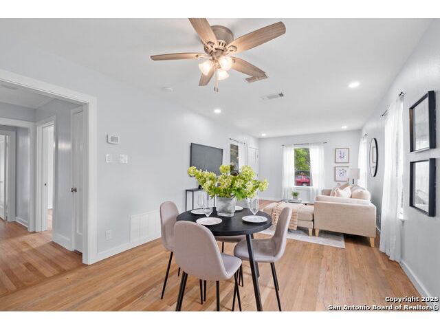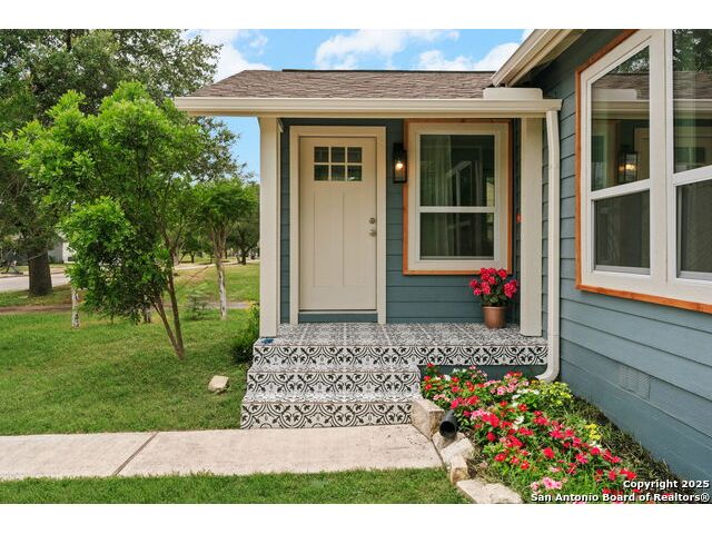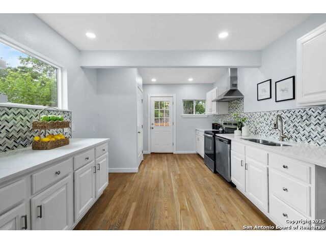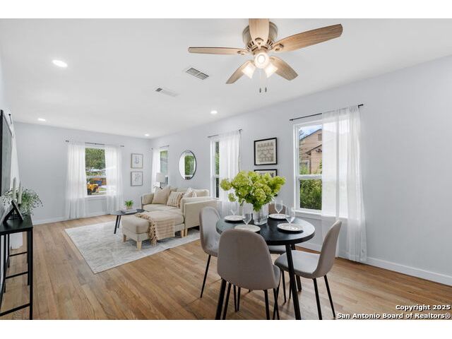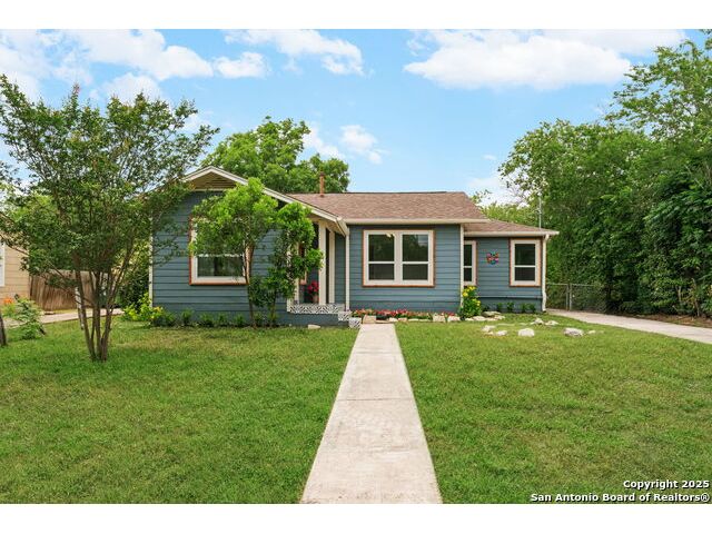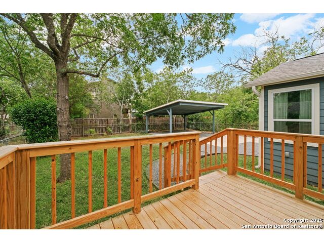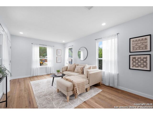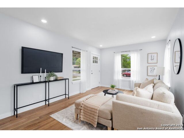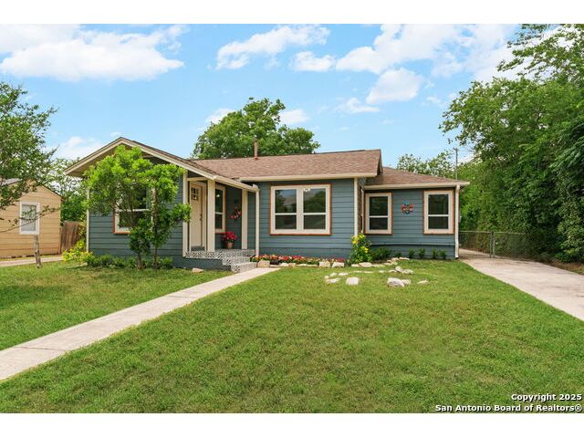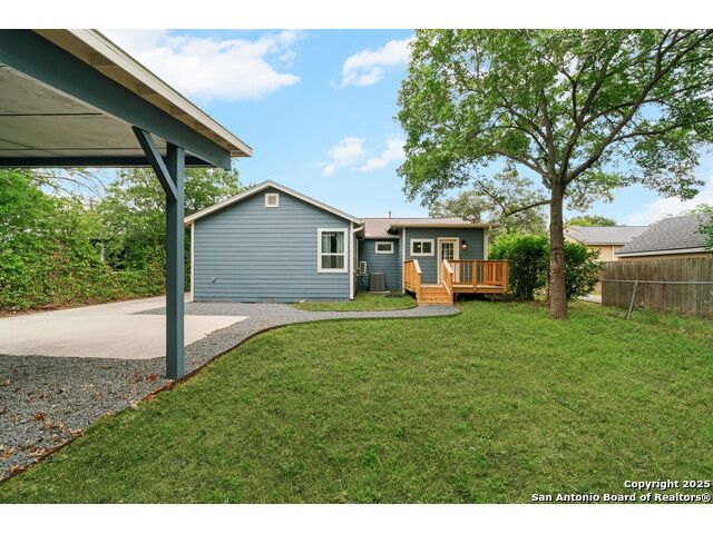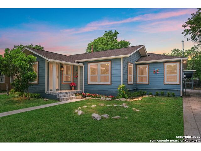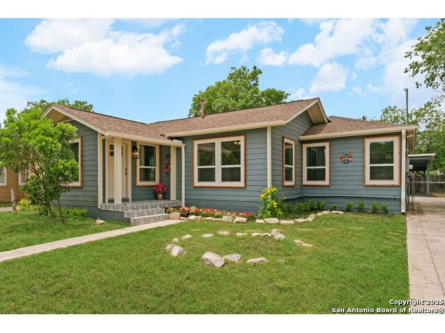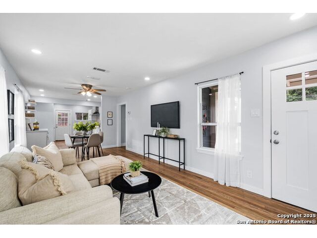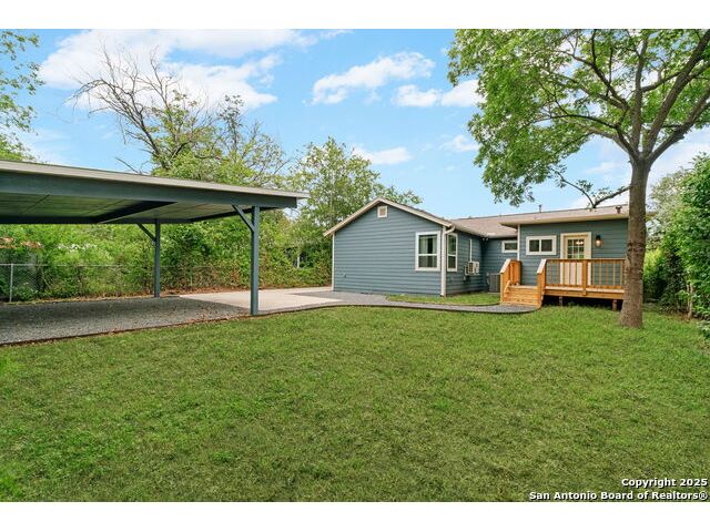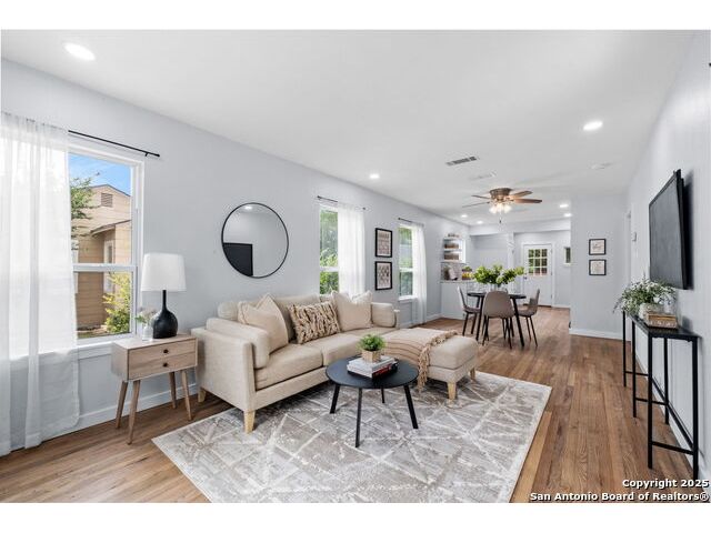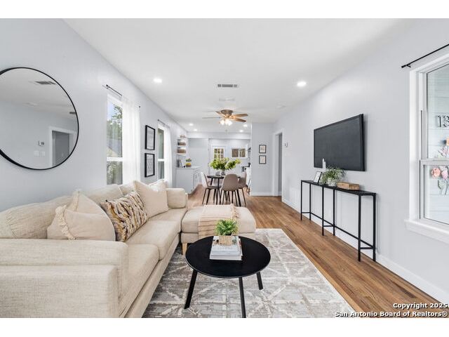 Welcome to 131 New Haven Dr, a stunning single-story home in the sought-after Terrell Heights neighborhood, zoned to the prestigious Alamo Heights Independent School District. This fully renovated 3-bedroom, 2-bathroom residence spans approximately 1,366 square feet and features thoughtful design elements throughout. The open-concept interior showcases beautiful hardwood floors, recessed lighting, and a neutral color palette that creates a bright and airy atmosphere. Large windows with sheer curtains allow natural light to fill the space, enhancing the modern elegance of the living and dining areas. A sleek ceiling fan with integrated lighting adds both style and comfort to the dining space, perfect for gatherings. The gourmet kitchen is a highlight, featuring crisp white cabinetry, stainless steel appliances, and a striking herringbone-patterned backsplash. Ample counter space, a double sink, and a convenient breakfast bar make this kitchen both functional and inviting. A door off the kitchen leads to a spacious backyard deck, ideal for outdoor entertaining. The primary bedroom offers a peaceful retreat with direct access to a luxurious ensuite bathroom. Both bathrooms have been meticulously updated with marble countertops, double vanities, and modern fixtures. The primary bathroom features a glass-enclosed shower with wood-look tiles and a built-in bench, while the second bathroom includes a soaking tub with a stylish tile surround and a sleek showerhead. Outside, the home's blue exterior is complemented by a well-maintained lawn and vibrant flower beds. The front porch, adorned with decorative tile steps, adds charm and curb appeal. The expansive backyard includes a wooden deck with a ramp for accessibility, a 2 car-covered carport, and plenty of green space, all enclosed by a privacy fence and surrounded by mature trees. With its modern updates, prime location, and timeless design, 131 New Haven Dr is a true gem in Terrell Heights. Schedule your private tour today!