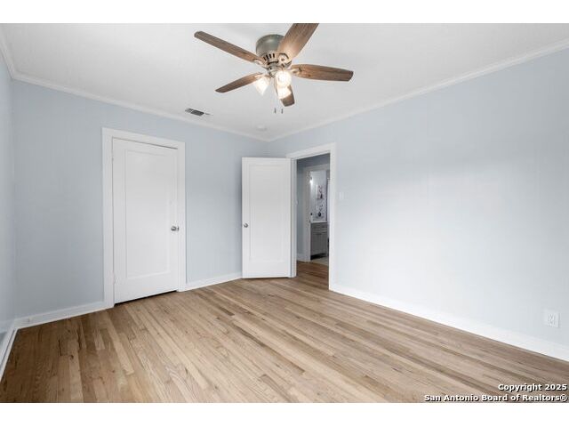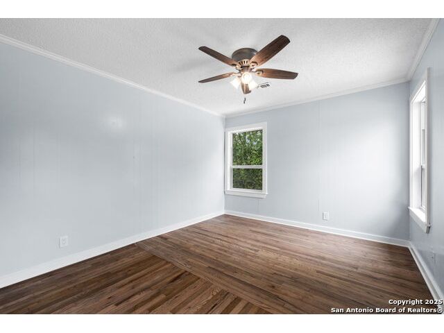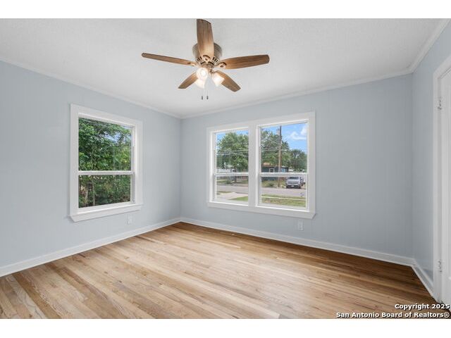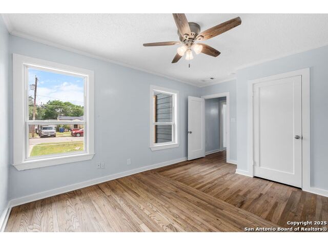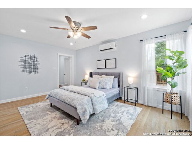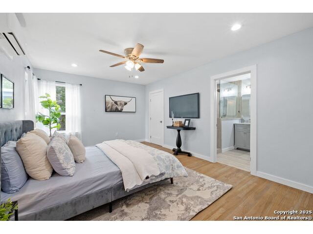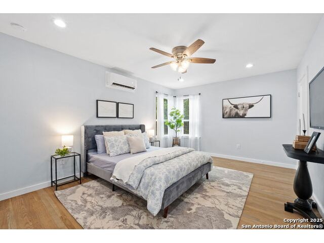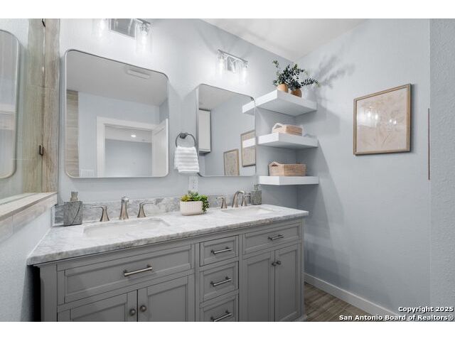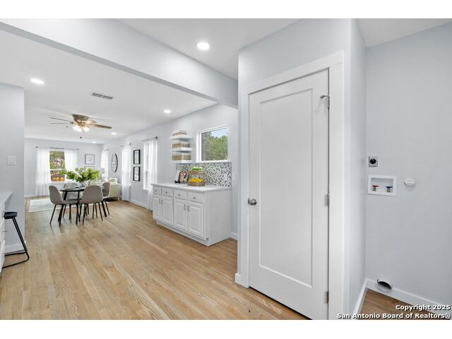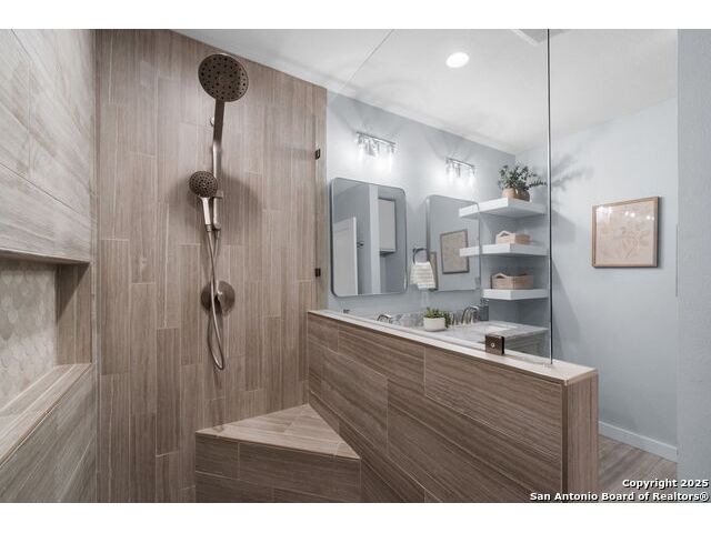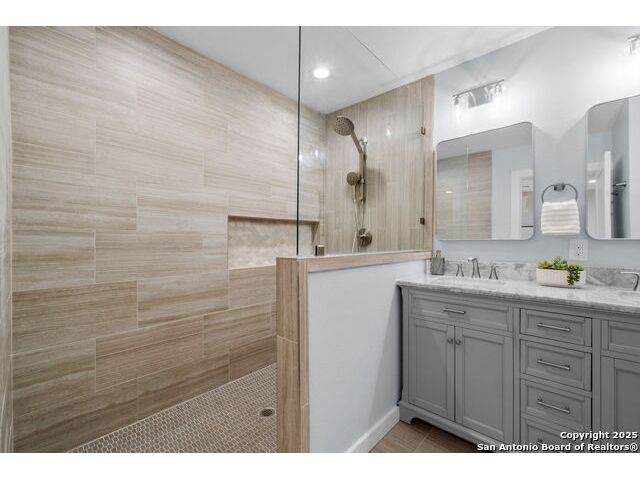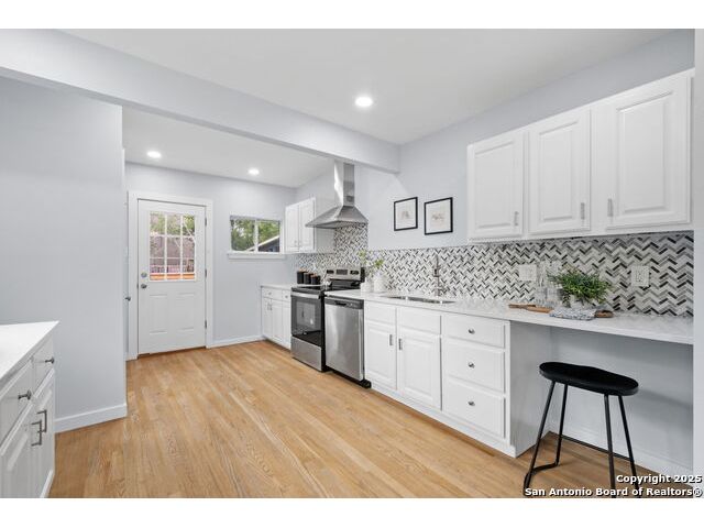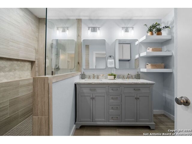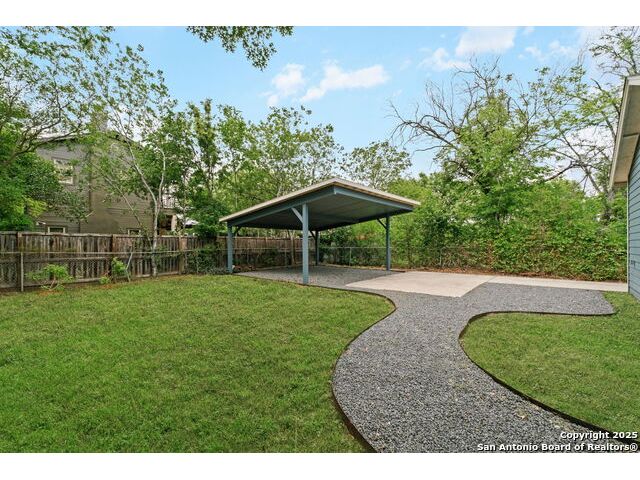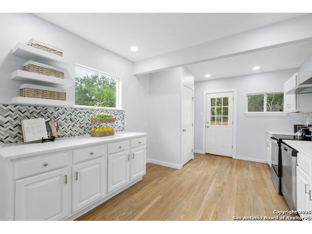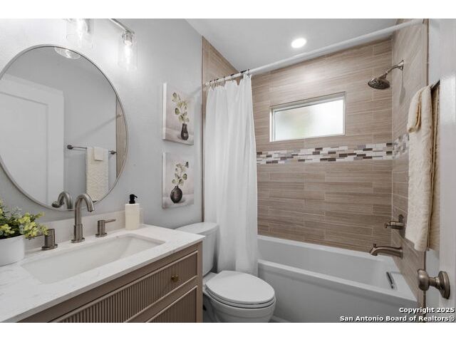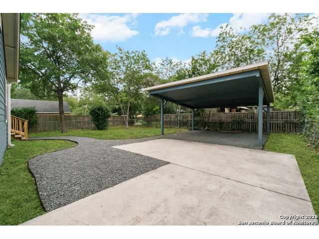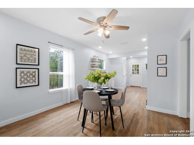 Welcome to 131 New Haven Dr, a stunning single-story home in the sought-after Terrell Heights neighborhood, zoned to the prestigious Alamo Heights Independent School District. This fully renovated 3-bedroom, 2-bathroom residence spans approximately 1,366 square feet and features thoughtful design elements throughout. The open-concept interior showcases beautiful hardwood floors, recessed lighting, and a neutral color palette that creates a bright and airy atmosphere. Large windows with sheer curtains allow natural light to fill the space, enhancing the modern elegance of the living and dining areas. A sleek ceiling fan with integrated lighting adds both style and comfort to the dining space, perfect for gatherings. The gourmet kitchen is a highlight, featuring crisp white cabinetry, stainless steel appliances, and a striking herringbone-patterned backsplash. Ample counter space, a double sink, and a convenient breakfast bar make this kitchen both functional and inviting. A door off the kitchen leads to a spacious backyard deck, ideal for outdoor entertaining. The primary bedroom offers a peaceful retreat with direct access to a luxurious ensuite bathroom. Both bathrooms have been meticulously updated with marble countertops, double vanities, and modern fixtures. The primary bathroom features a glass-enclosed shower with wood-look tiles and a built-in bench, while the second bathroom includes a soaking tub with a stylish tile surround and a sleek showerhead. Outside, the home's blue exterior is complemented by a well-maintained lawn and vibrant flower beds. The front porch, adorned with decorative tile steps, adds charm and curb appeal. The expansive backyard includes a wooden deck with a ramp for accessibility, a 2 car-covered carport, and plenty of green space, all enclosed by a privacy fence and surrounded by mature trees. With its modern updates, prime location, and timeless design, 131 New Haven Dr is a true gem in Terrell Heights. Schedule your private tour today!