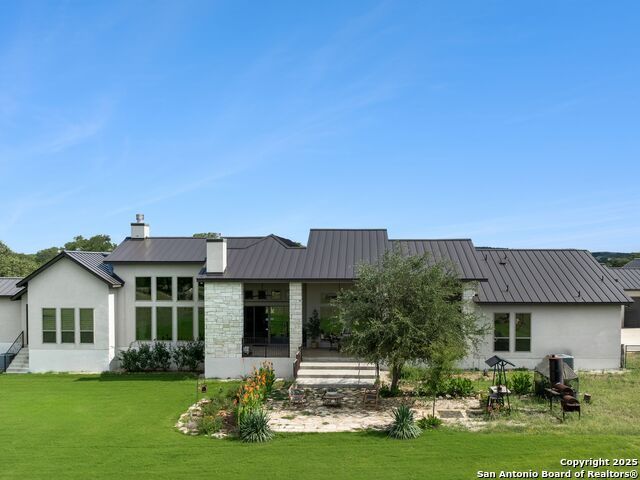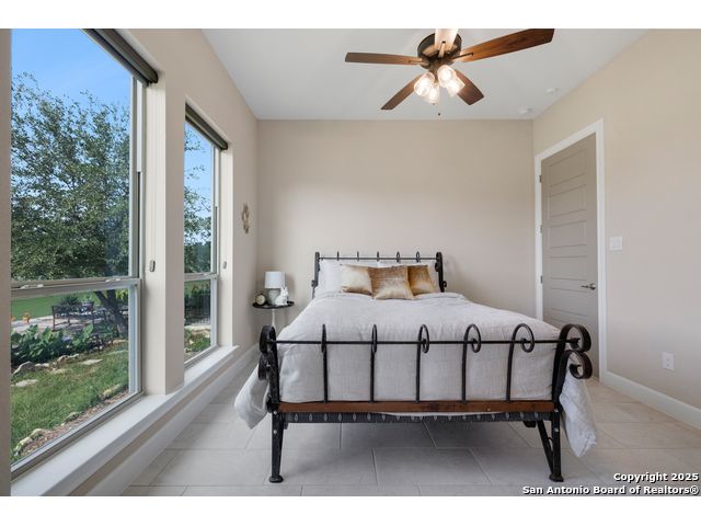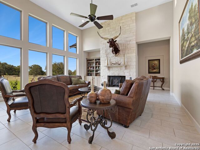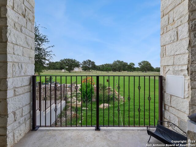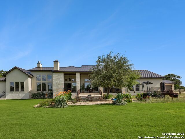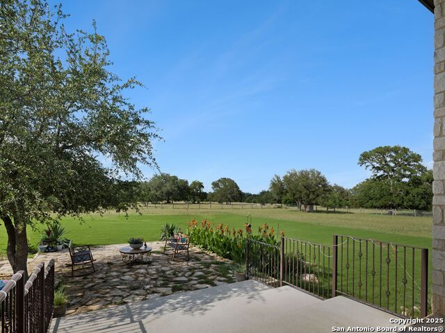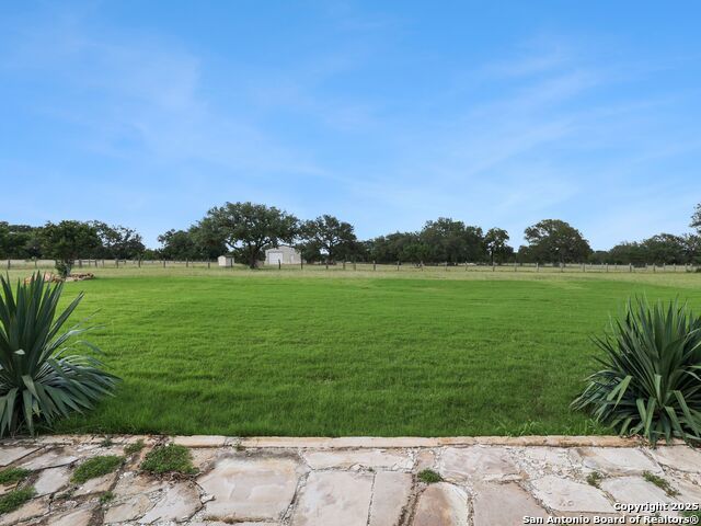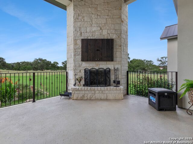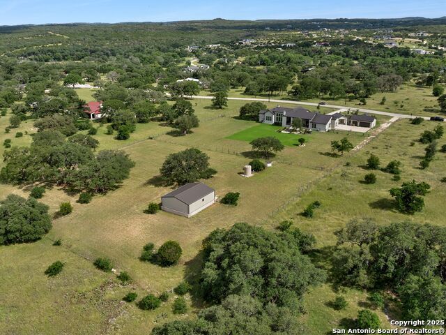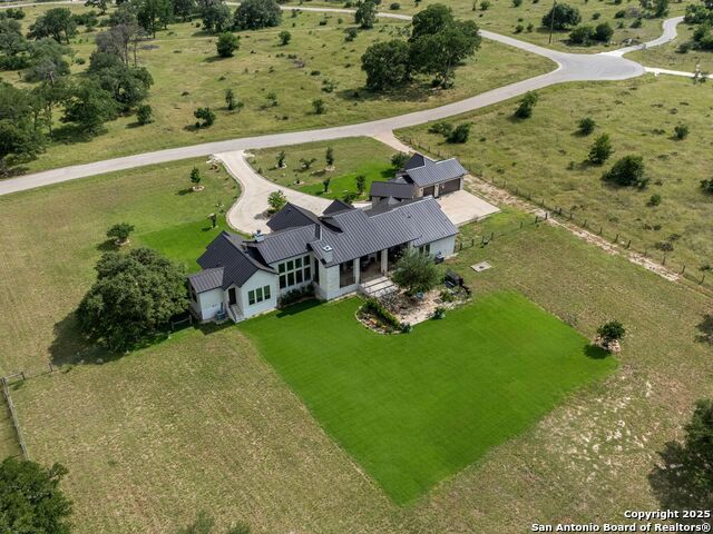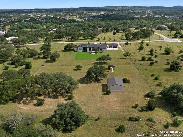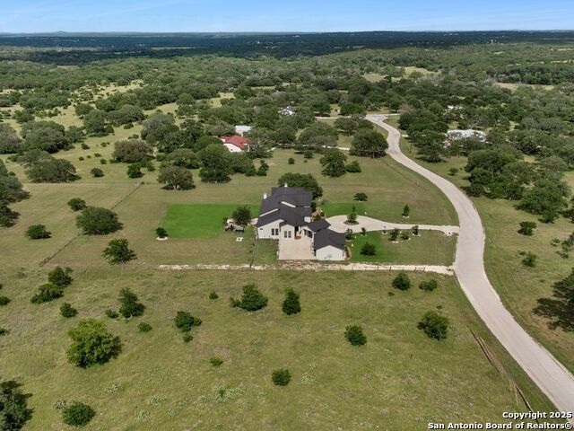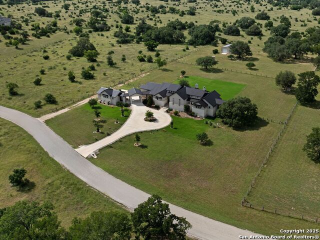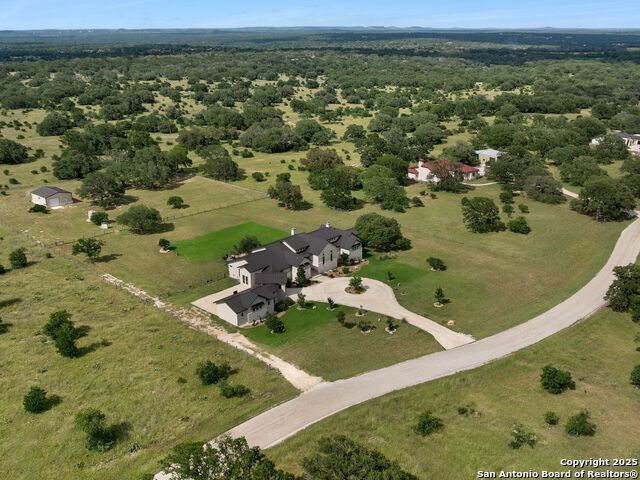 Experience spectacular Texas Hill Country living on this level 4.01-acre estate in the gated community of Sabinas Creek Ranch. Built in 2022 with exceptional craftsmanship, this single-story 4,082 square foot home offers a seamless open-concept layout with high ceilings, abundant natural light, and tile flooring throughout. The chef's kitchen features a granite island, walk-in pantry, professional-grade appliances, and custom cabinetry by Michael Edwards. Two separate living areas provide comfort and privacy. The owner's suite includes a spa-like bath, oversized walk-in closet with hidden safe room, and a flex space ideal for a home gym. Three guest bedrooms each include en-suite baths, and a private wing offers a living area with wet bar and a dedicated office. Outdoors, enjoy a covered patio with a floor-to-ceiling stone fireplace, built-in grill, and professionally landscaped grounds with irrigation. A 1,200 square foot insulated outbuilding offers space for a workshop, vehicle storage, or animal boarding. Multiple access points and a level backyard create a blank canvas for future enhancements.