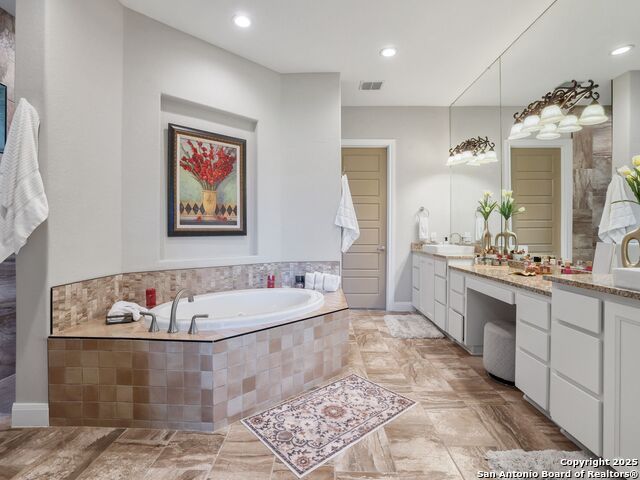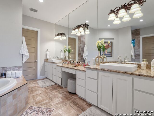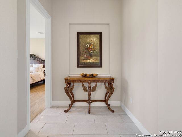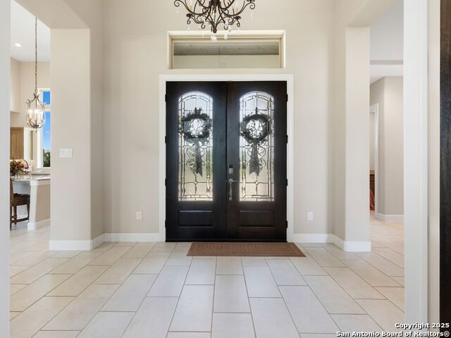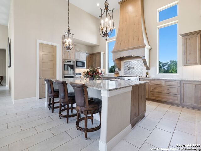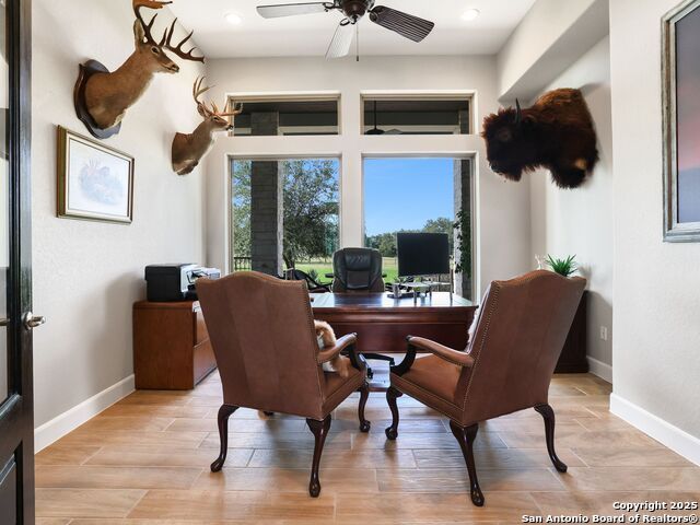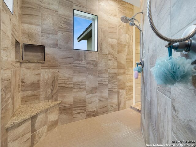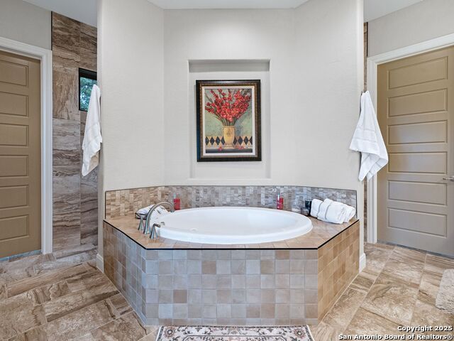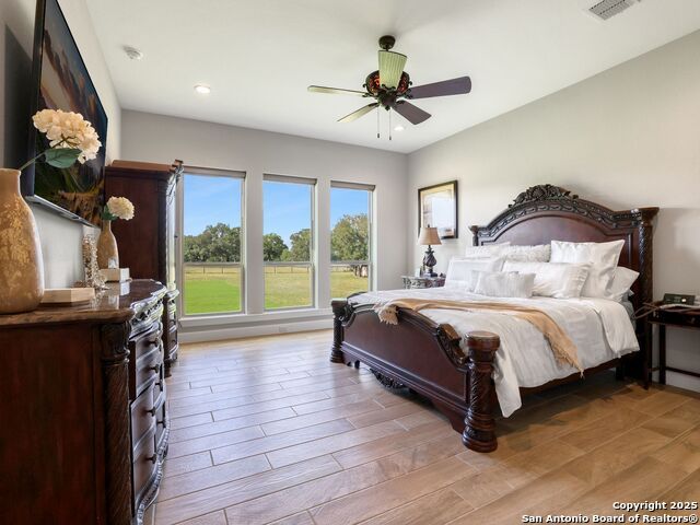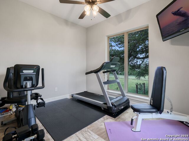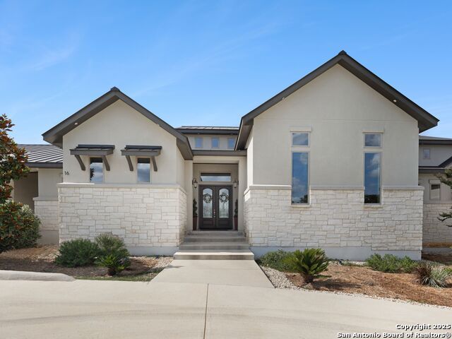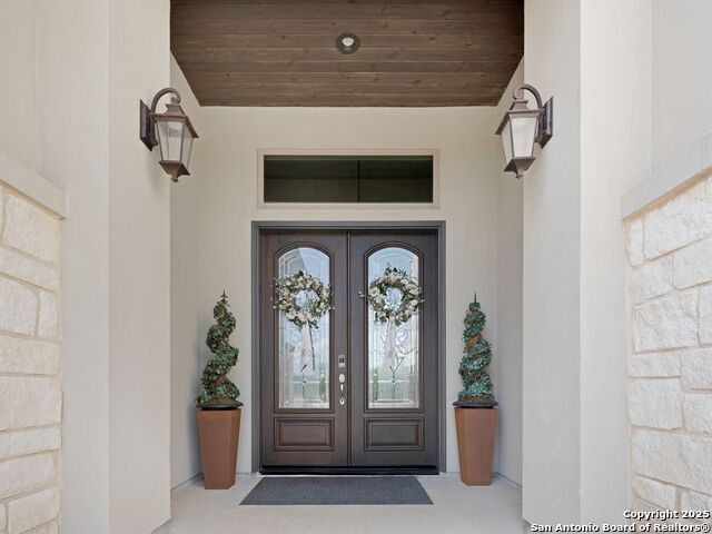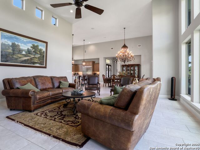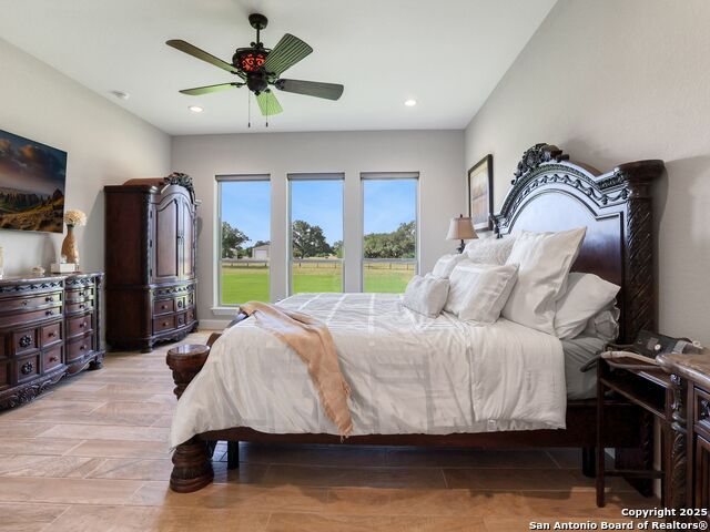 Experience spectacular Texas Hill Country living on this level 4.01-acre estate in the gated community of Sabinas Creek Ranch. Built in 2022 with exceptional craftsmanship, this single-story 4,082 square foot home offers a seamless open-concept layout with high ceilings, abundant natural light, and tile flooring throughout. The chef's kitchen features a granite island, walk-in pantry, professional-grade appliances, and custom cabinetry by Michael Edwards. Two separate living areas provide comfort and privacy. The owner's suite includes a spa-like bath, oversized walk-in closet with hidden safe room, and a flex space ideal for a home gym. Three guest bedrooms each include en-suite baths, and a private wing offers a living area with wet bar and a dedicated office. Outdoors, enjoy a covered patio with a floor-to-ceiling stone fireplace, built-in grill, and professionally landscaped grounds with irrigation. A 1,200 square foot insulated outbuilding offers space for a workshop, vehicle storage, or animal boarding. Multiple access points and a level backyard create a blank canvas for future enhancements.