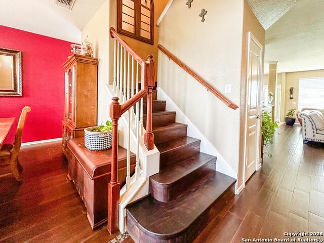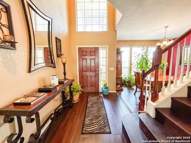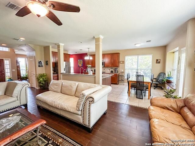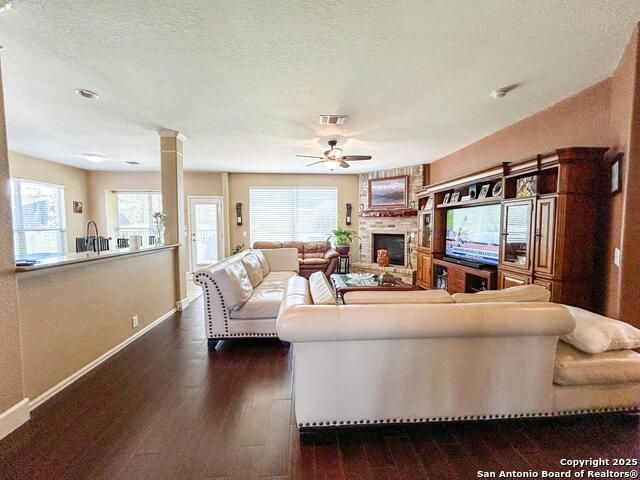 You will absolutely love this beautiful two-story home in the desirable gated community of Lakeside at Canyon Springs. This home is nestled on a cul-de-sac and features a grand entrance when you enter home with soaring ceilings and an open-concept floorplan in the kitchen and living room areas, five bedrooms, three full baths, two-car garage, separate dining room, cozy gas fireplace in the living room, gas cooking, granite kitchen countertops with bar top seating, desk area, stainless steel appliances, tiled and wood flooring downstairs. One of the bedrooms is downstairs with a full bath and laundry room on the main floor. Upstairs you will find the second living area, the primary bedroom with a huge window giving the perfect natural lighting and amazing views of the Stone Oak hills, primary bathroom is more than spacious providing a garden tub and separate walk-in shower, his and hers vanities and sinks. The three bedrooms will offer the perfect space with walk-in closets. Enjoy the private covered patio space great for entertaining and the generous backyard with a greenbelt. This home has been well cared for and seller is motivated to sell. Last, but not least, the amenities for this community are "FUN" you'll enjoy a pool, playground, covered patio and small lake. You are minutes from HWY 281, hospitals, restaurants and shopping centers.