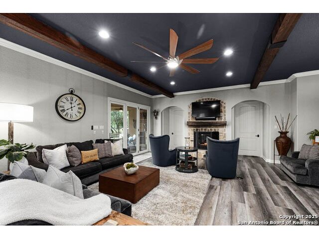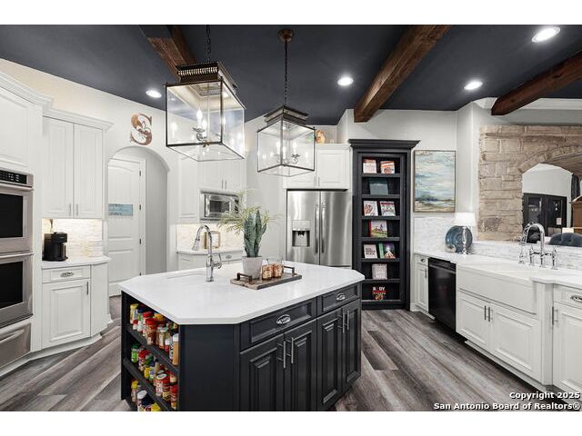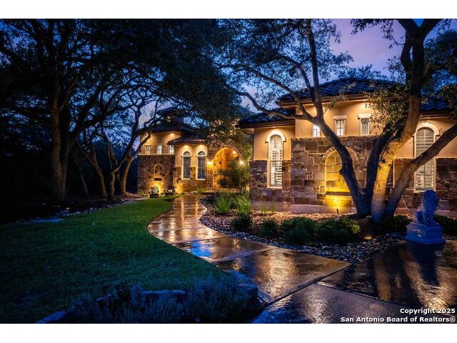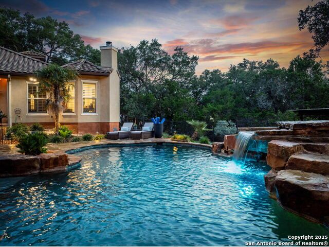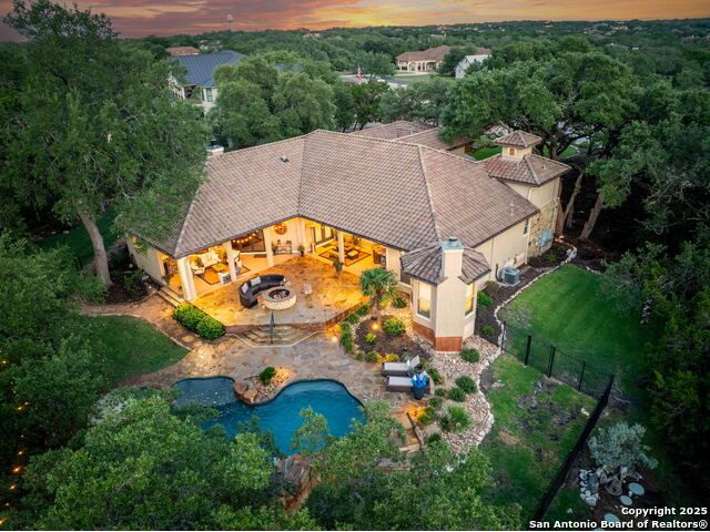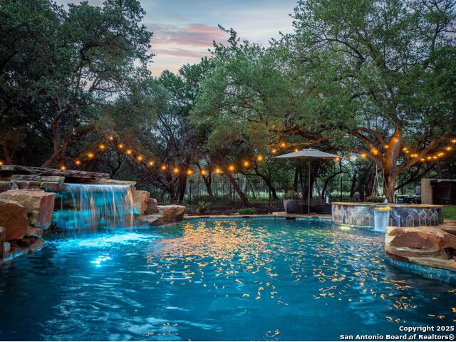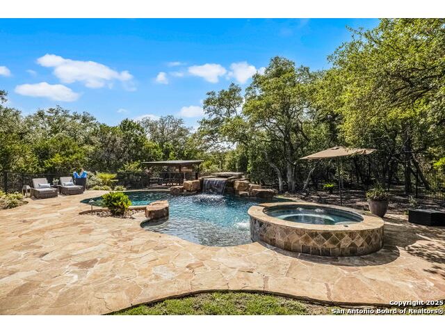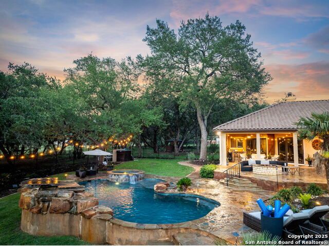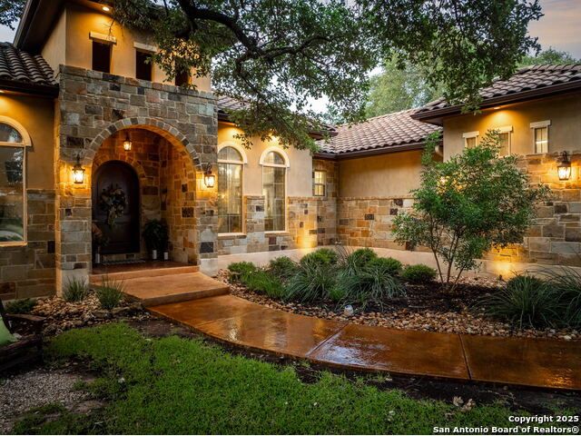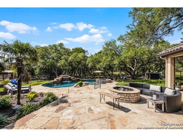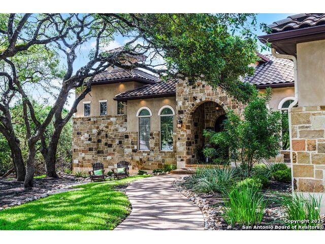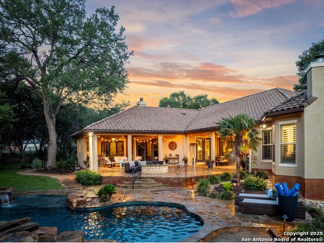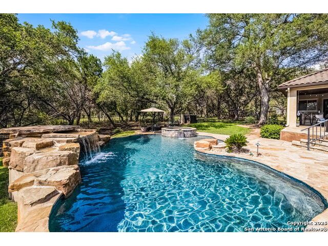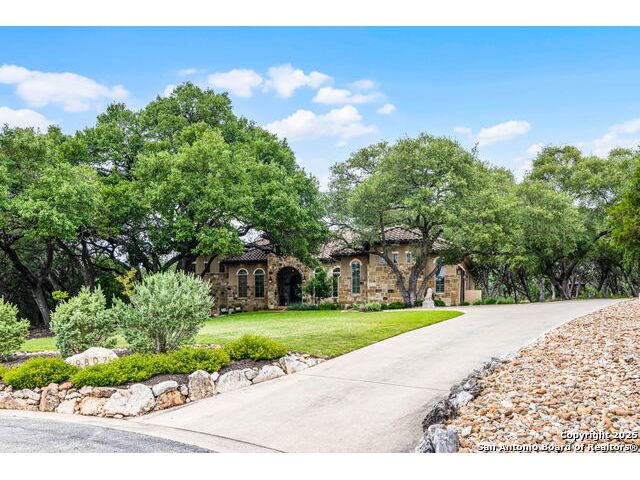 Welcome to your dream home nestled under majestic heritage oak trees in the heart of the Texas Hill Country. This elegant, custom-designed single-story residence offers a serene retreat with a host of high-end upgrades. From the beamed ceilings and exquisite custom woodwork to the premium accordion glass doors that seamlessly open to the outdoors, every detail has been thoughtfully curated. The gourmet kitchen is a chef's paradise, featuring a spacious gas cooktop with a convenient pot filler, built-in dual ovens, a built-in microwave, and an expansive butler's pantry cleverly concealed behind a bookshelf. The centerpiece of the kitchen is the stunning granite countertops, offering ample space for culinary creations. The luxurious primary suite includes a private sitting room with a cozy fireplace, with spa-like primary bathroom. On the opposite wing of the split floorplan, you'll find a game room with a wet bar and an adjoining secondary suite, offering the perfect setup for guests or family. Step into the backyard and discover a secluded oasis designed for relaxation and entertainment. It features a heated pool with a grotto waterfall, an attached spa, an outdoor kitchen, multiple seating areas, a fire pit, and even a sports court. Don't miss the opportunity to make this exceptional property your home!