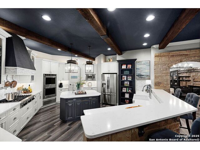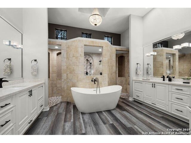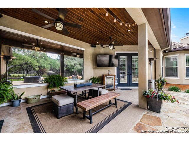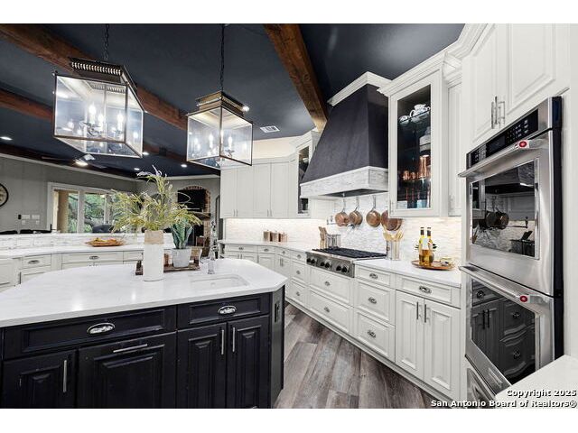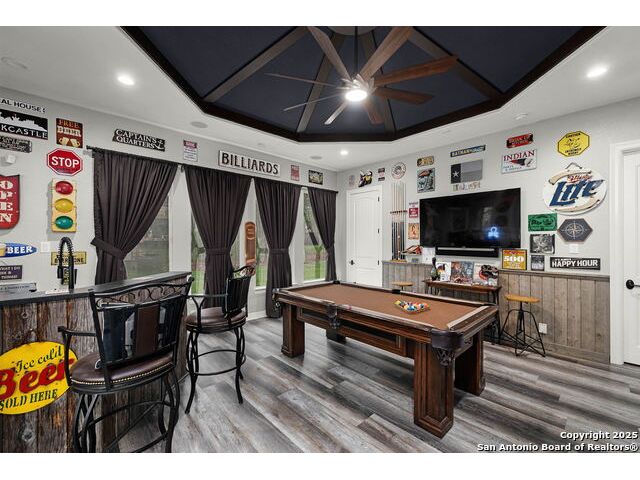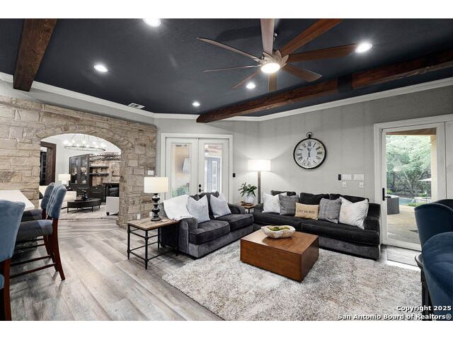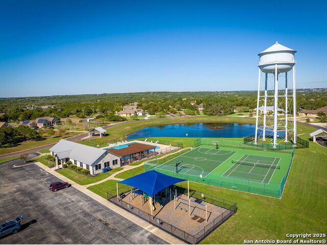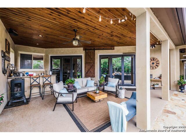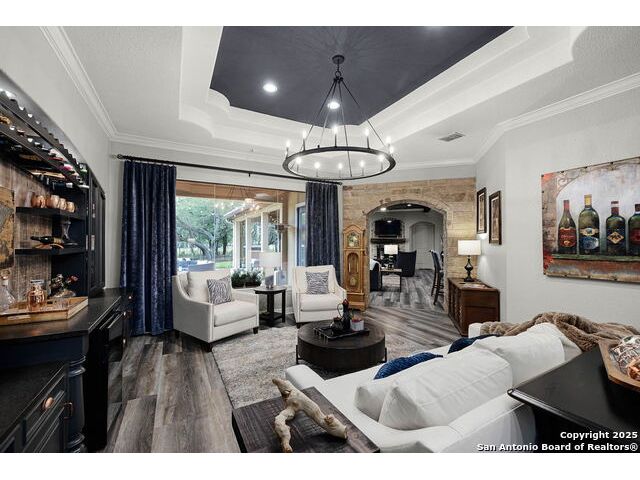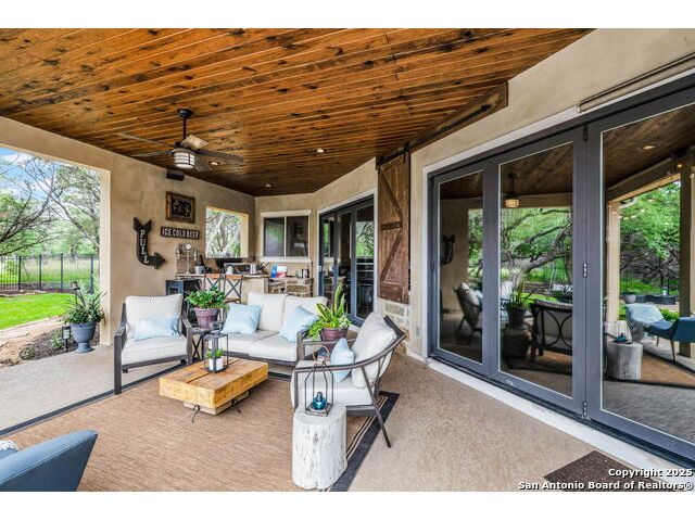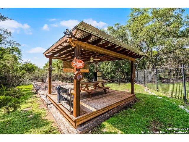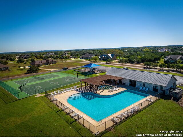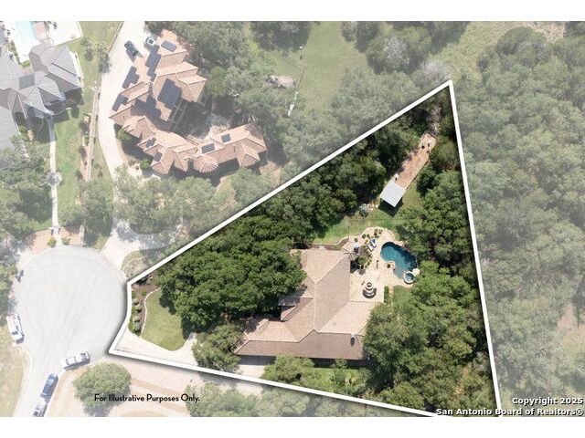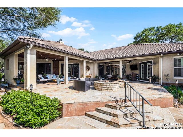 Welcome to your dream home nestled under majestic heritage oak trees in the heart of the Texas Hill Country. This elegant, custom-designed single-story residence offers a serene retreat with a host of high-end upgrades. From the beamed ceilings and exquisite custom woodwork to the premium accordion glass doors that seamlessly open to the outdoors, every detail has been thoughtfully curated. The gourmet kitchen is a chef's paradise, featuring a spacious gas cooktop with a convenient pot filler, built-in dual ovens, a built-in microwave, and an expansive butler's pantry cleverly concealed behind a bookshelf. The centerpiece of the kitchen is the stunning granite countertops, offering ample space for culinary creations. The luxurious primary suite includes a private sitting room with a cozy fireplace, with spa-like primary bathroom. On the opposite wing of the split floorplan, you'll find a game room with a wet bar and an adjoining secondary suite, offering the perfect setup for guests or family. Step into the backyard and discover a secluded oasis designed for relaxation and entertainment. It features a heated pool with a grotto waterfall, an attached spa, an outdoor kitchen, multiple seating areas, a fire pit, and even a sports court. Don't miss the opportunity to make this exceptional property your home!