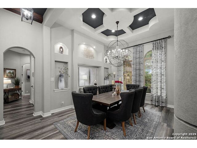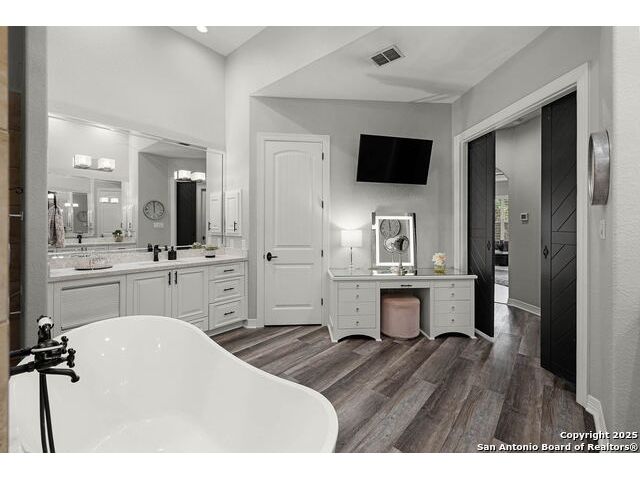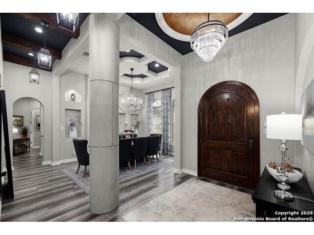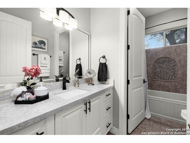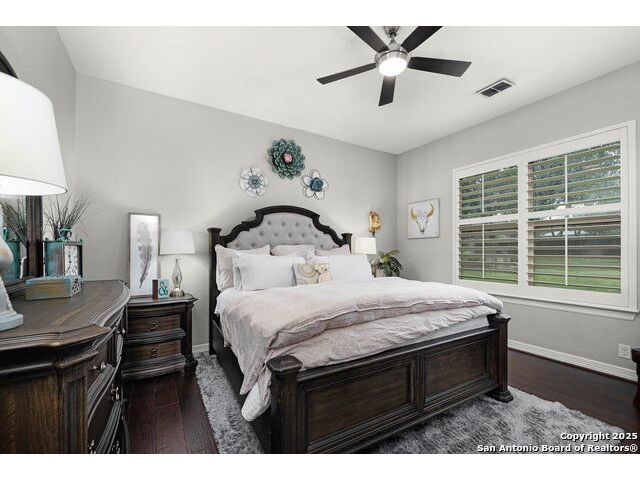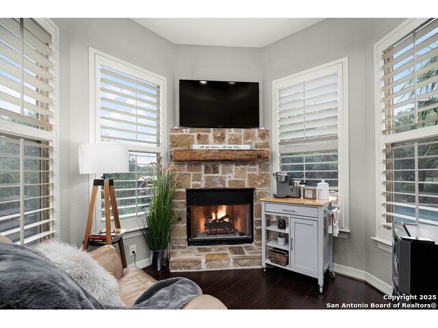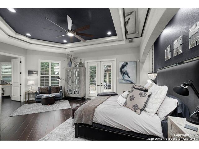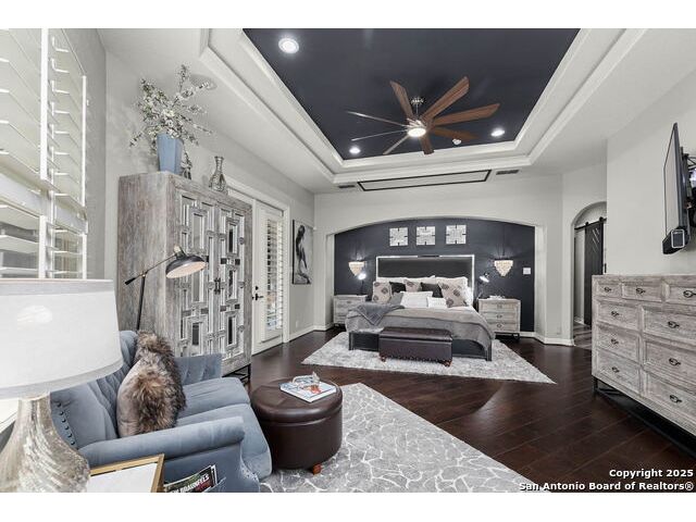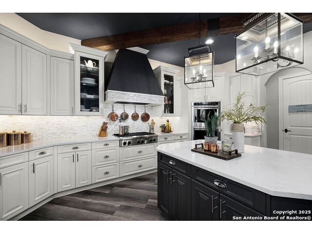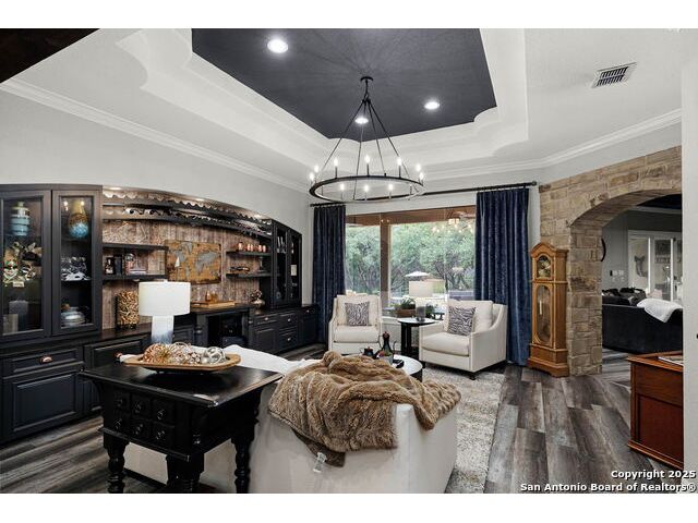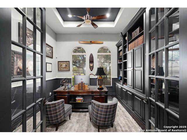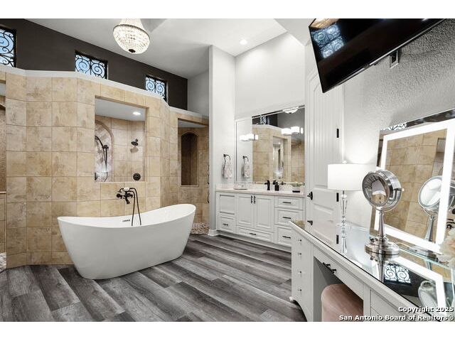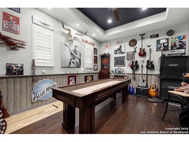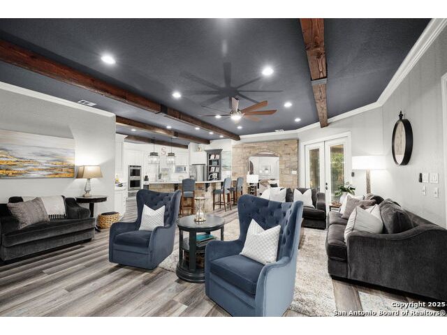 Welcome to your dream home nestled under majestic heritage oak trees in the heart of the Texas Hill Country. This elegant, custom-designed single-story residence offers a serene retreat with a host of high-end upgrades. From the beamed ceilings and exquisite custom woodwork to the premium accordion glass doors that seamlessly open to the outdoors, every detail has been thoughtfully curated. The gourmet kitchen is a chef's paradise, featuring a spacious gas cooktop with a convenient pot filler, built-in dual ovens, a built-in microwave, and an expansive butler's pantry cleverly concealed behind a bookshelf. The centerpiece of the kitchen is the stunning granite countertops, offering ample space for culinary creations. The luxurious primary suite includes a private sitting room with a cozy fireplace, with spa-like primary bathroom. On the opposite wing of the split floorplan, you'll find a game room with a wet bar and an adjoining secondary suite, offering the perfect setup for guests or family. Step into the backyard and discover a secluded oasis designed for relaxation and entertainment. It features a heated pool with a grotto waterfall, an attached spa, an outdoor kitchen, multiple seating areas, a fire pit, and even a sports court. Don't miss the opportunity to make this exceptional property your home!