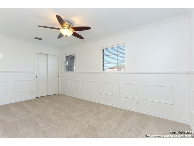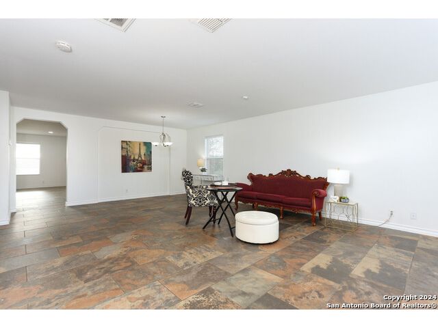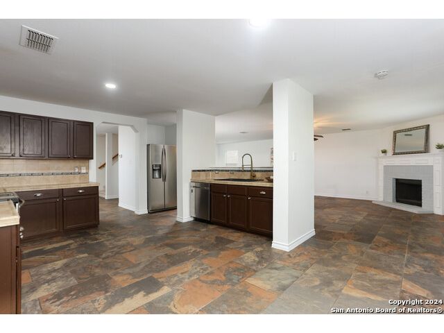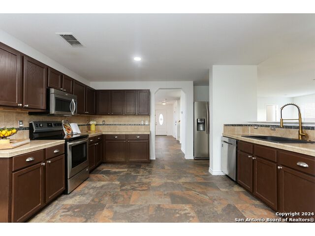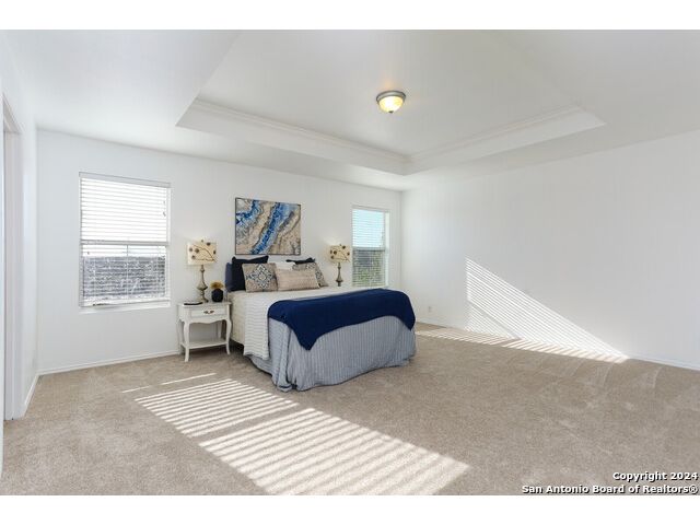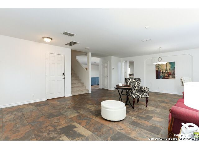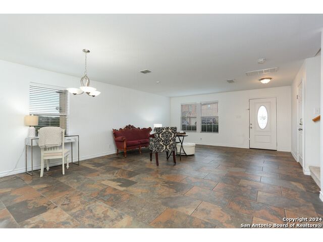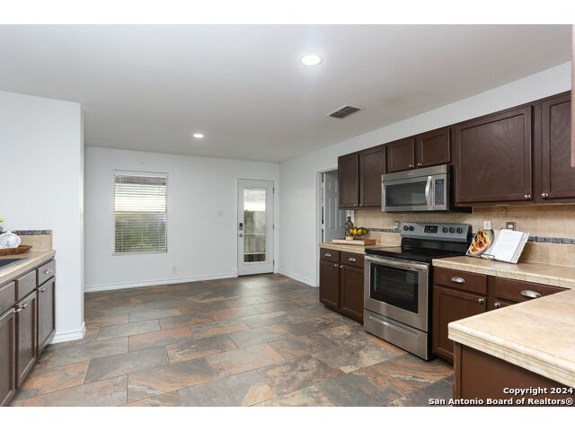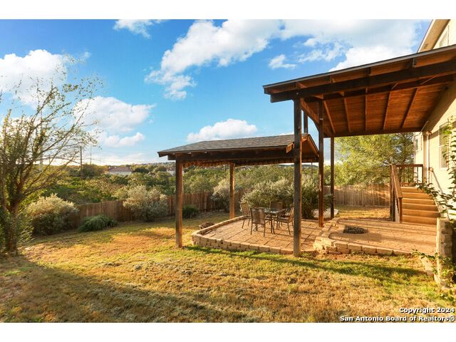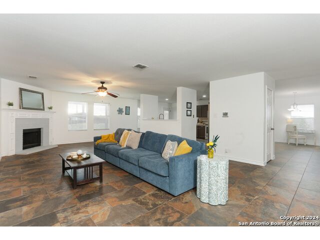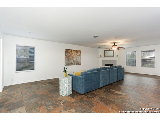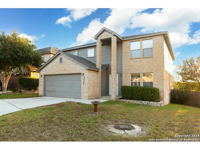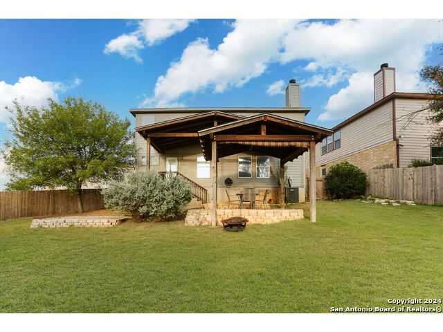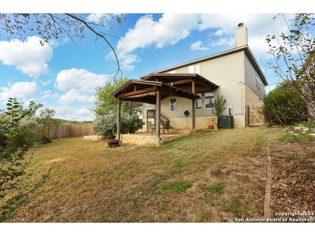 Discover your dream home at the end of a quiet cul-de-sac, backing onto a serene greenbelt. (New roof 2022) This spacious gem has it all, with three distinct living areas, offering space for everyone. Enter through the large formal living and dining room combination, where the open floor plan effortlessly leads into the kitchen with an eat-in dining area. The kitchen features sleek stainless steel appliances, tile countertops, and a coordinating tile backsplash. Enjoy durable, slate-look tile flooring throughout the downstairs, making cleaning a breeze. The kitchen flows into a large family room with a beautiful fireplace, creating a warm and inviting atmosphere. Upstairs, you'll find all bedrooms, including a versatile playroom that serves as the perfect space for family fun or relaxation. (All carpet replaced and interior paint October 2024) Step outside to your own private retreat! The large backyard, bordered by a tranquil greenbelt, offers a covered patio and an extended outdoor area, ideal for cooking, dining, and games. Zoned to the highly regarded Comal ISD, this home is less than a mile from Specht Elementary and conveniently assigned to Pieper High School. This home truly has it all-don't miss the opportunity to make it yours!