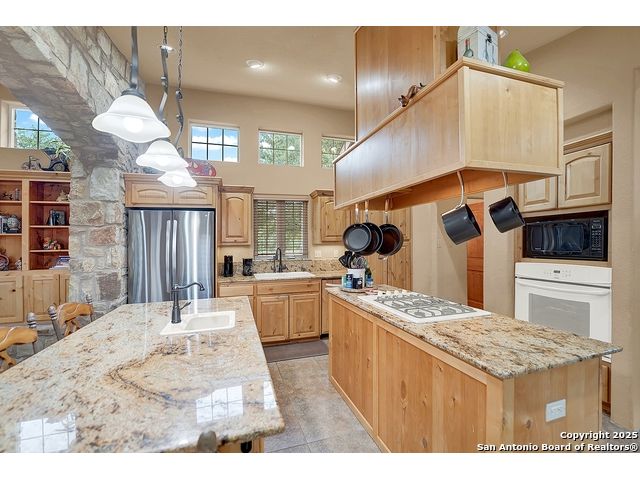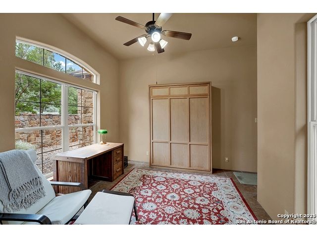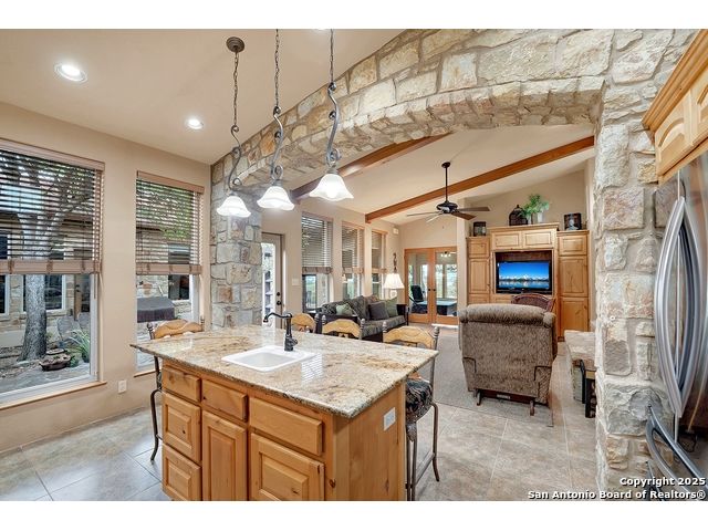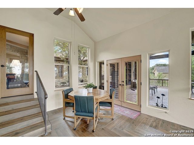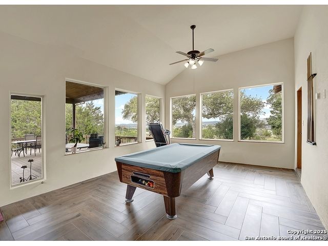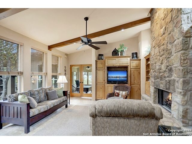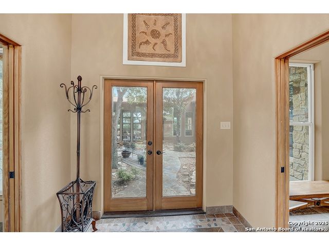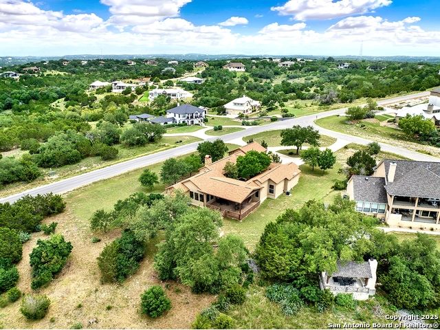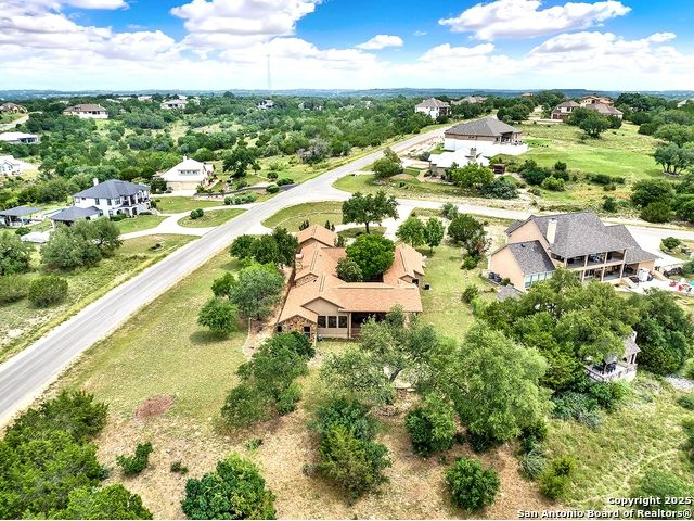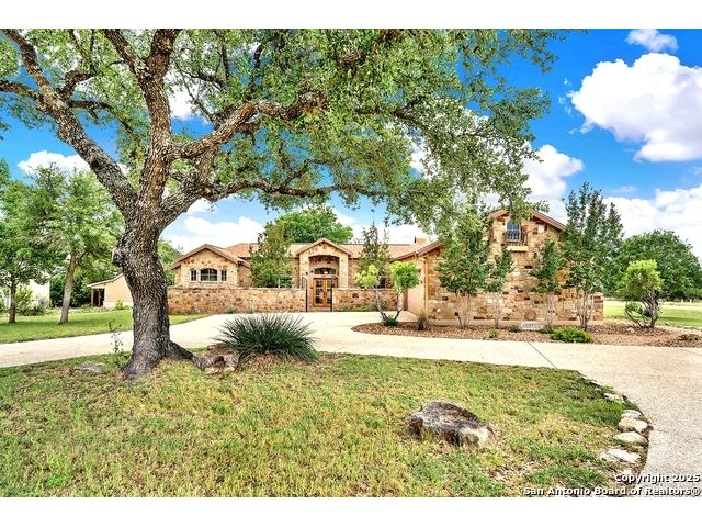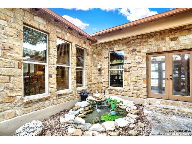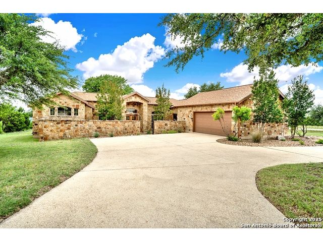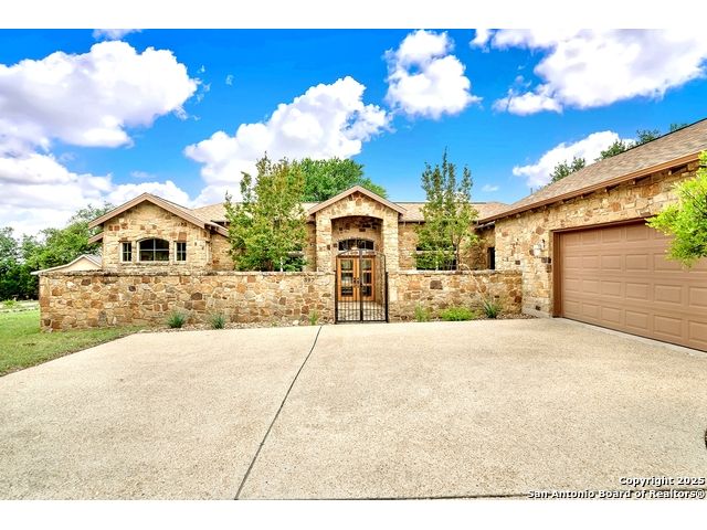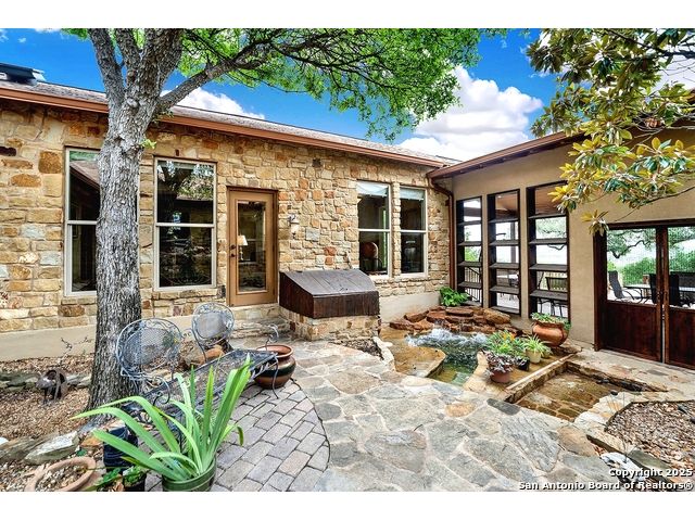 Welcome to 397 Secret Way, an exquisite Hill Country lake view retreat tucked inside the serene landscapes of Spring Branch, TX. Located just minutes from Rebecca Creek Elementary and boat ramp 23; this thoughtfully crafted, custom home offers 2,534 square feet of living space, showcasing a unique U-shaped design that gracefully wraps around a private central courtyard complete with waterfall hot tub, goldfish pond, and shade from a stately magnolia and graceful cedar elm. Access your own little slice of zen from anywhere in the home! Perfect for morning coffee, quiet moments, or entertaining under the stars. Step through the entry and be greeted by a gourmet kitchen featuring rustic stone finishes, natural wood cabinetry, and a spacious living room anchored by a stunning stone fireplace. Continuing on you will find the oversized game room featuring expansive windows overlooking the flawless Canyon Lake views as well as 2 additional rooms joined by a Jack and Jill bathroom. The primary suite is a true sanctuary with an attached office, a private flex room ideal as a nursery, home gym, or meditation space, and spa-like bath featuring a jetted soaking tub, dual vanities, and a dual-entry walk-in shower. His and hers closets with built in storage. Every space is infused with warm, organic textures and natural light. Step outside to discover a massive covered patio and outdoor living area that spills onto beautifully landscaped grounds, native stone paths, and unobstructed views of Canyon Lake and the Texas Hill Country beyond. This is more than a home. It's a peaceful retreat, perfectly positioned for both privacy and access to nature, recreation, and wine country.