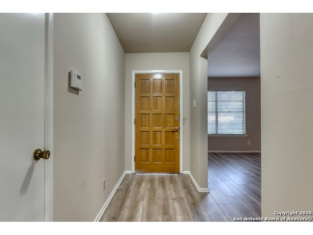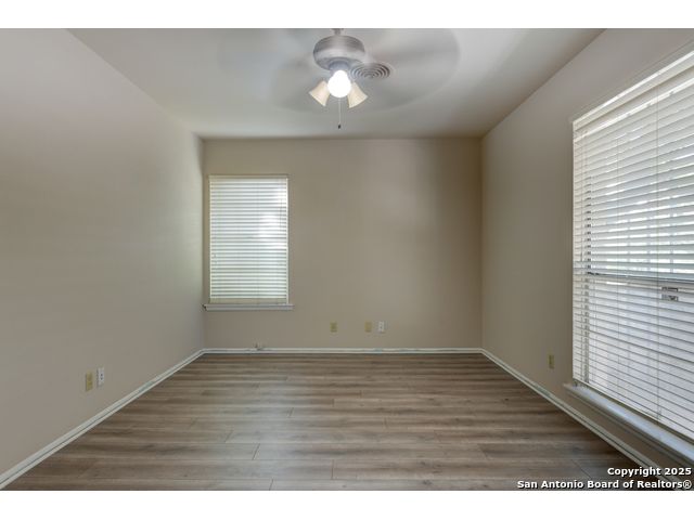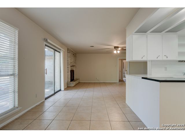 Shaded by mature oak trees and set back from the street, this charming single-story brick home offers a warm welcome with a traditional facade and inviting curb appeal. A two-car garage, large front yard, and covered entry porch provide a practical and comfortable introduction to the property. Step inside to discover a layout that balances function and comfort. To the left of the entry, you'll find the first living area, with the formal dining room beyond that, boasting chair rail molding and a formal chandelier. The spacious main living area at the back of the floorplan features a fireplace, tile flooring, and natural light to brighten the room. A sliding door leads to the backyard, offering a great indoor-outdoor connection. Just off the living space is the breakfast nook, which flows effortlessly into the kitchen. With crisp white cabinetry, a generous layout, a built-in oven, and a separate cooktop, the kitchen is both timeless and practical. The bedrooms are privately situated along a hallway, including a roomy primary suite with an en-suite bath and ample closet space. Secondary bedrooms share a full bath and provide flexibility for guest rooms, home offices, or hobby spaces. All bedrooms have newly replaced laminate wood flooring. Step into the backyard and enjoy a peaceful, tree-filled setting with plenty of space to play, garden, or relax. A spacious patio shaded by large oaks provides the perfect spot for outdoor dining or simply enjoying the breeze. The generous yard is fully fenced, offering both privacy and space to spread out. Located near the airport, you'll have easy access to all that San Antonio has to offer and beyond. "Please be aware some photos have been virtually staged."