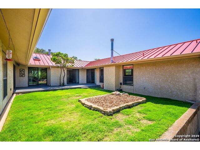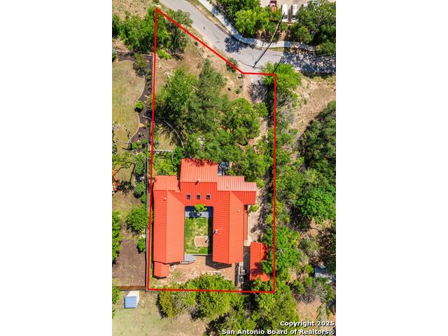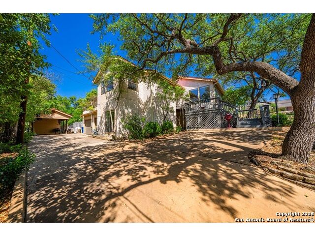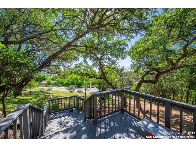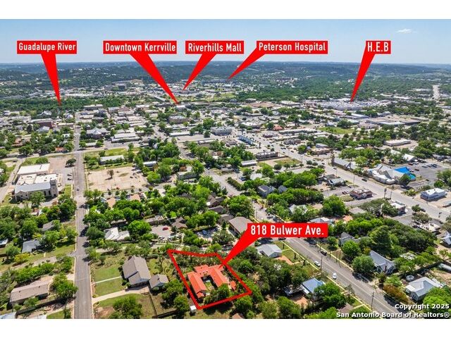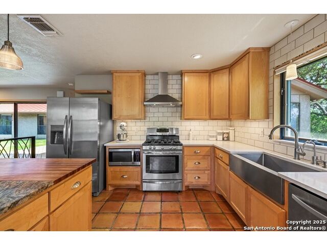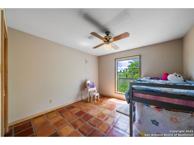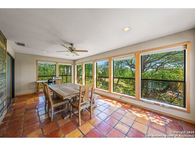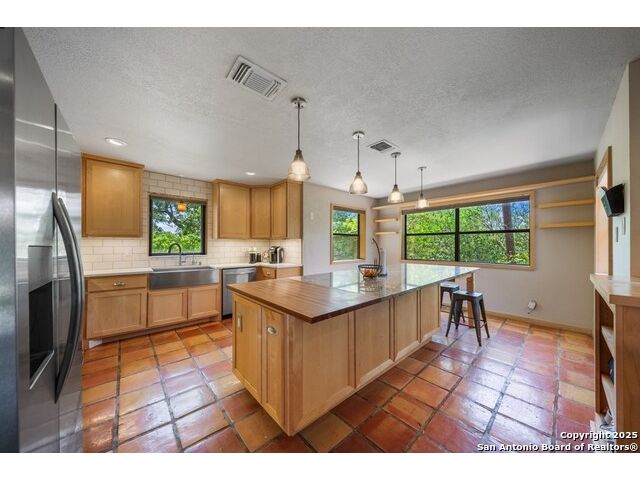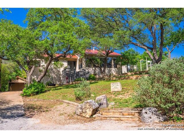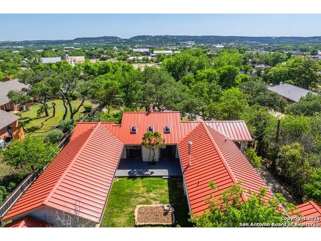 This charming hillside home feels like your own tree house, and is just five blocks from the Guadalupe River and downtown Kerrville! Inside features Saltillo tile throughout and a beautifully remodeled kitchen with quartz counters, Shaker-style soft-close cabinets, gas stove, farmhouse sink, and a large island with Copper Canyon granite, butcher block, and seating for six. The living room has vaulted ceilings, a Vermont Castings wood stove, and opens to a sunny front room with big double-paned windows and views of town. Built in a U-shape, the home wraps around a peaceful back patio, with freshly planted SOD. Also outside is a fenced area for a garden & hobby shed. There's also a wet bar with granite counter and built-in wine fridge for entertaining. The primary suite includes vaulted ceilings, another wood stove, walk-in closet, claw-foot tub with custom stained-glass window, and walk-in shower. The east wing has three guest bedrooms, a full remodeled bath, dining room, and a large storage closet. Downstairs features a bonus room being utilized as a gym with a sink & wall unit. Also additionally a hobby room perfect for a multitude of things. Lots to see, lots of storage areas!