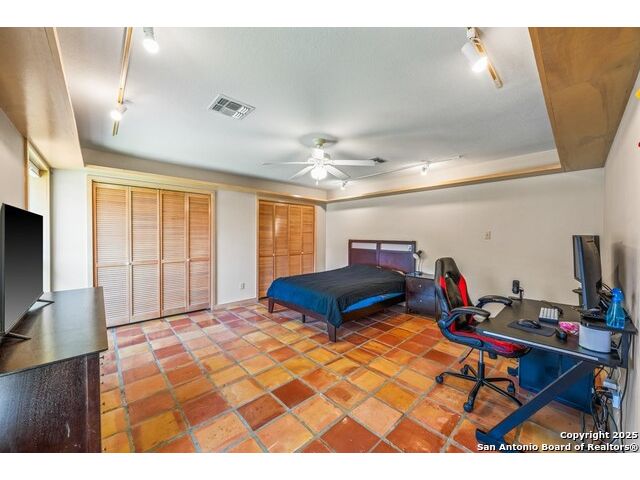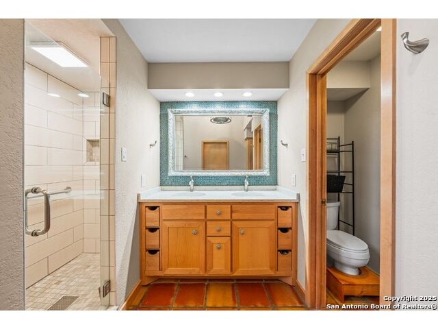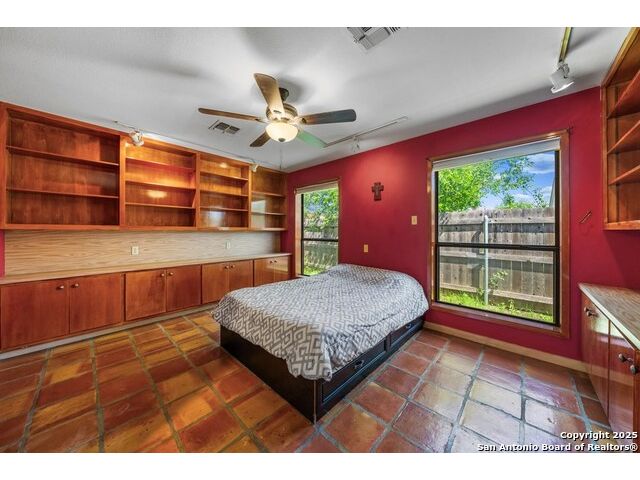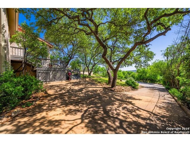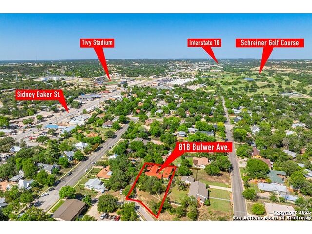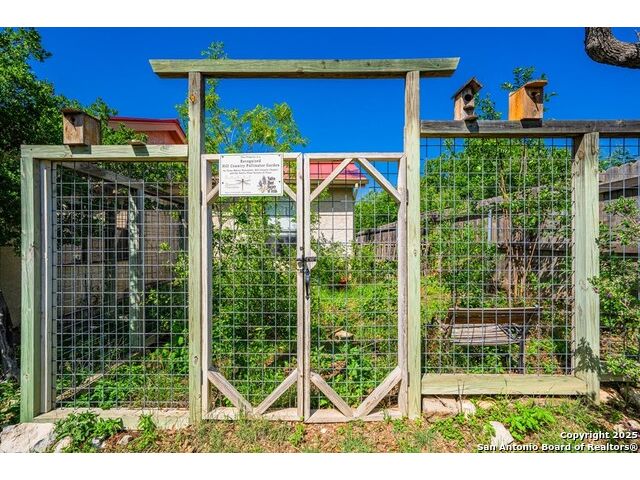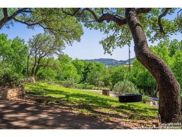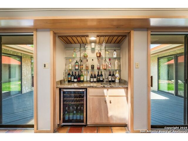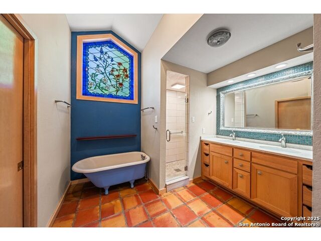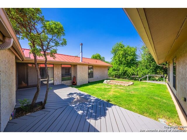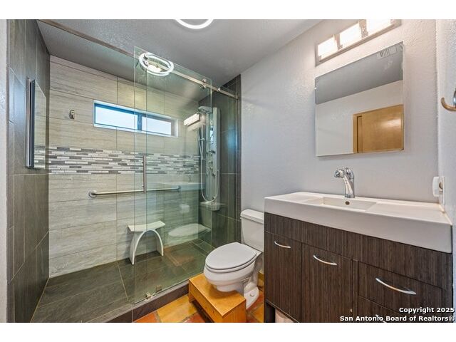 This charming hillside home feels like your own tree house, and is just five blocks from the Guadalupe River and downtown Kerrville! Inside features Saltillo tile throughout and a beautifully remodeled kitchen with quartz counters, Shaker-style soft-close cabinets, gas stove, farmhouse sink, and a large island with Copper Canyon granite, butcher block, and seating for six. The living room has vaulted ceilings, a Vermont Castings wood stove, and opens to a sunny front room with big double-paned windows and views of town. Built in a U-shape, the home wraps around a peaceful back patio, with freshly planted SOD. Also outside is a fenced area for a garden & hobby shed. There's also a wet bar with granite counter and built-in wine fridge for entertaining. The primary suite includes vaulted ceilings, another wood stove, walk-in closet, claw-foot tub with custom stained-glass window, and walk-in shower. The east wing has three guest bedrooms, a full remodeled bath, dining room, and a large storage closet. Downstairs features a bonus room being utilized as a gym with a sink & wall unit. Also additionally a hobby room perfect for a multitude of things. Lots to see, lots of storage areas!
