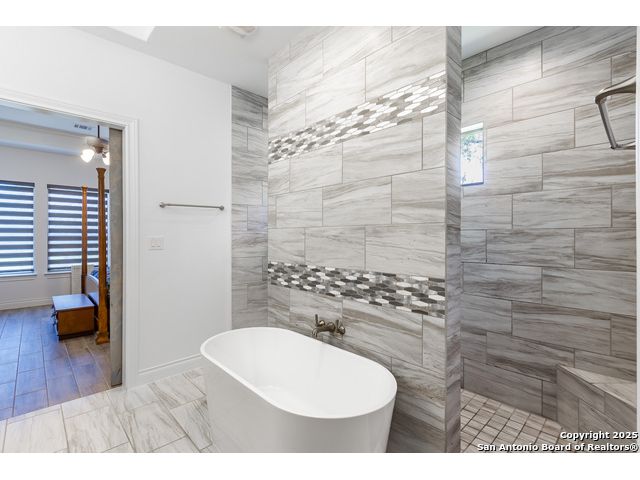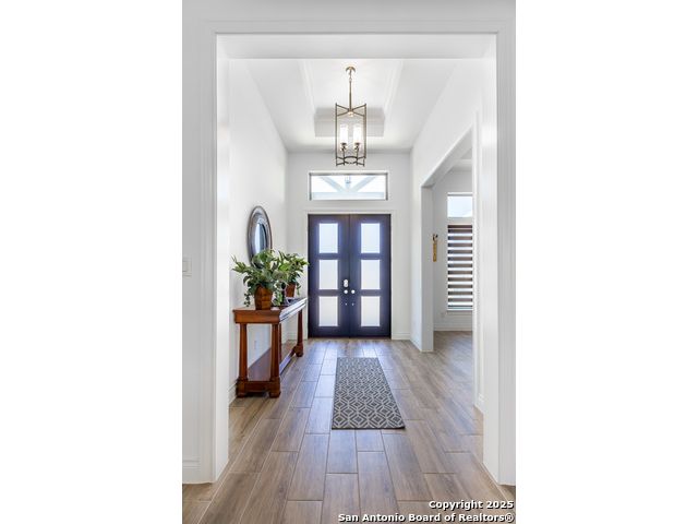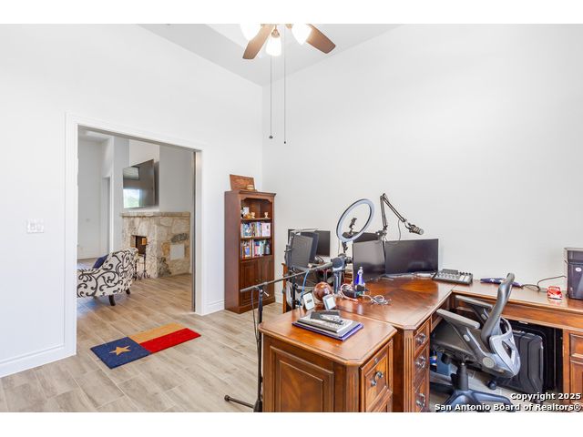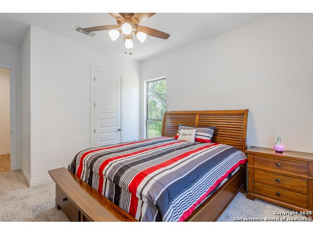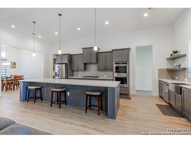 Enjoy quiet country living in the premier community of Belle Oaks ~ just over 3000 sq ft of living space - this 4 bedroom 3.1 bath is ready for your family! The home sits on a treelined 1.14 acre lot on a quiet cul-de-sac. The flowing and functional floorplan offers 20 ft ceilings, several large windows and a spacious open island to the living room. The kitchen is a chef's dream with Kitchen AID appliances including GAS RANGE, double convection wall ovens,and the microwave also functions as a 3rd oven! Surrounded by quartz counters, plenty of cabinets including a butler pantry area and a 8x4 walk in pantry! Living room offers a stone wood burning fireplace with gas starter. Flat Screen above the FP will convey! Wood look tile t/o the home! Study off the living area has barn doors for extra privacy when needed. Home is equipt and ready with CAT 6 network connections t/o for your work and entertainment needs! CUSTOM ELECTRIC BLINDS WITH REMOTES! Floorplan offers ultimate privacy with the owners retreat, second suite, and bedrooms 3&4 all on opposite corners of the home. Owners bath with huge car wash shower, dual shower heads + rainfall shower head, and a soaking tub. Barn doors from the bath/bedroom. Enjoy entertaining on the covered patio open to your private yard with mature oaks. Oversized 3 car garage was extended - 32x24 ~ for the ability for larger vehicles and still have the ability for storage. Plumbed for water softner. Large laundry room and separate drop zone to store coats and bags out of site. Belle Oaks offers a community pool, park, pickleball and sports courts as well as nature trails. This gated community offers NATURAL GAS, and is located in close proximity to shopping and schools as well as easy travels to SA, Boerne, Fredricksburg wine country! Top rated Smithson Valley Schools ~ COMAL ISD!