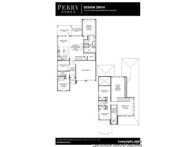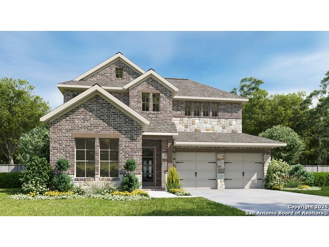 Home office with French doors set at two-story entry. Two-story family room with wall of windows opens to kitchen and dining area. Kitchen hosts inviting island with built-in seating space and 5-burner gas cooktop. First-floor primary suite includes dual vanities, garden tub, separate glass-enclosed shower and large walk-in closet in primary bath. A second bedroom is downstairs. Two secondary bedrooms and a game room are upstairs. Extended covered backyard patio and 5-zone sprinkler system. Two-car garage.